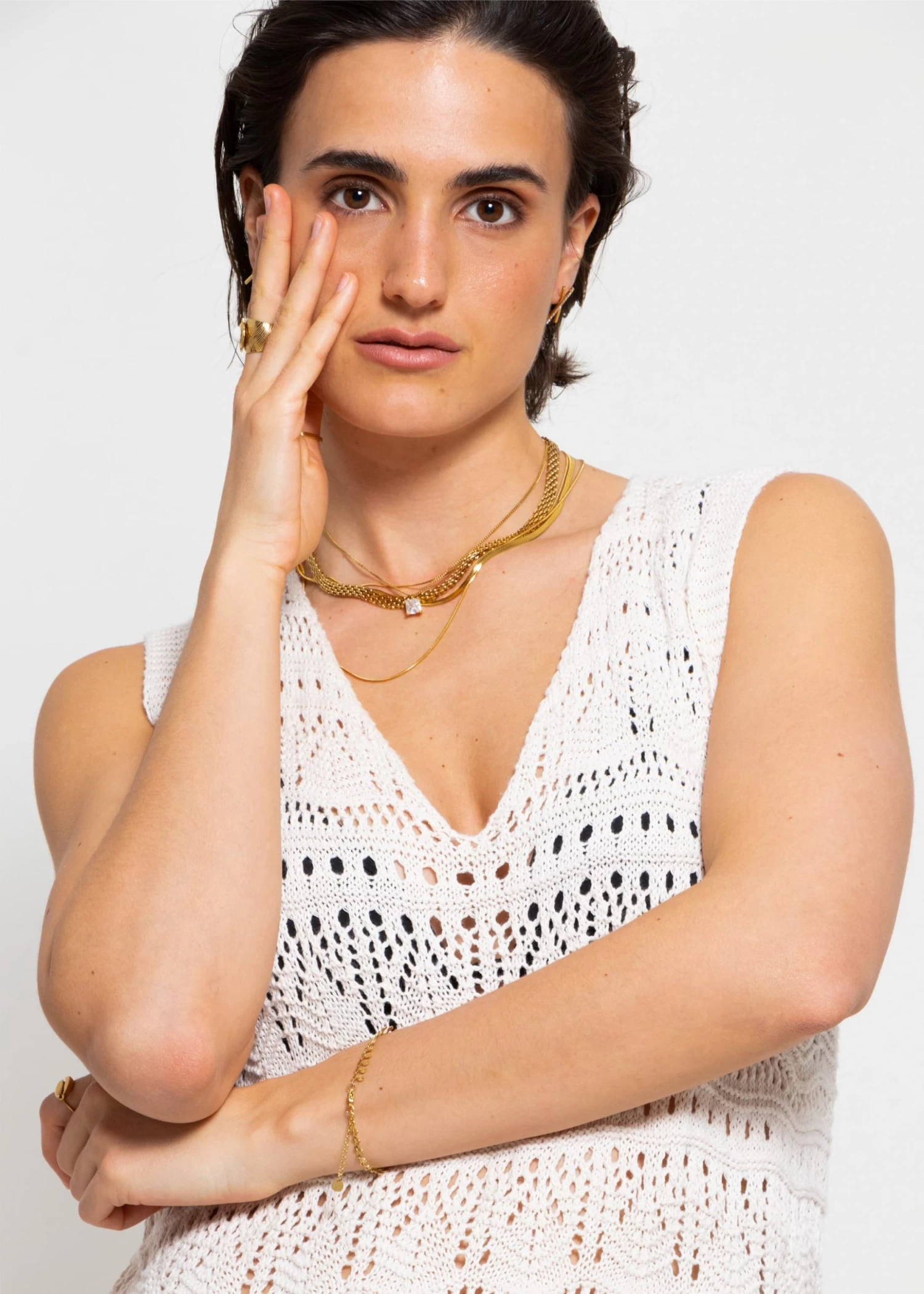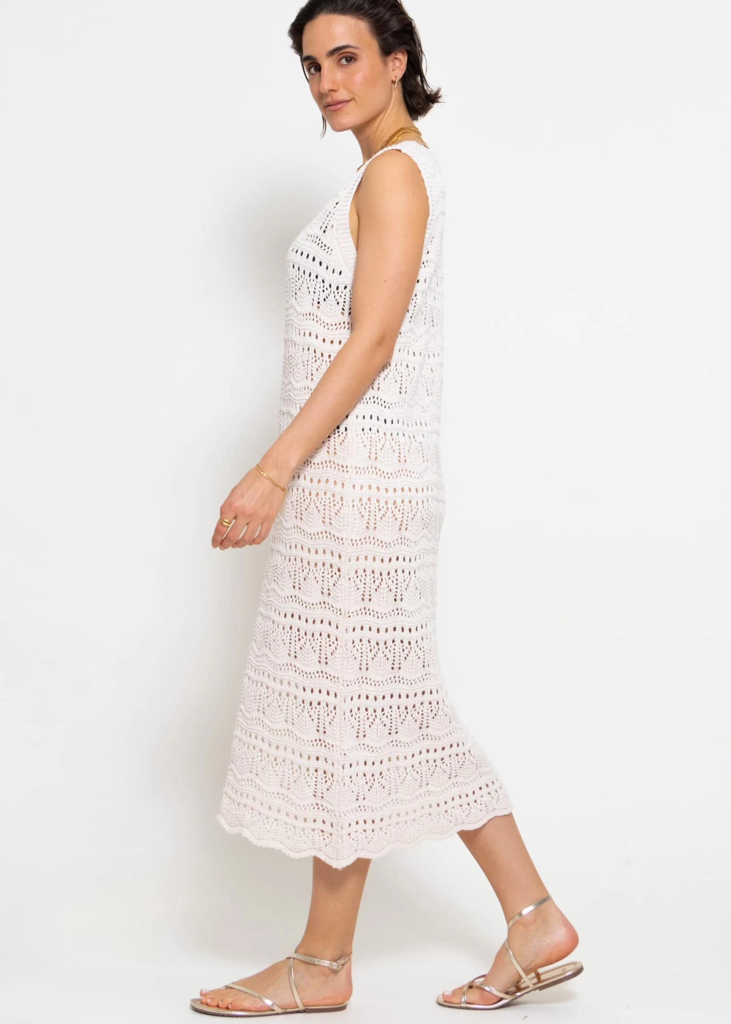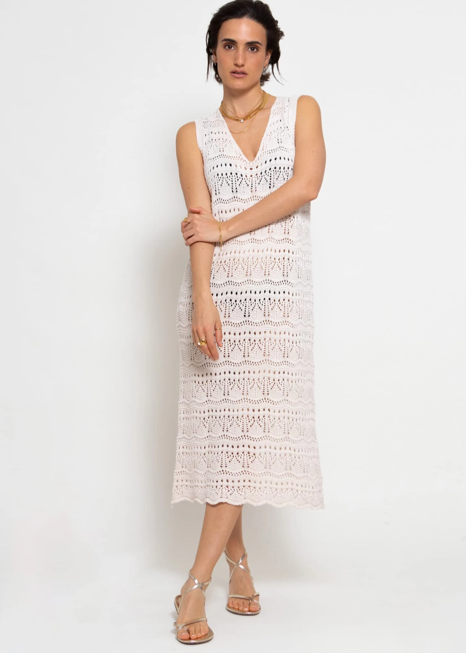 Dieses ärmellose Strickkleid in klassischem Beige ist ein echter Hingucker für jede Gelegenheit. Aus einem angenehmen Baumwollgemisch gefertigt, bietet es eine attraktive Kombination aus Eleganz und Komfort. Der kunstvolle Lochstrick erzeugt eine raffinierte Transparenz, die dem Kleid einen Hauch von Verspieltheit verleiht. Der V-Ausschnitt betont das Dekolleté, während der fließende, knöchellange Schnitt eine schmeichelhafte Silhouette zaubert. Das Kleid lässt sich vielseitig kombinieren – lässig mit Sandalen für einen sommerlichen Tagesausflug oder mit High Heels und Accessoires für einen eleganten Abendlook.