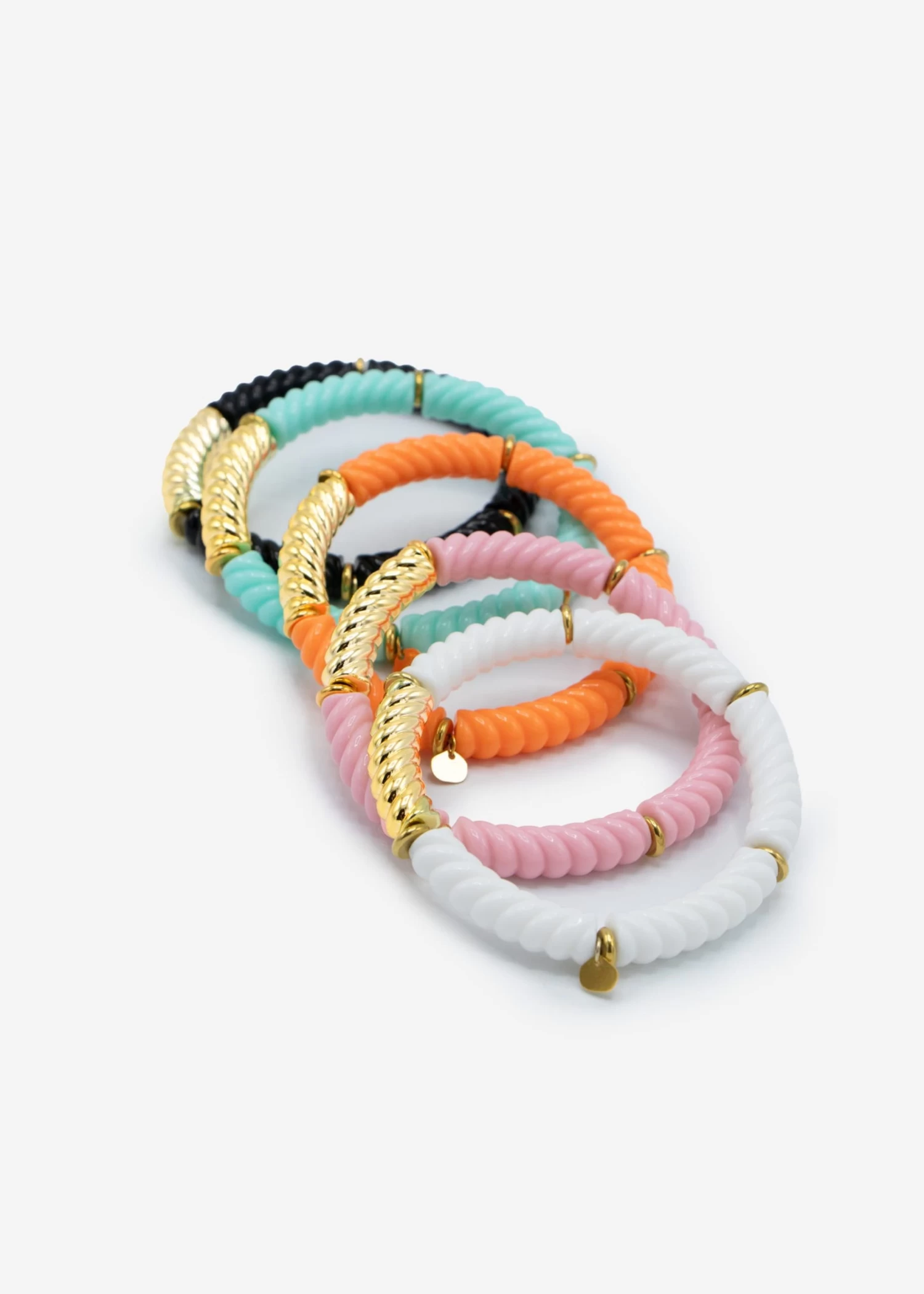 Entdecke den perfekten Mix aus Stil und Komfort mit diesem flexiblen Armband. Im Mittelpunkt steht das spiralförmige, goldfarbige Schmuckglied, das als auffälliger Blickfang dient und dem Design eine luxuriöse Note verleiht. Kleine metallische Zierelemente sind zwischen den farbigen Segmenten verteilt und schaffen ein ansprechendes Muster, das Eleganz und Modernität ausstrahlt. Dank des elastischen Bandes passt sich das Armband bequem an verschiedene Handgelenkgrößen an und lässt sich problemlos An- und Ausziehen.