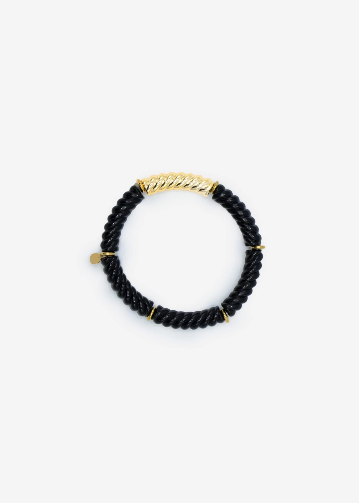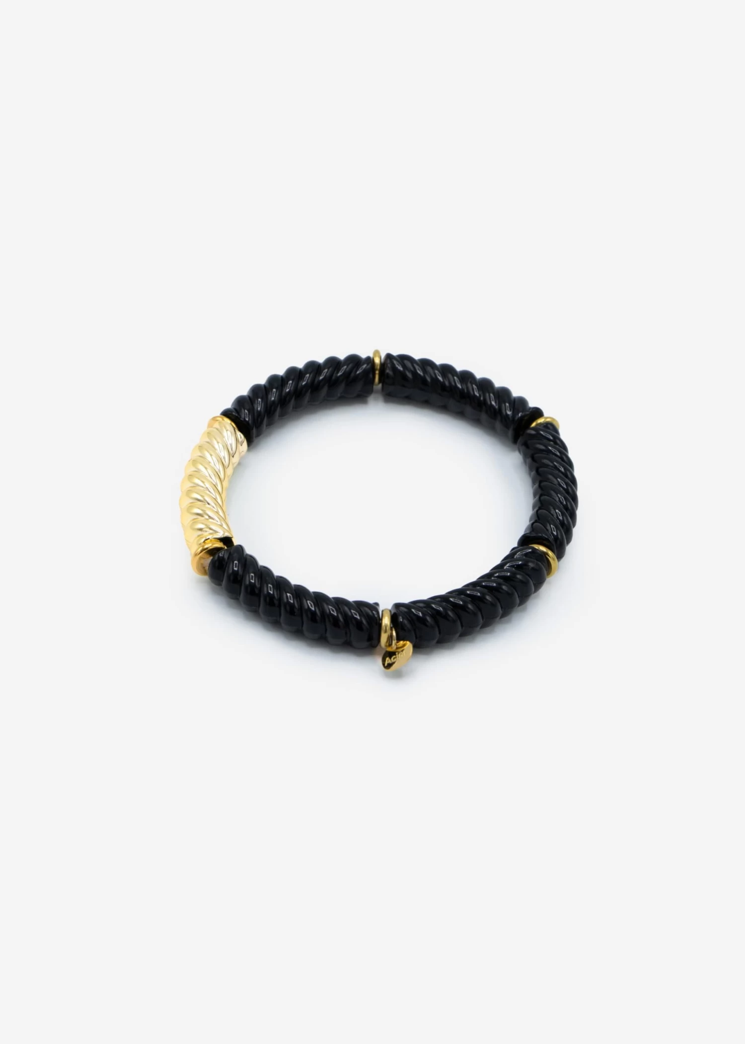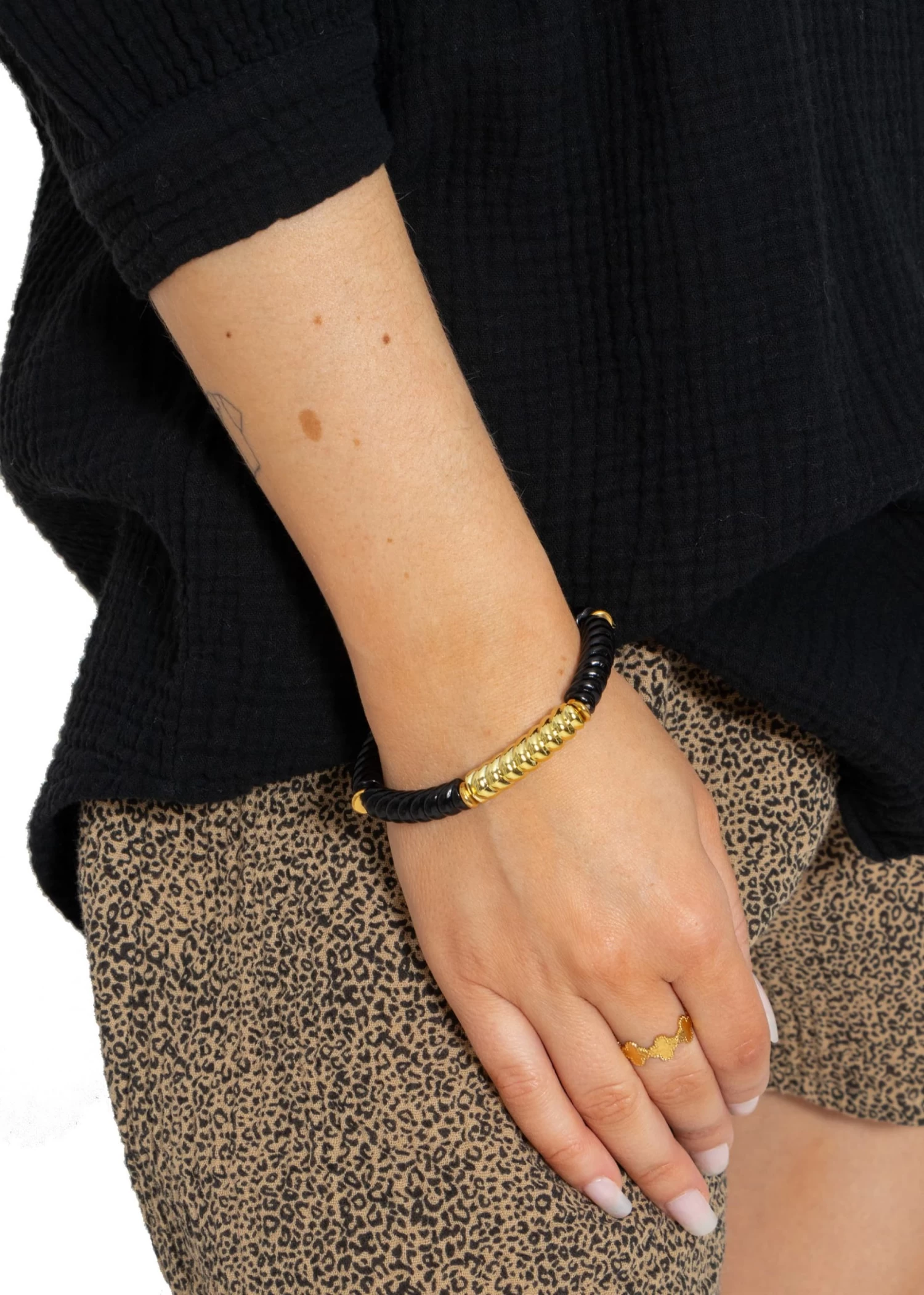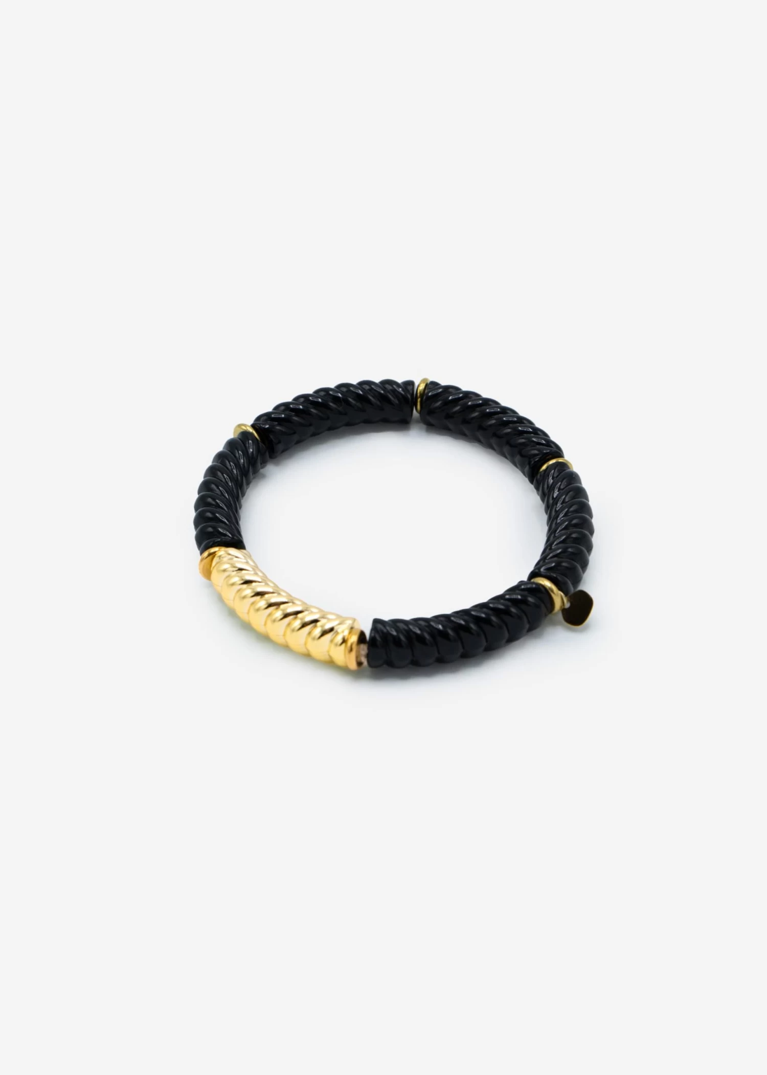 Entdecke den perfekten Mix aus Stil und Komfort mit diesem flexiblen Armband. Im Mittelpunkt steht das spiralförmige, goldfarbige Schmuckglied, das als auffälliger Blickfang dient und dem Design eine luxuriöse Note verleiht. Kleine metallische Zierelemente sind zwischen den farbigen Segmenten verteilt und schaffen ein ansprechendes Muster, das Eleganz und Modernität ausstrahlt. Dank des elastischen Bandes passt sich das Armband bequem an verschiedene Handgelenkgrößen an und lässt sich problemlos An- und Ausziehen.