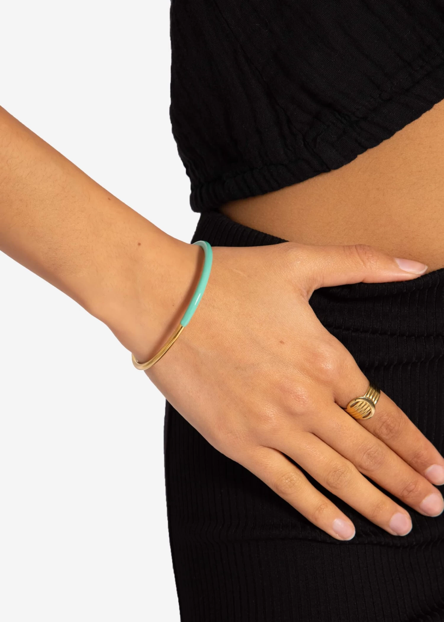 Dieser Armreif ist ein stilvolles Accessoire, das sowohl elegant als auch robust ist. Das Schmuckstück besticht durch sein einzigartiges Design, das zur Hälfte aus farbenfrohem Emaille und zur anderen Hälfte aus goldfarbenem Edelstahl besteht. Ob allein oder in Kombination mit anderen Armbändern, dieser Statement-Armreif schmückt dein Handgelenk und rundet dein Outfit perfekt ab.