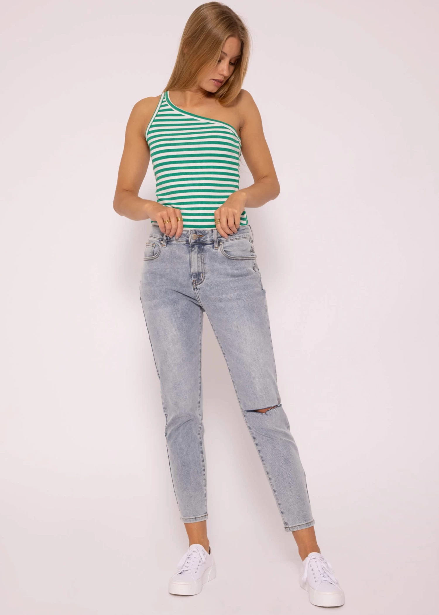 Dieses gestreifte Top in Grün/Weiß präsentiert sich sportiv sowie modern und ist damit ein unverzichtbarer Klassiker für deine Garderobe. Es verfügt über ein ärmelloses Design, eine enganliegende Passform sowie eine gerade Saumlinie. Der asymmetrische Ausschnittverlauf mit einer Seite schulterfrei und der anderen Seite mit Träger verleiht dem Modell Raffinesse. Das gerippte Top zeigt sich aufgrund seines zeitlosen Streifendesigns im Stil eines französischen It-Piece. Es wurde in Italien aus einem Viskosegemisch gefertigt und trägt sich dadurch besonders weich auf der Haut. Style es mit einer weiten High-Waist Leinenhose und passenden Accessoires für den perfekten Sommerlook.