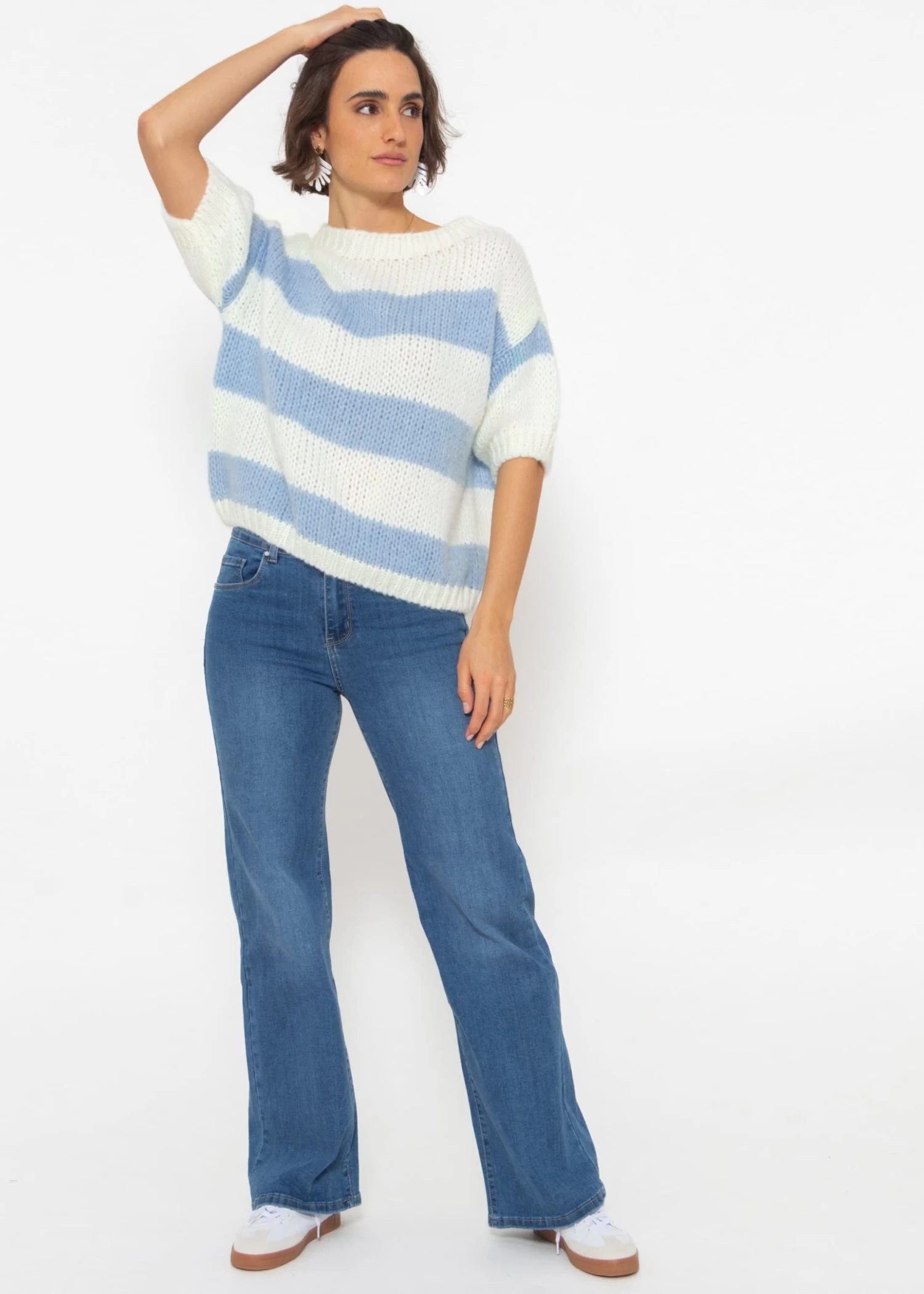 Diese angesagte Jeans vereint Komfort mit modernem Design. Ausgestattet mit einem praktischen Knopf- und Reißverschluss, sowie Gürtelschlaufen, präsentiert sie sich im klassischen 5-Pocket-Stil. Der Mid-Waist Schnitt sorgt für eine schmeichelhafte Figur, während das ausgestellte Bein und die lockere Passform Bewegungsfreiheit garantieren. Gefertigt aus einem hochwertigen, elastischen Baumwollgemisch, bietet diese Jeans ein weiches Tragegefühl und eine optimale Passform, die sich den ganzen Tag über angenehm anfühlt. Ihre lässige Eleganz macht sie zum idealen Begleiter für schöne Oversize Pullover oder Tops, wodurch vielseitige Looks für jede Gelegenheit kreiert werden können.
