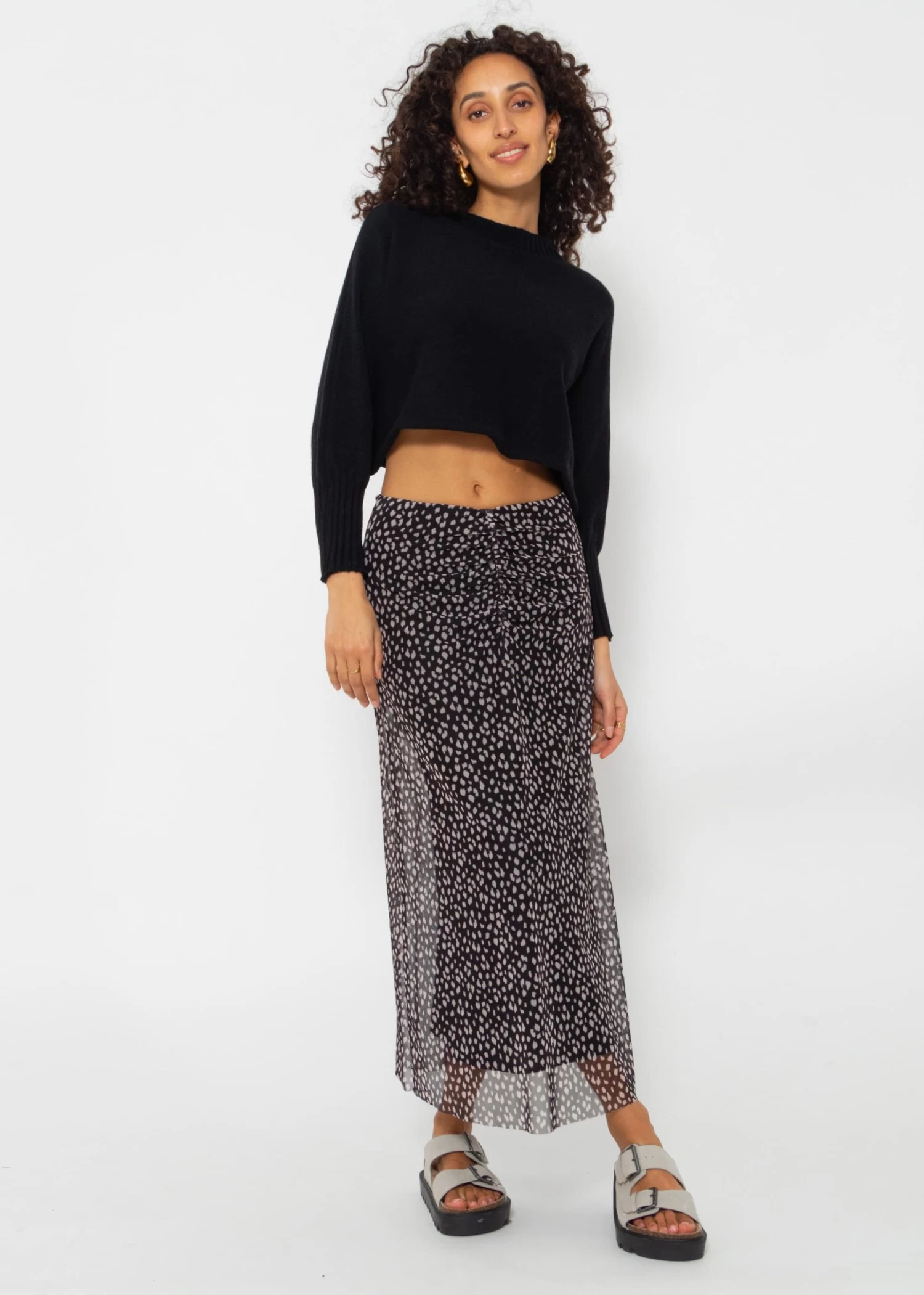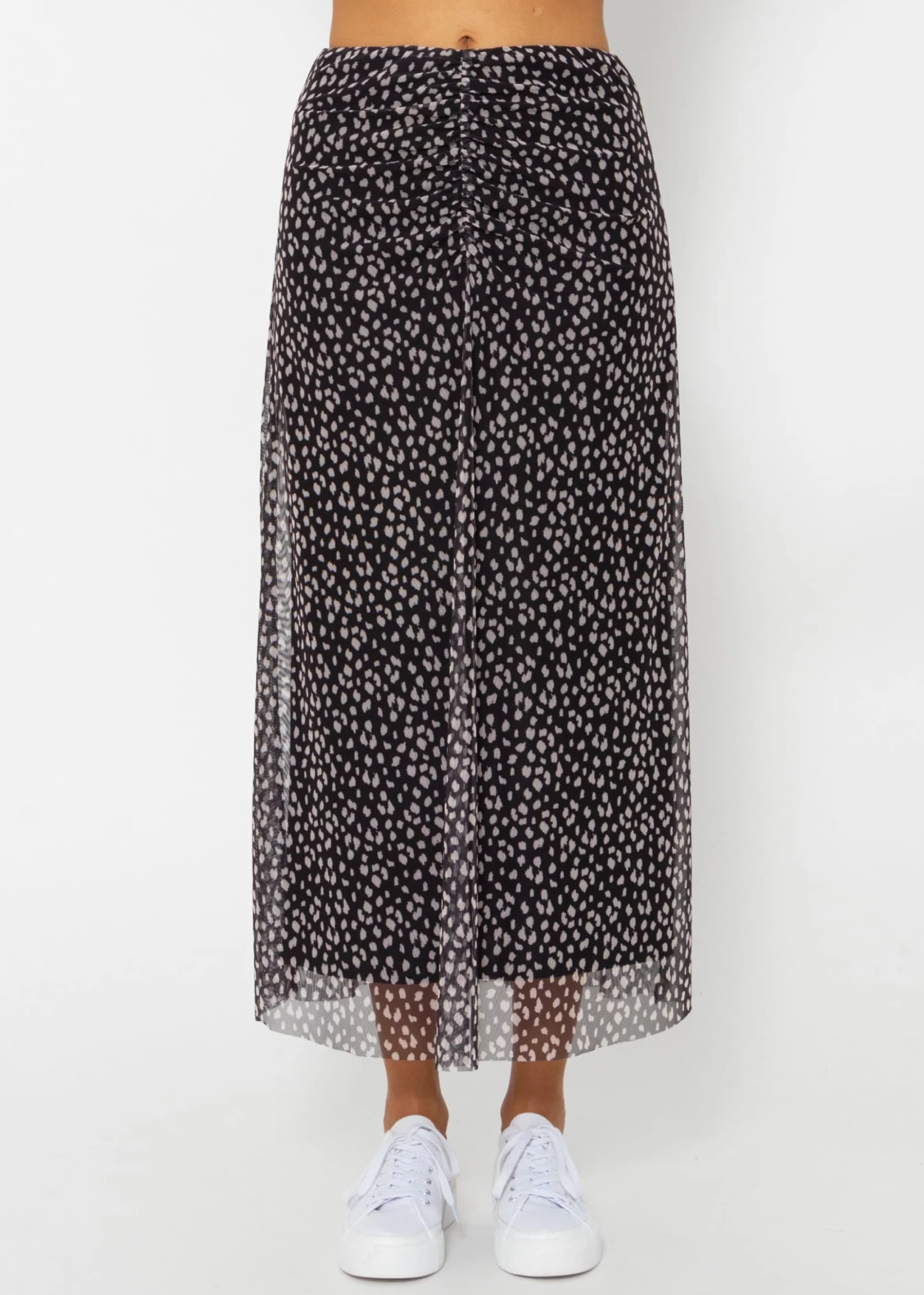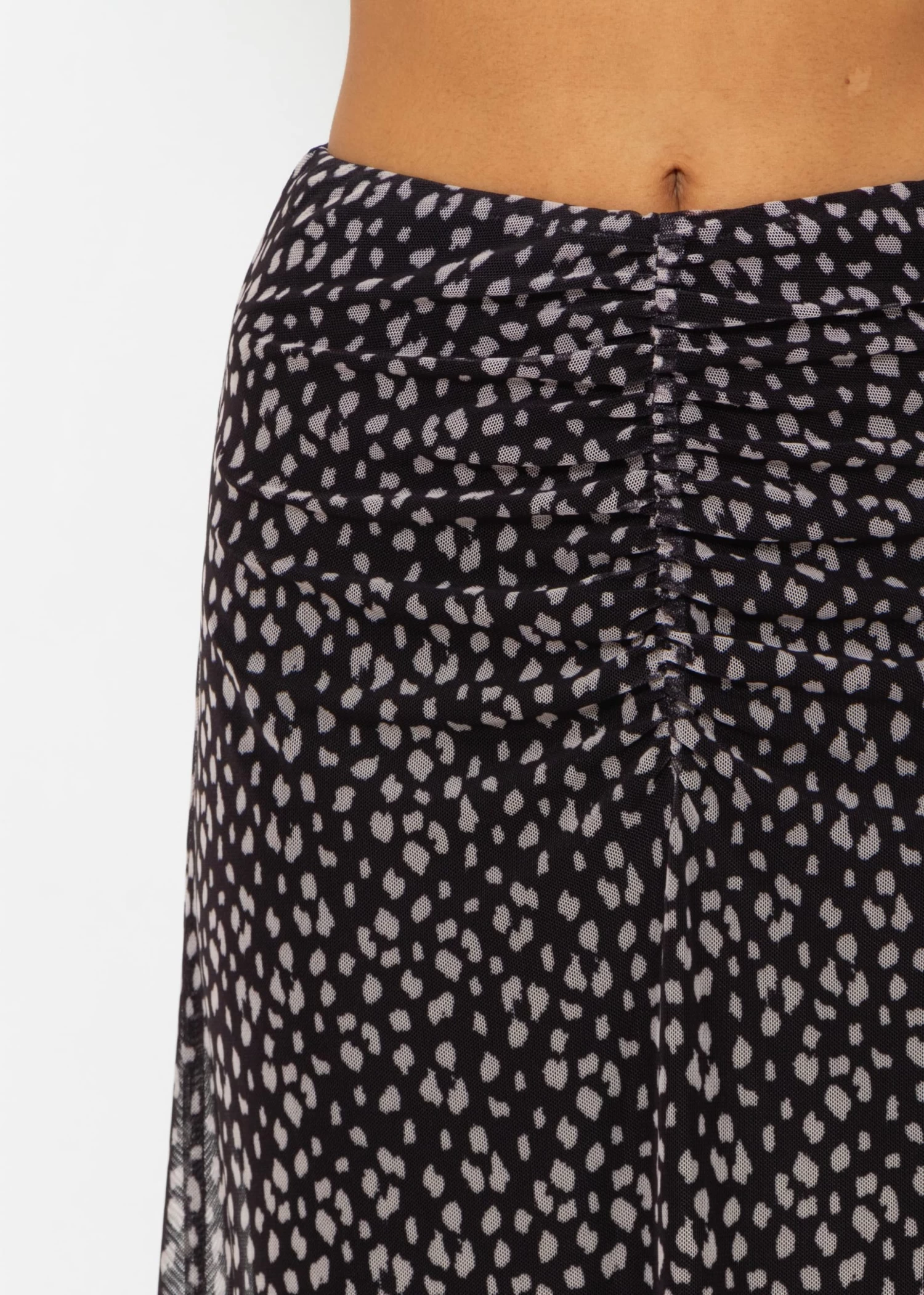 Dieser fließende Midirock ist ein elegantes Kleidungsstück, das sich durch sein charmantes Tupfenmuster auszeichnet. Das Modell besitzt einen hohen, dehnbaren Bund, um eine bequeme und flexible Passform zu gewährleisten. Das Mesh-Material sorgt für Leichtigkeit und einen Hauch von Verspieltheit. Auf der Vorderseite befindet sich eine mittige Drapierung, die dir eine besonders schöne Silhouette zaubert. Dieser Rock kann mit einem einfachen Top für einen Alltagslook oder mit dem dazu passenden Meche Langarmshirt für einen dramatischen Effekt kombiniert werden. Der Rock ist gefüttert.