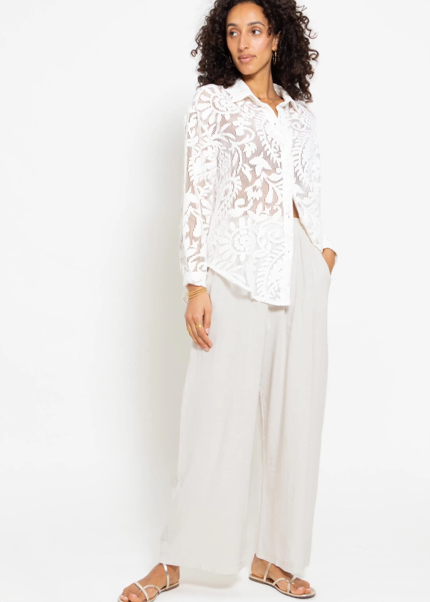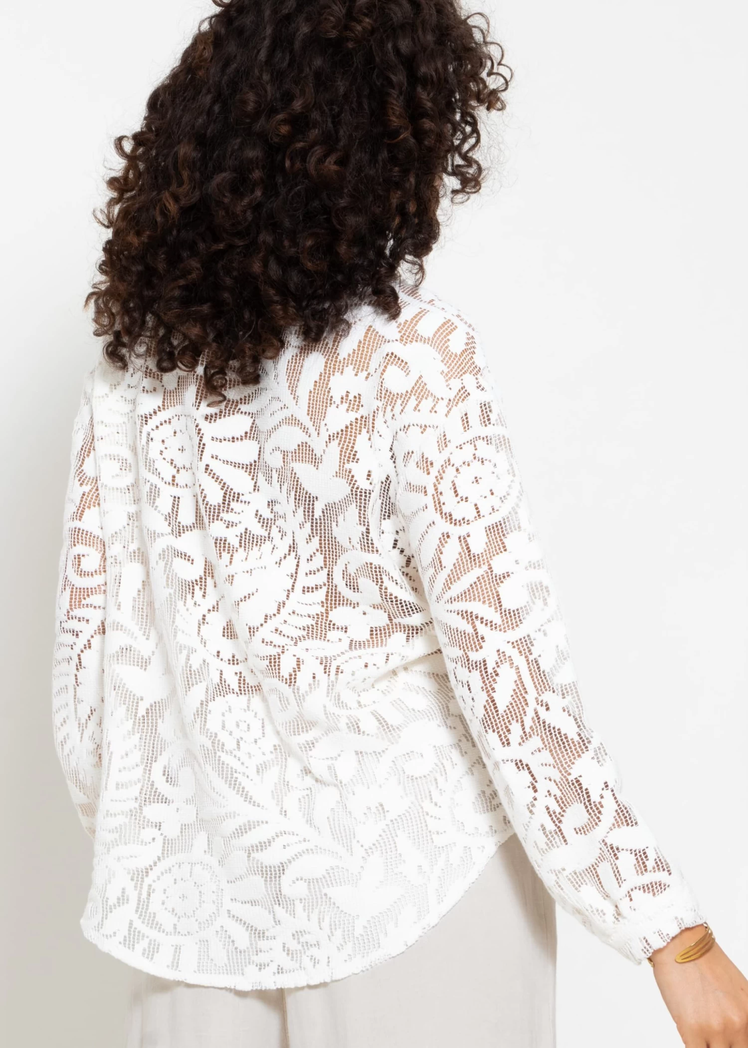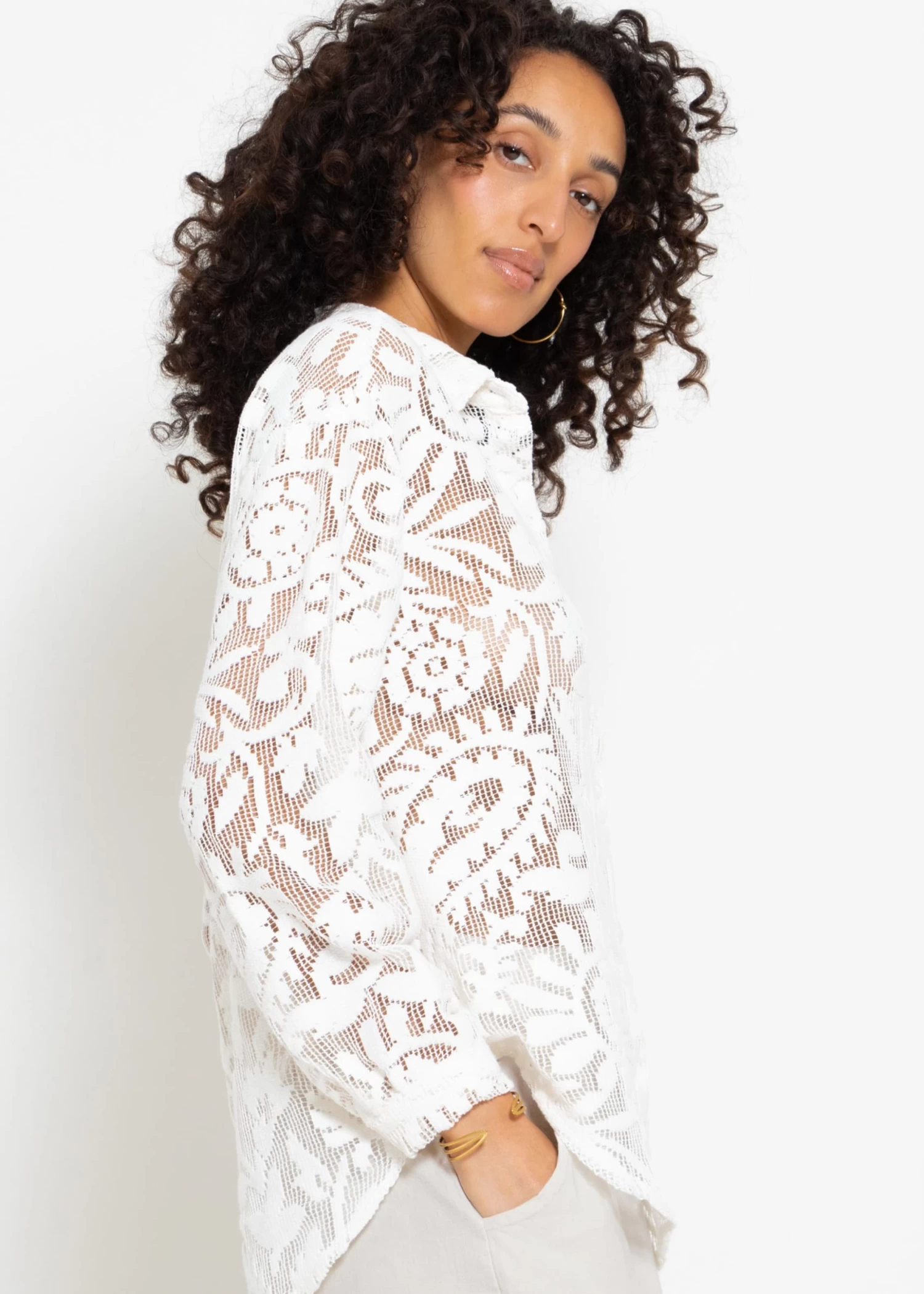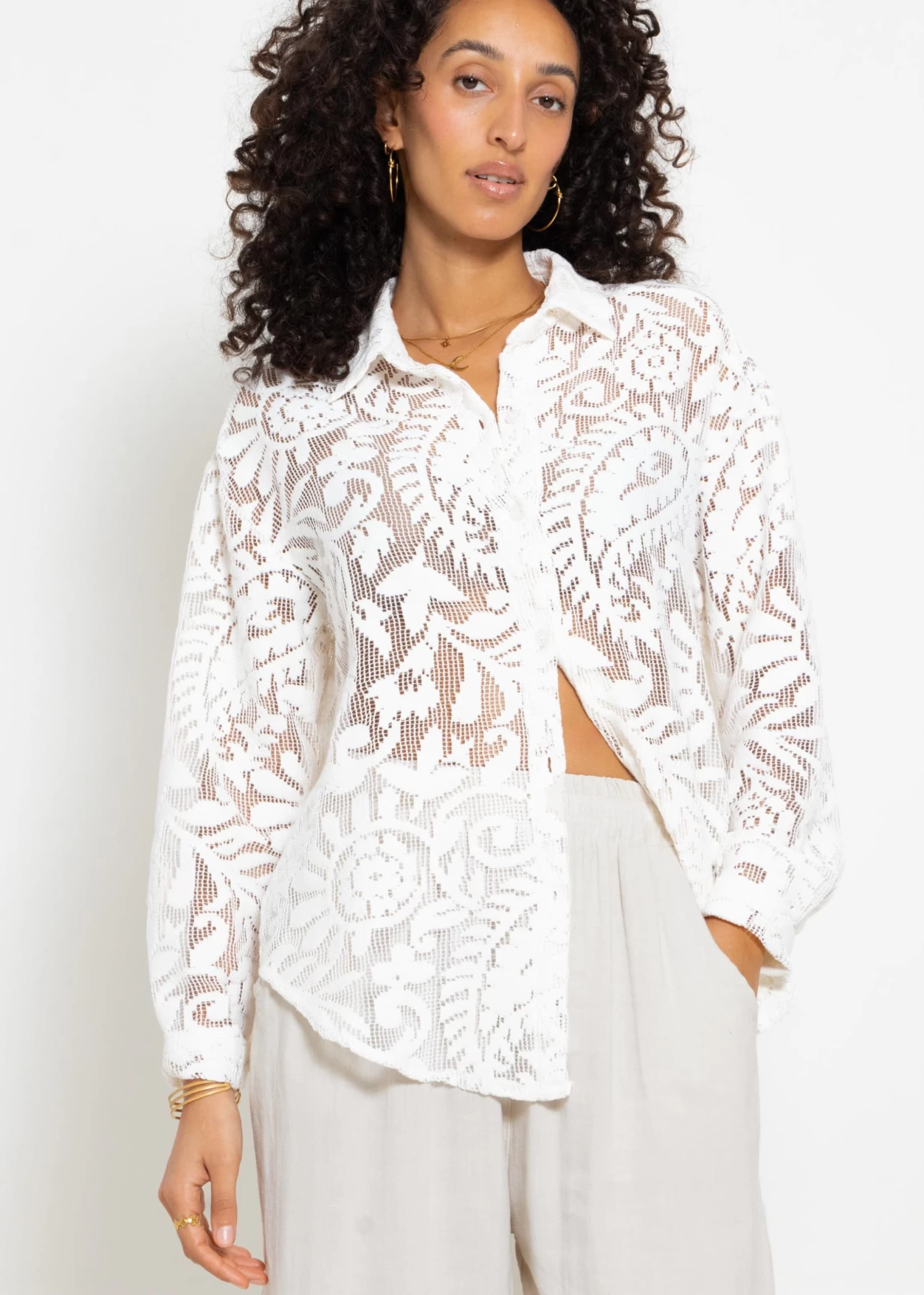 Diese luftige, elegante Bluse ist aus einem leichten Stoff gefertigt, der mit einer kunstvollen, ausgeschnittenen Stickerei verziert ist, die für eine subtile Transparenz sorgt. Der klassische Kragen und die durchgehende Knopfleiste unterstreichen den klassischen Stil, während die langen Ärmel mit Manschetten das charmante Design abrunden. Das Modell präsentiert sich in einem lockeren Schnitt, der für eine entspannte Silhouette sorgt. Ob locker über einer schlichten Hose getragen oder für einen formelleren Anlass zugeknöpft, diese Bluse ist ein vielseitiges Kleidungsstück, das sowohl Komfort als auch Boho-Chic ausstrahlt.