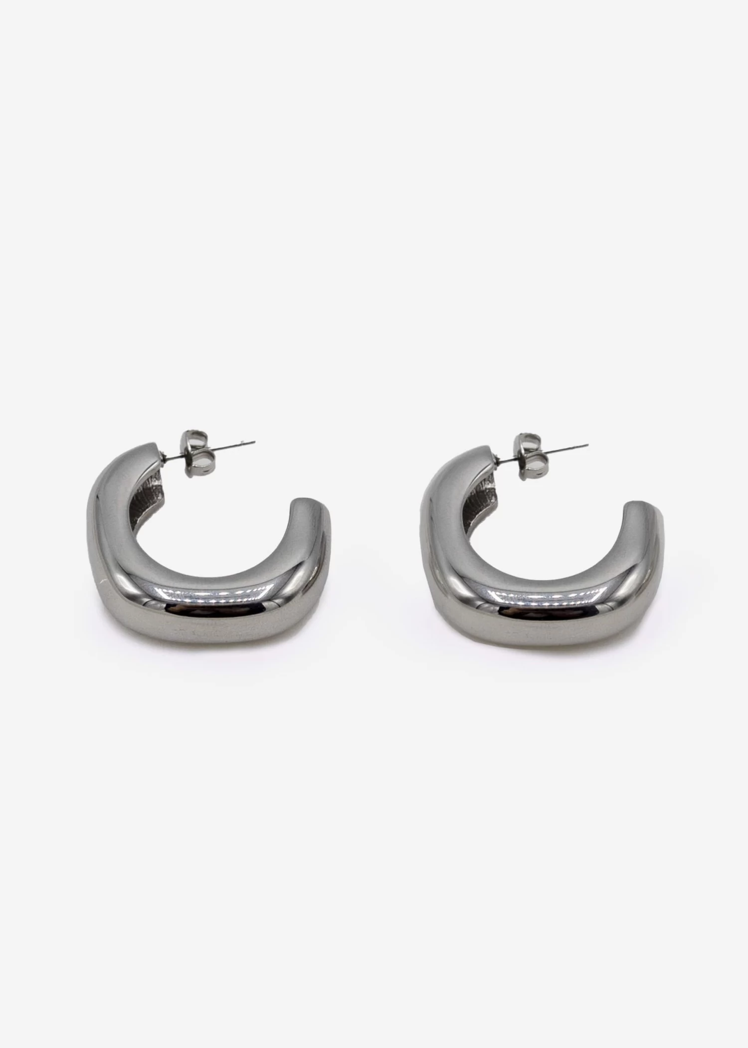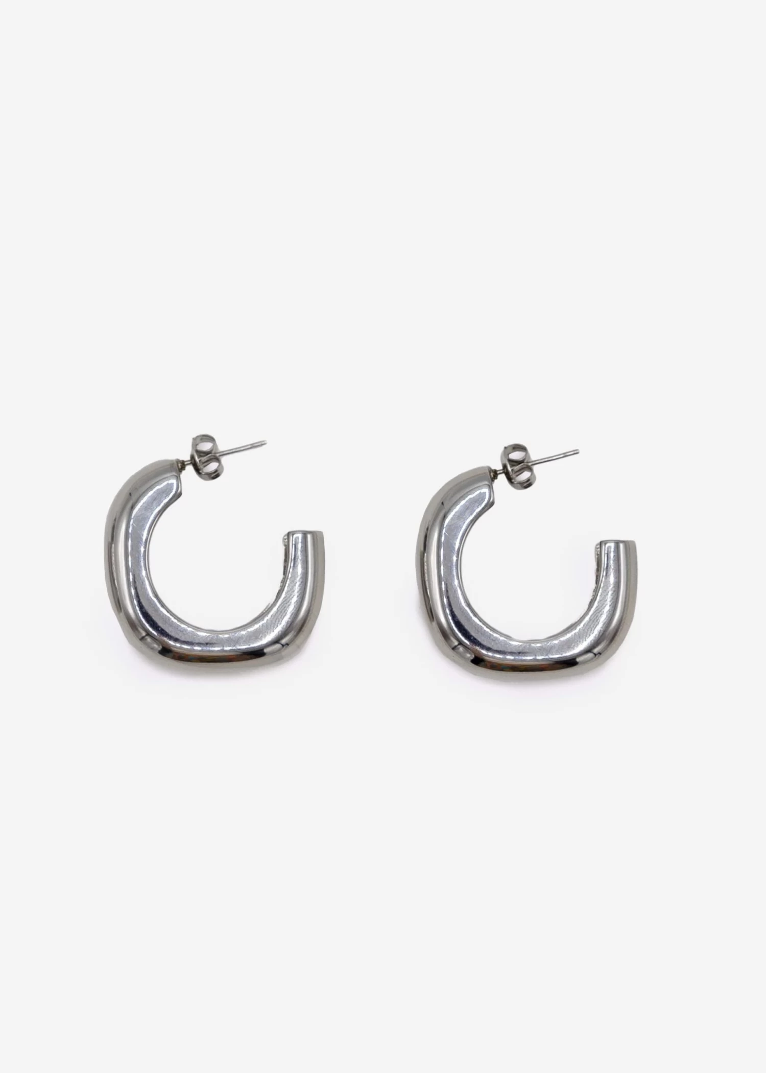 Diese Creolen sind aus Edelstahl gefertigt und daher waterproof. Das markante leicht eckige Design kommt mit Steckverschluss.