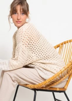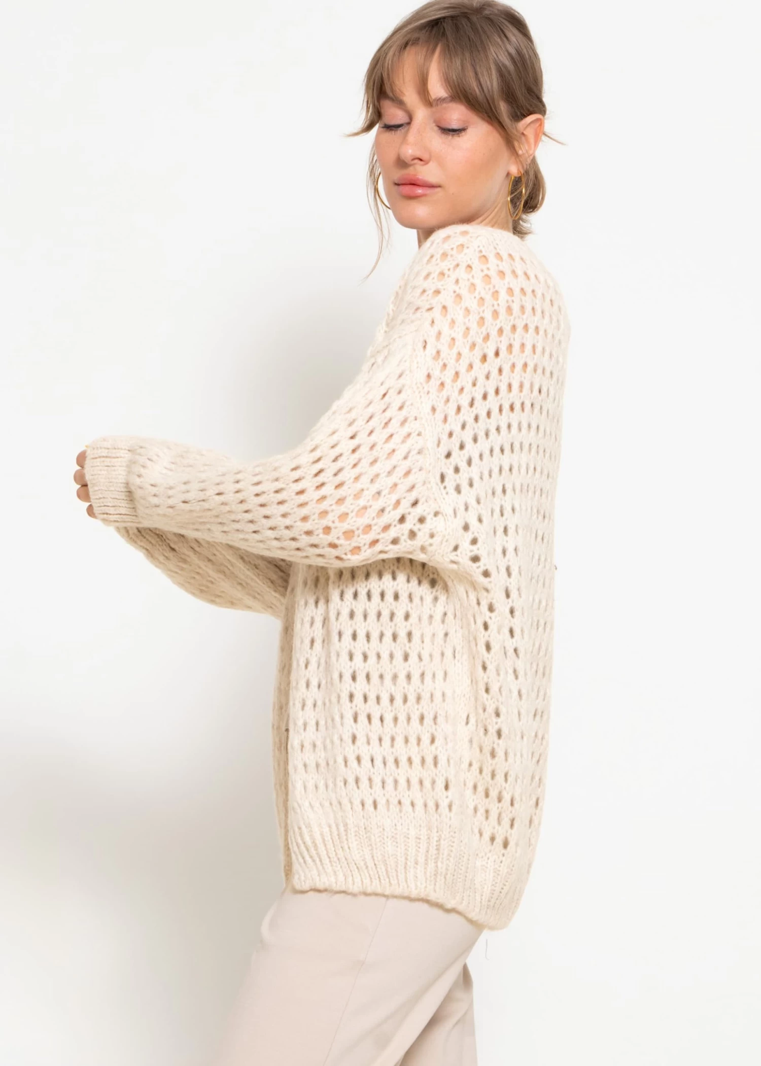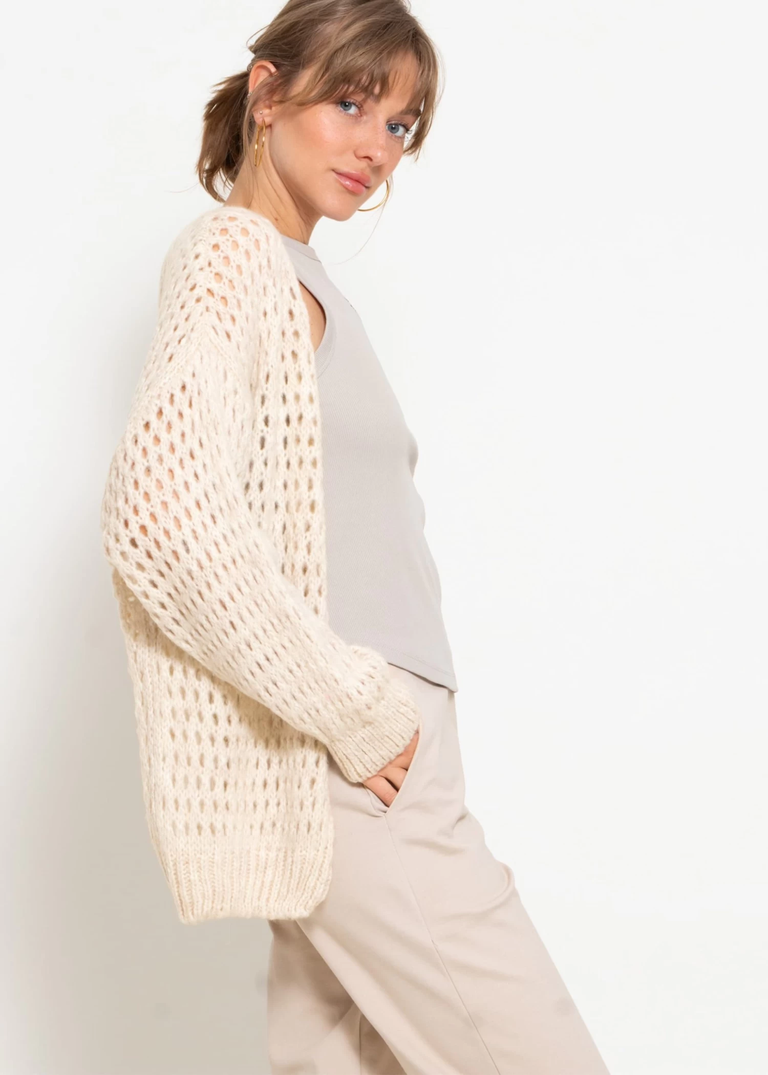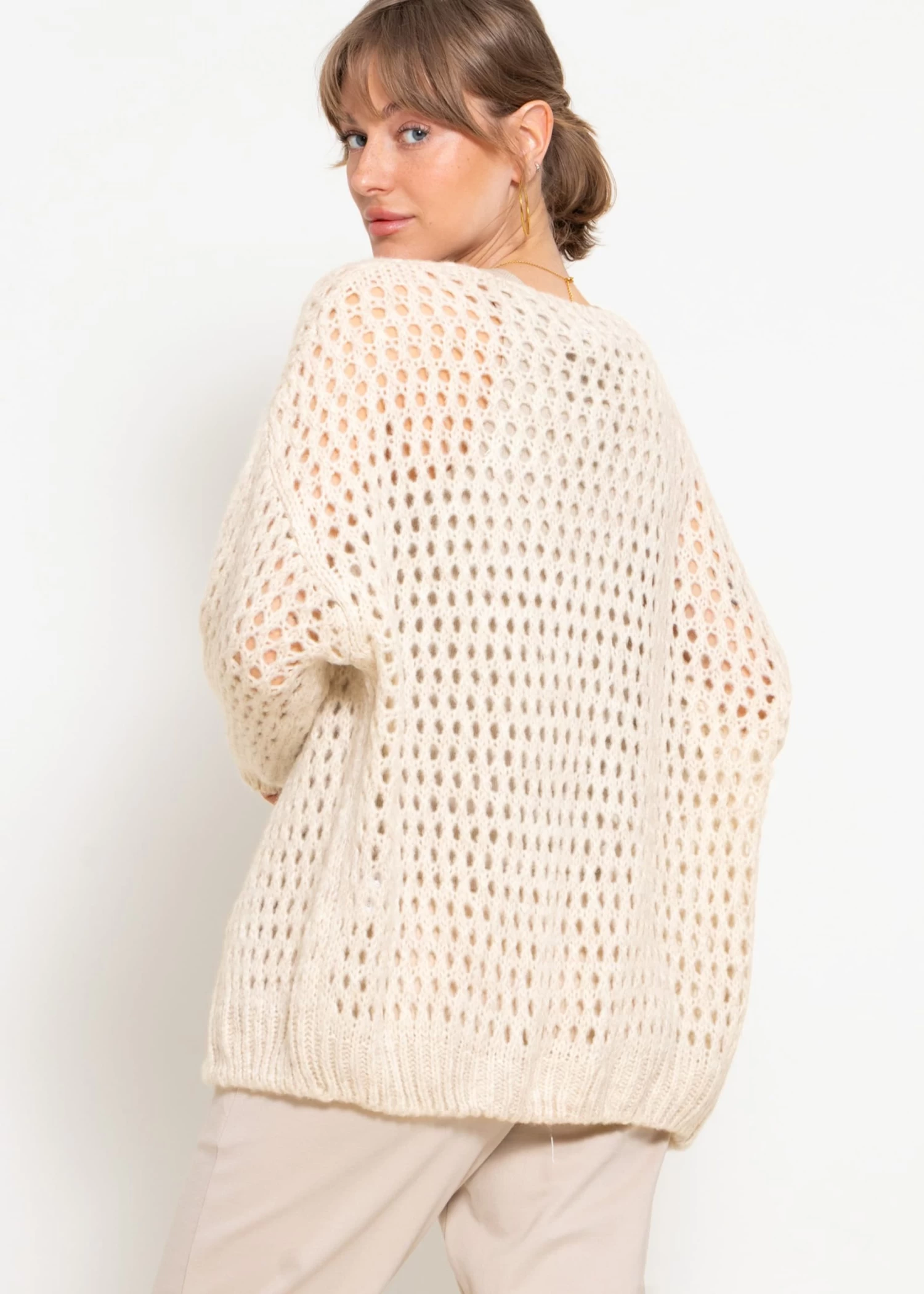 Diese Oversize Strickjacke ist aus einem weichen, leichten Garn gefertigt, das für ein angenehmes Tragegefühl sorgt. Die offene Vorderseite lädt zum lässigen Drapieren ein, die weiten Ärmel bieten zusätzliche Bewegungsfreiheit. Das Design besitzt überschnittene Schultern, die den lässigen Schnitt unterstreichen und eine zeitgemäße Silhouette schaffen, die sowohl zu taillierten Hosen als auch zu weiten Röcken passt. Das einzigartige Lochmuster verleiht dem Modell eine spielerische und zugleich elegante Note. Rippbündchen und ein gerippter Saum runden das Design gekonnt ab.