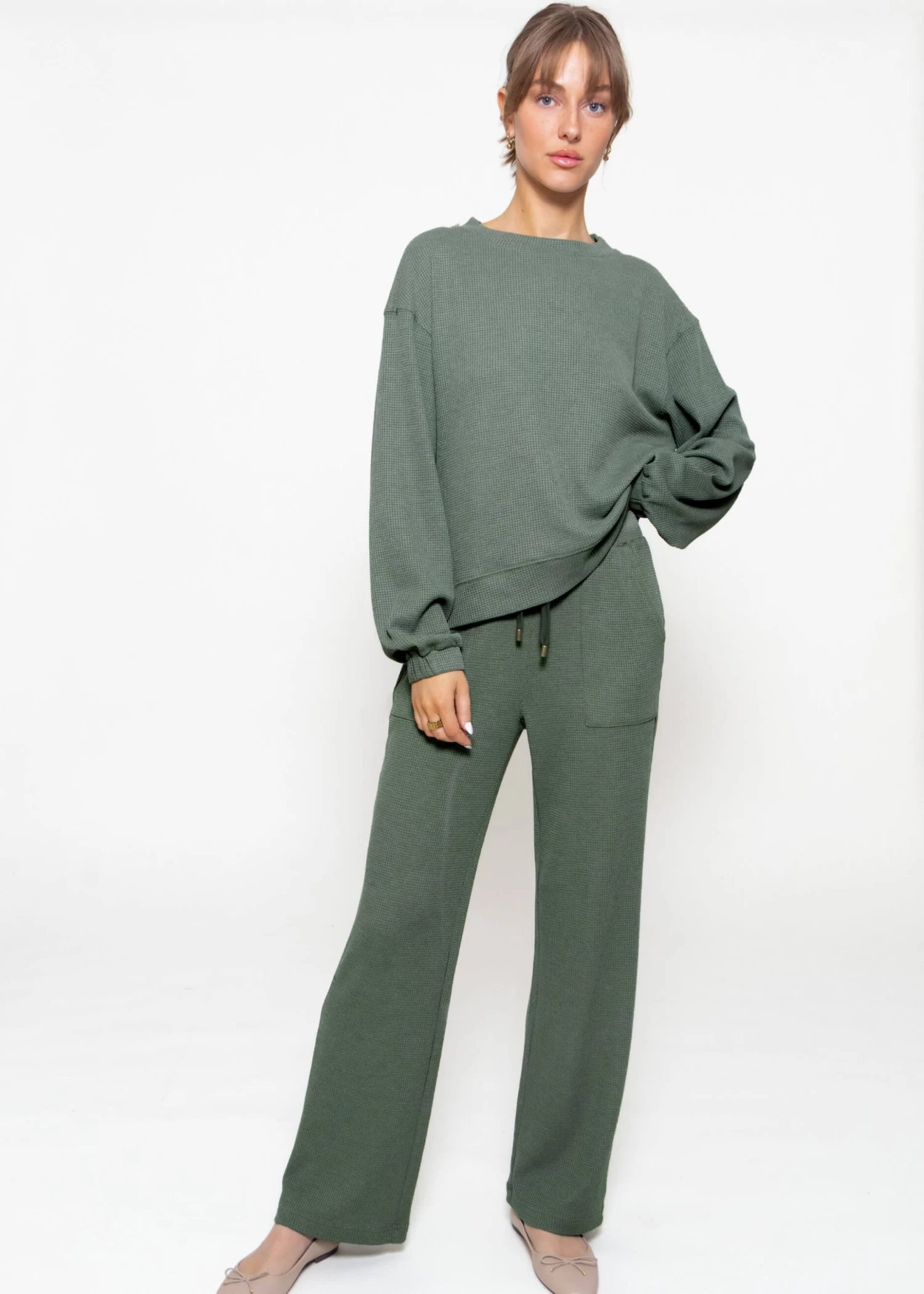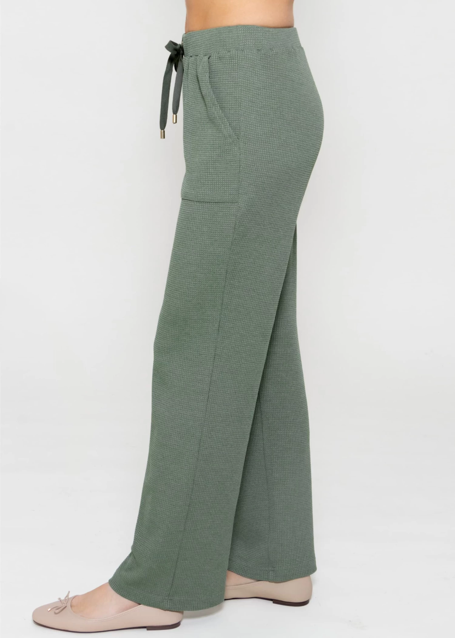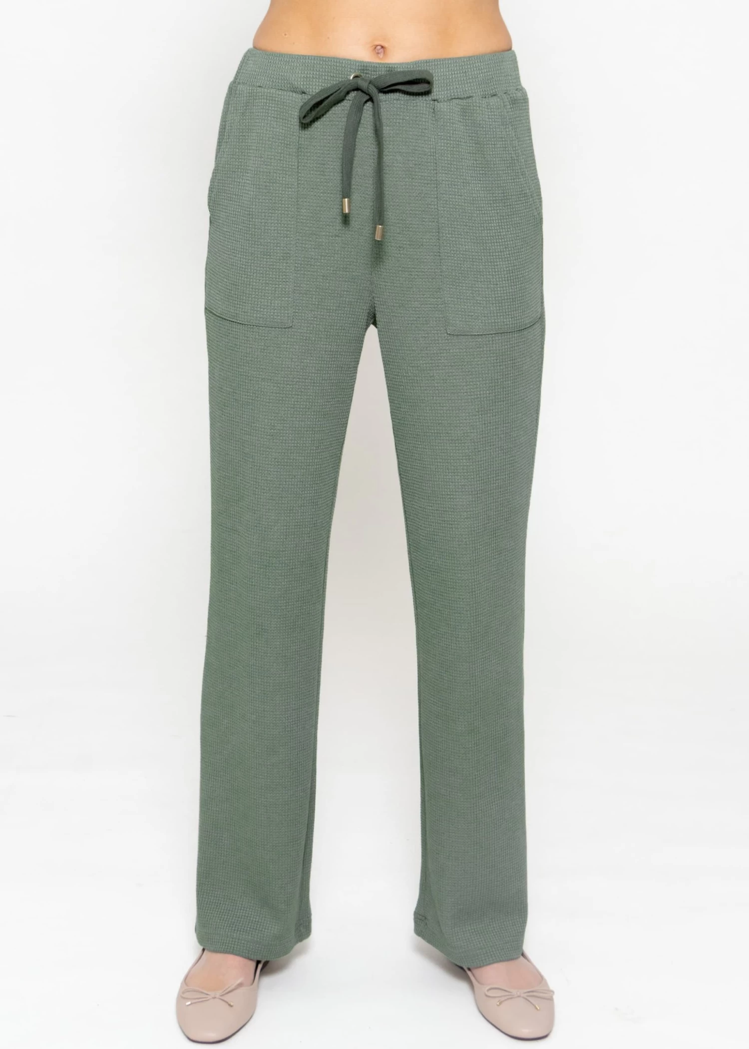 Dieses Modell präsentiert sich in einer lockeren Passform, mit einem elastischen Gummibund sowie mit weitem Bein. Praktische Einschubtaschen und Bindebänder geben der Hose einen sportiven Look und bieten gleichzeitig Funktionalität. Das hochwertige Waffelpiqué sorgt für eine ansprechende Struktur und garantiert höchsten Tragekomfort. Für einen entspannten Set-Look kannst du die passende Bluse zu dieser Hose kombinieren.