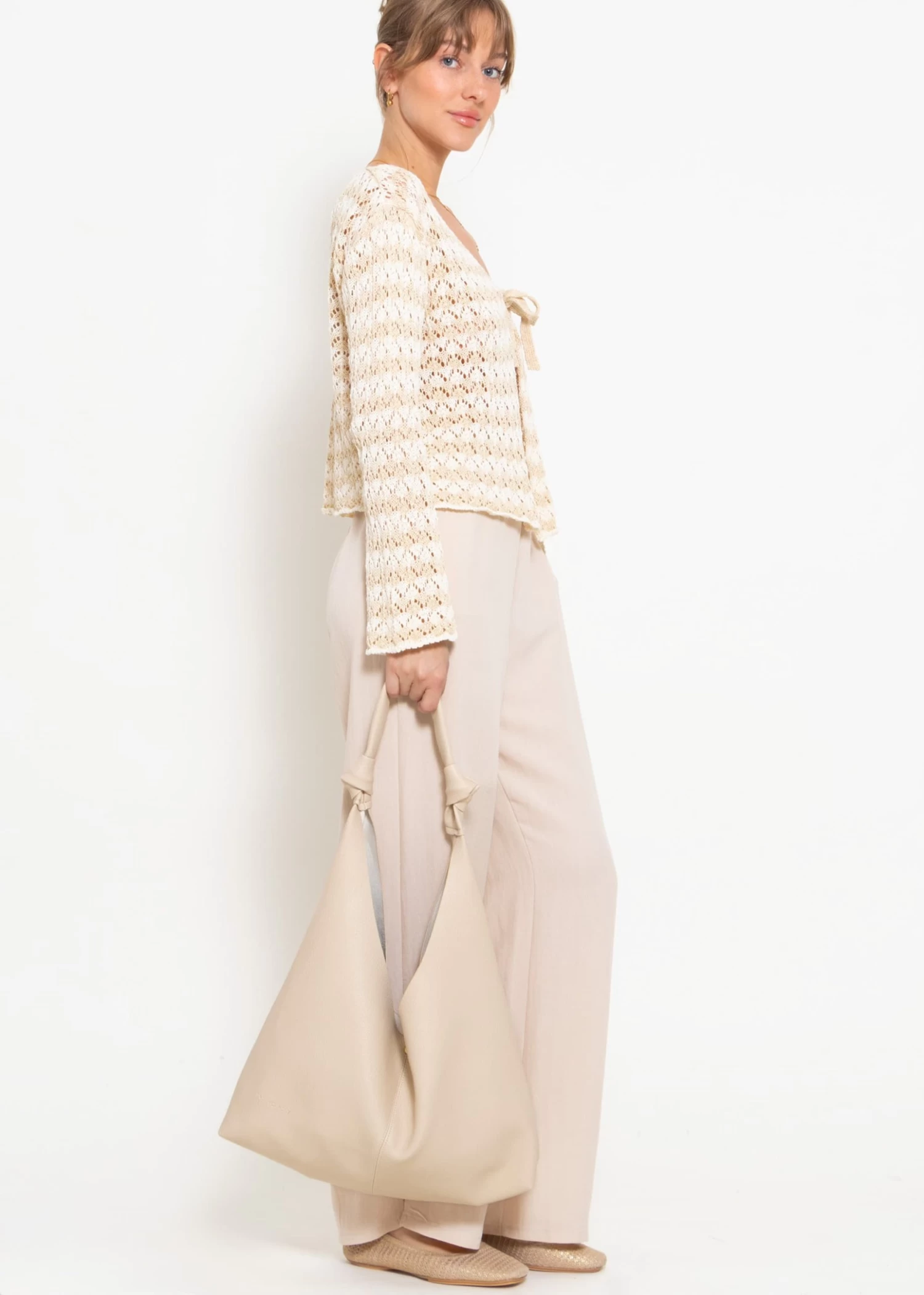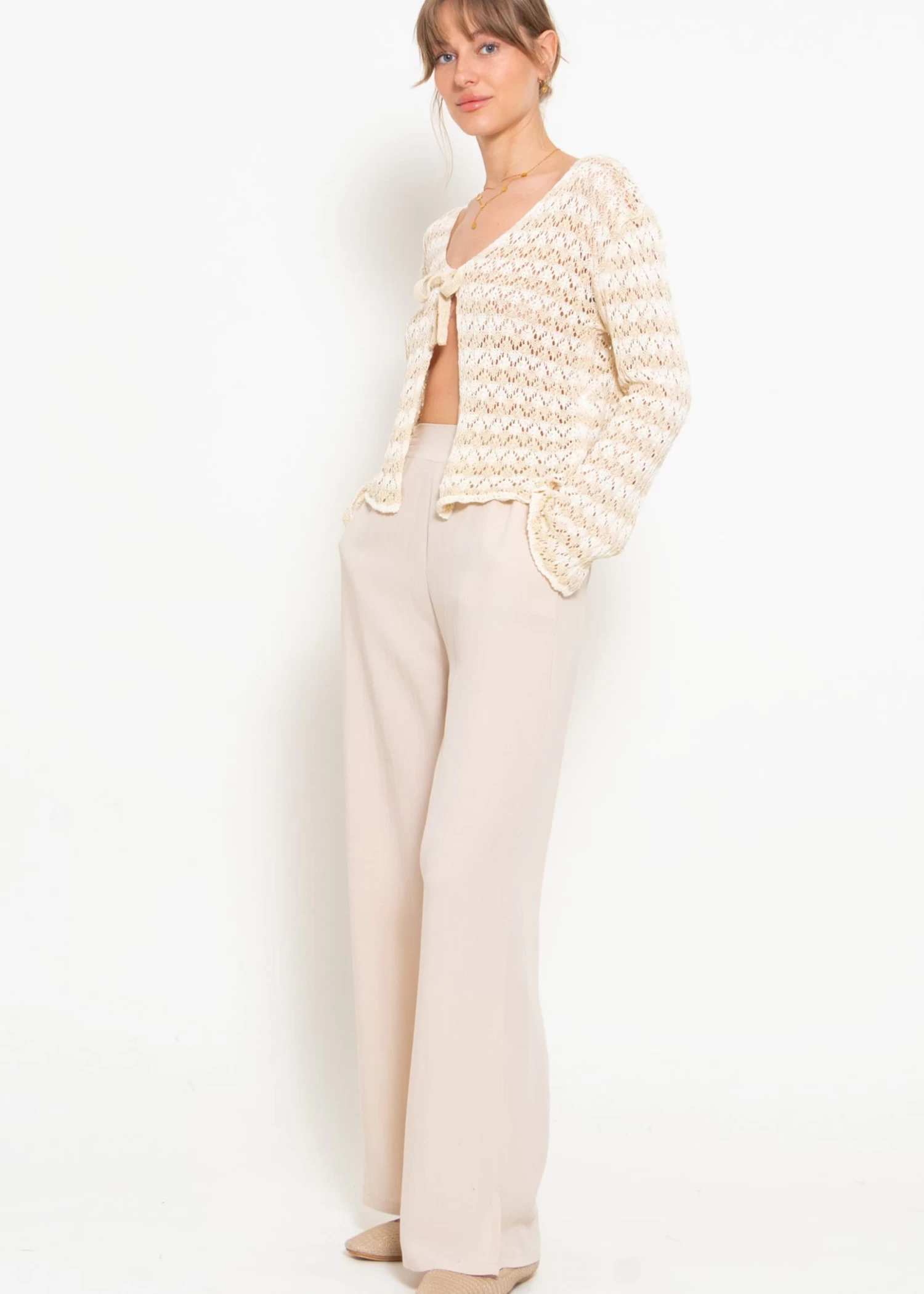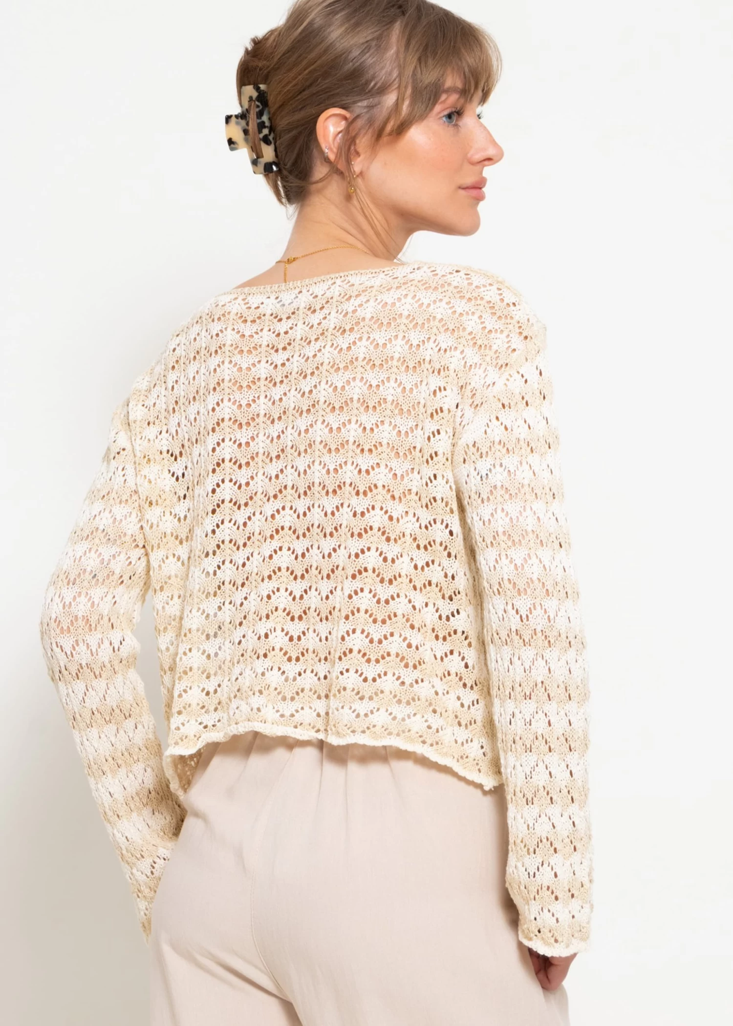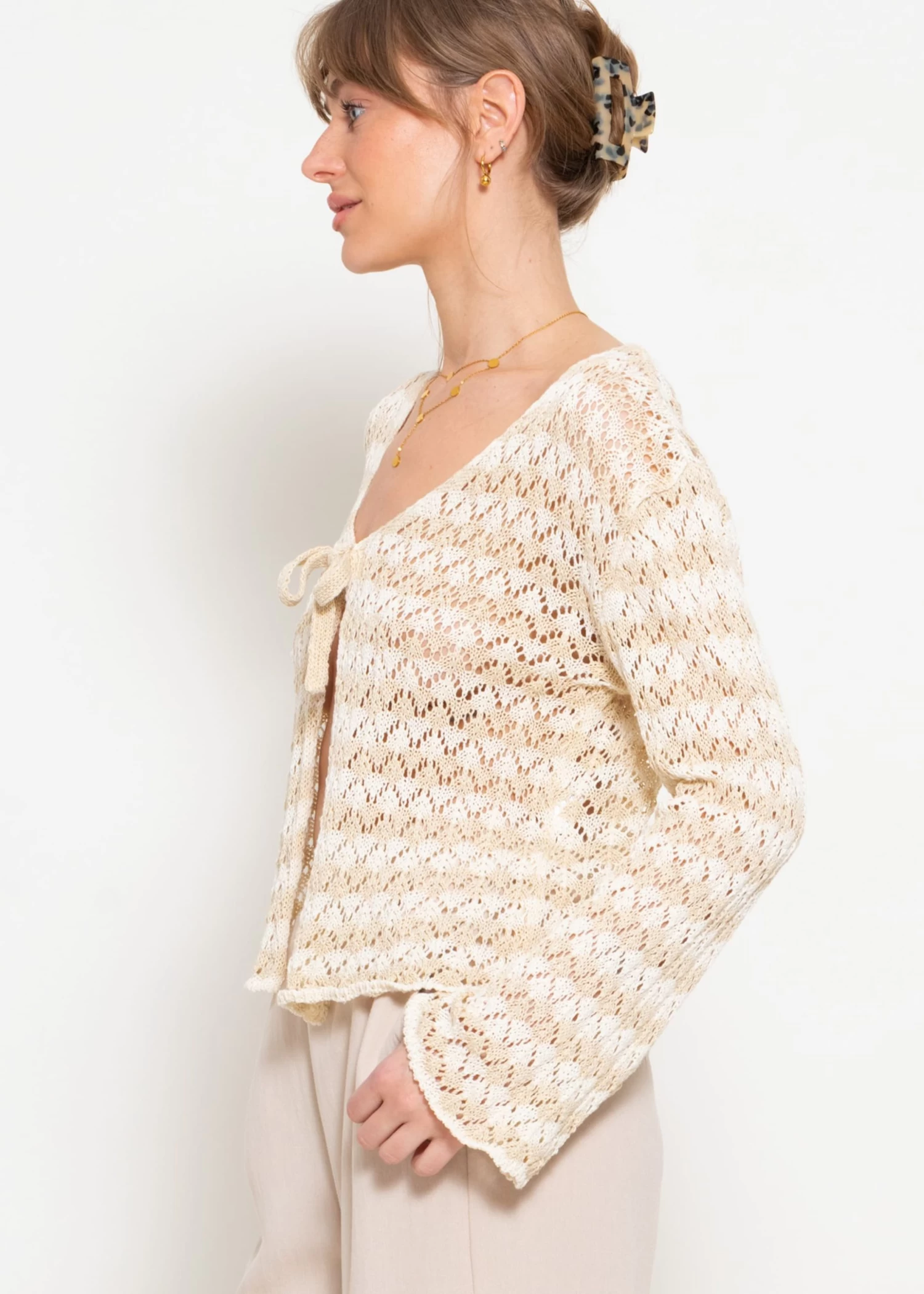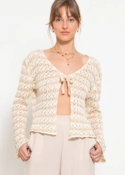 Crop Cardigan in Ajourstrick mit Bindebänder in Beige und Offwhite