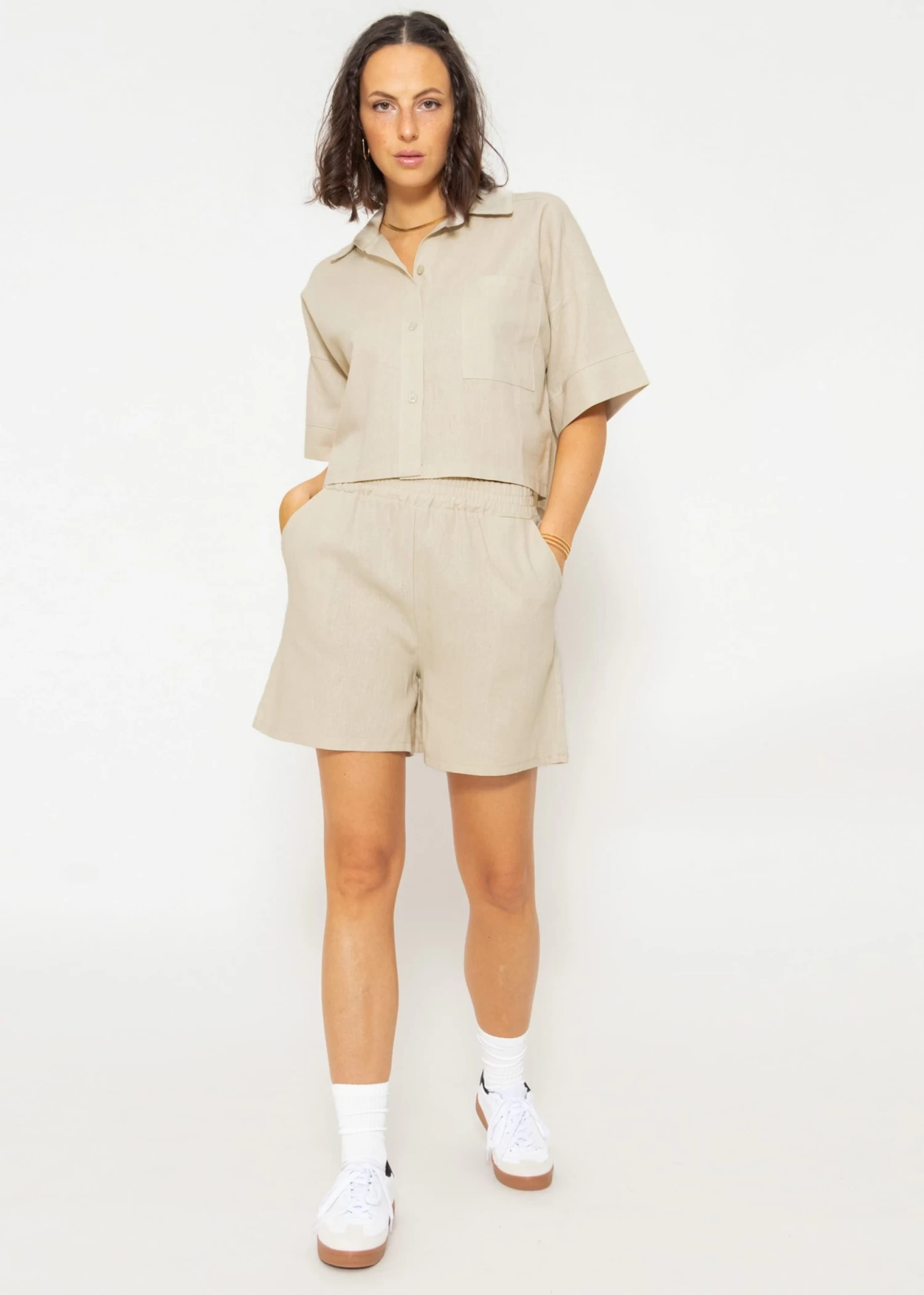 Crop Leinen Blusen Jacke in Beige. Das Modell besitzt einen Kragen, Knopfleiste sowie halblange Ärmel. Die lockere Passform und die überschnittenen Schultern verleihen der Blusenjacke Lässigkeit. Auf der linken Seite befindet sich eine große Brusttasche, die für ein cooles Design sorgt. Sie wurde in Italien aus einem luftigen Leinengemisch gefertigt und trägt sich dadurch angenehm auf der Haut. Für einen abgestimmten Look empfehlen wir die passende Shorts dazu. Auch mit einer Boyfriend-Jeans kannst du einen tollen Look kreieren.