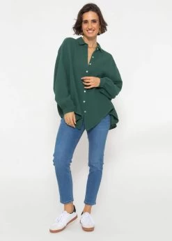 Crop Leinen Blusen Jacke in Khaki. Das Modell besitzt einen Kragen, Knopfleiste sowie halblange Ärmel. Die lockere Passform und die überschnittenen Schultern verleihen der Blusenjacke Lässigkeit. Auf der linken Seite befindet sich eine große Brusttasche, die für ein cooles Design sorgt. Sie wurde in Italien aus einem luftigen Leinengemisch gefertigt und trägt sich dadurch angenehm auf der Haut. Für einen abgestimmten Look empfehlen wir die passende Shorts dazu. Auch mit einer Boyfriend-Jeans kannst du einen tollen Look kreieren.