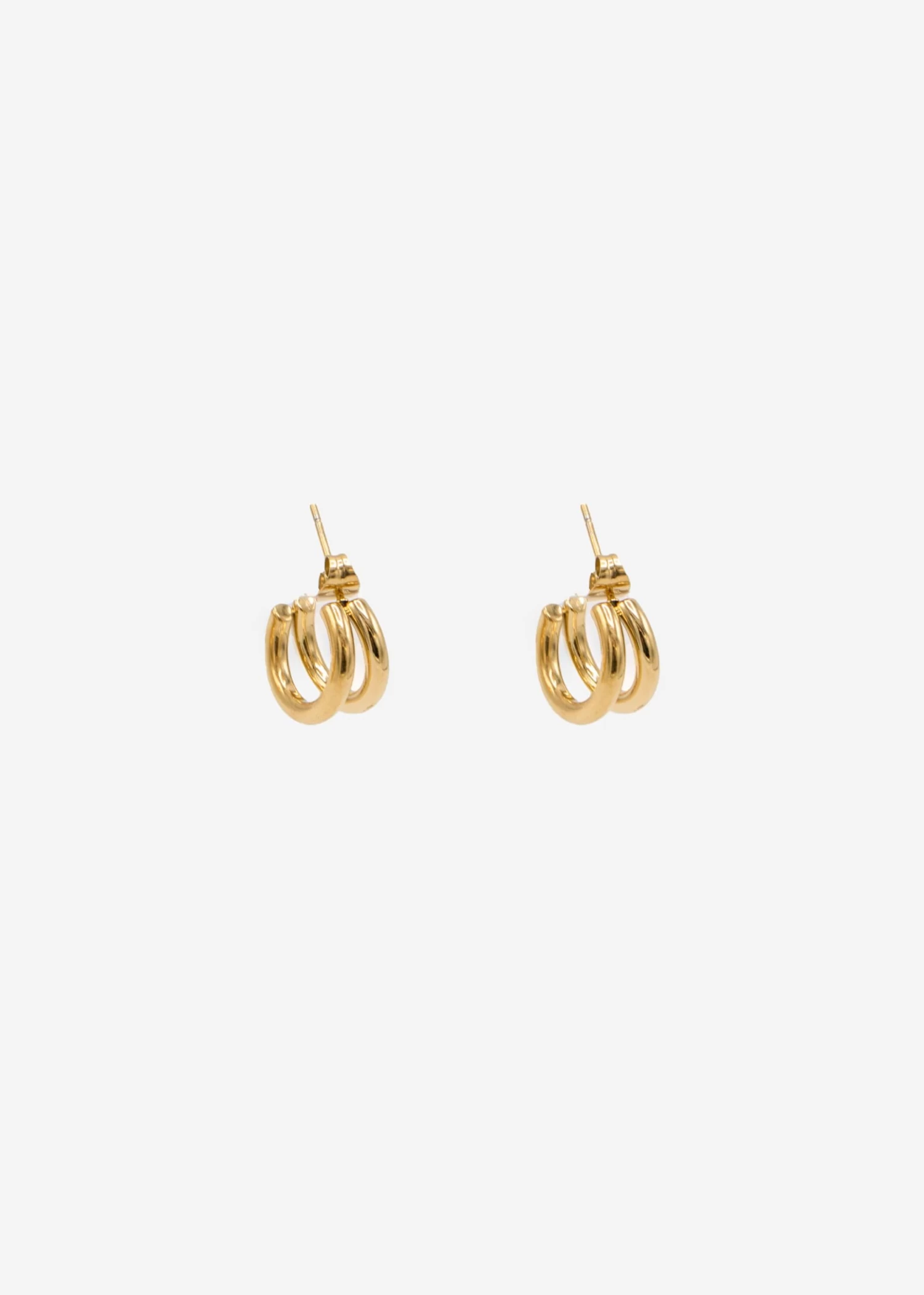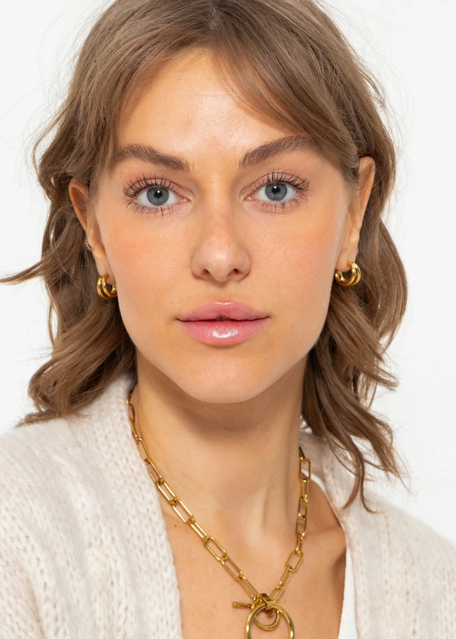 Diese Ohrstecker sind das perfekte Accessoire für Liebhaber von subtilem Luxus. Das Modell zeichnet sich durch die doppelten Creolen aus, die sich elegant um das Ohr legen und einen mehrdimensionalen Look erzeugen. Die goldfarbene, glänzende Oberfläche verleiht den Mini-Creolen Eleganz und Klassik. Die Ohrringe besitzen einen klassischen Steckverschluss.