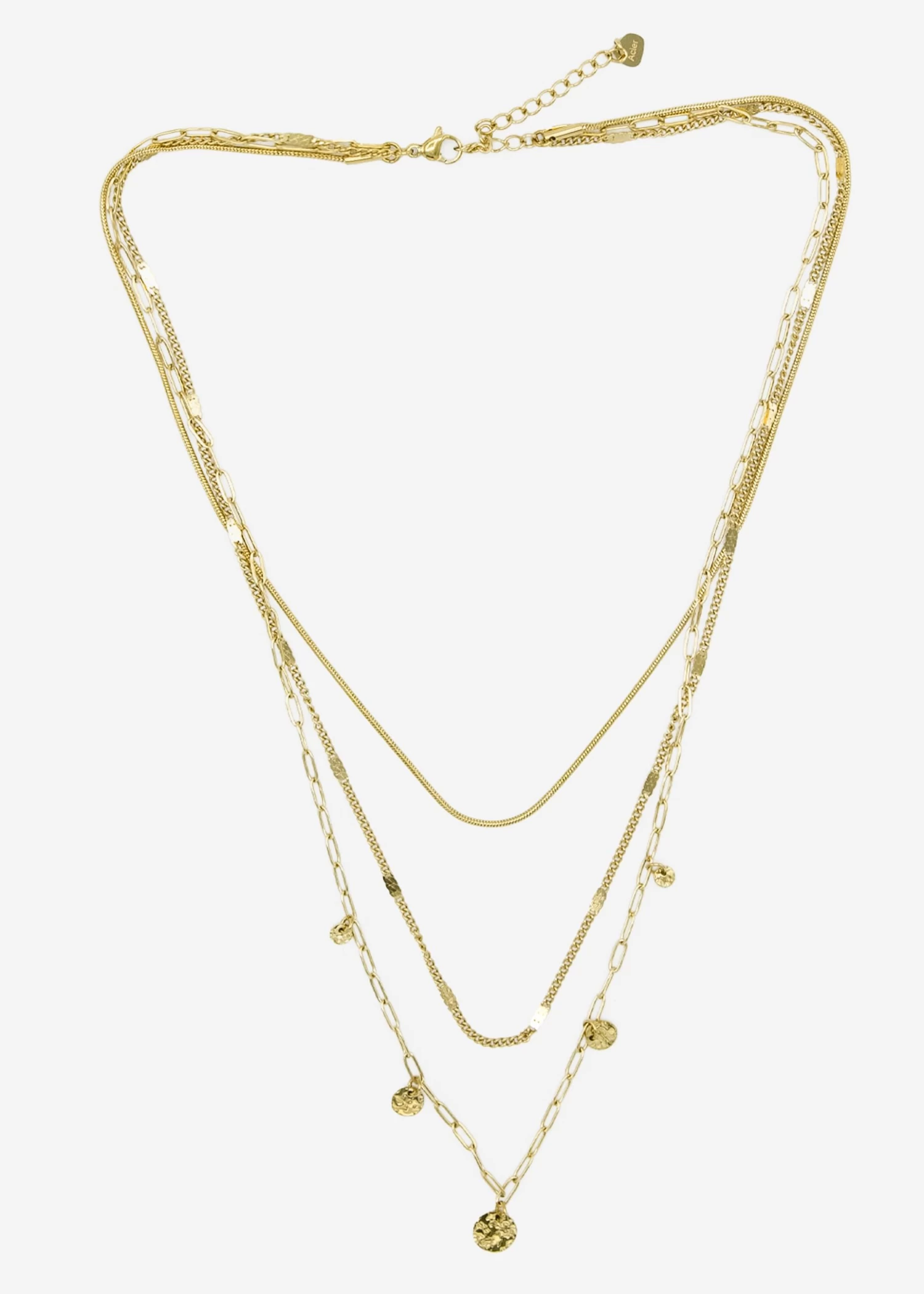 Diese einzigartige Kreation besteht aus drei unterschiedlichen Ketten, die Eleganz und Individualität perfekt vereint. Die erste Kette präsentiert sich als zeitlose Grundlage, während die zweite Kette mit ihrer feinen Struktur subtilen Glamour verleiht. Das Highlight dieser Halskette ist jedoch die dritte Kette, die durch die zarten Plättchen einen charmanten Akzent setzt. Das dreigliedrige Design schafft eine dynamische und moderne Ästhetik, die sich leicht in verschiedene Outfits integrieren lässt.