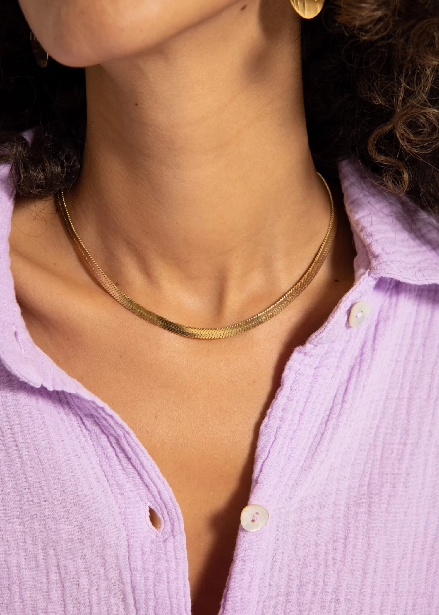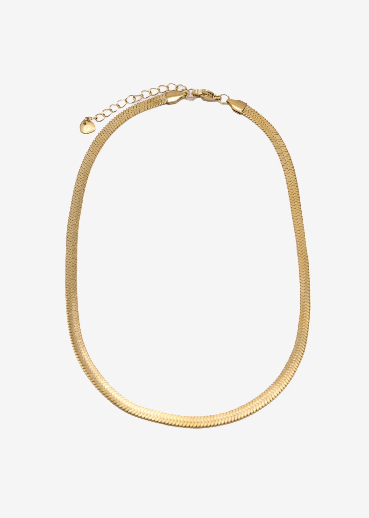 Diese flache Snake Chain ist elegant und chunky zugleich, was sie zu einem total angesagtes Must-Have macht. Sie legt sich perfekt um deinen Hals und besticht durch ihre schimmernde, schlangenartige Optik, die durch die enggewobenen Kettenglieder entsteht. Die Kette rundet dein Outfit ab und sorgt für einen letzten Glam-Touch. Sie ist längenverstellbar.