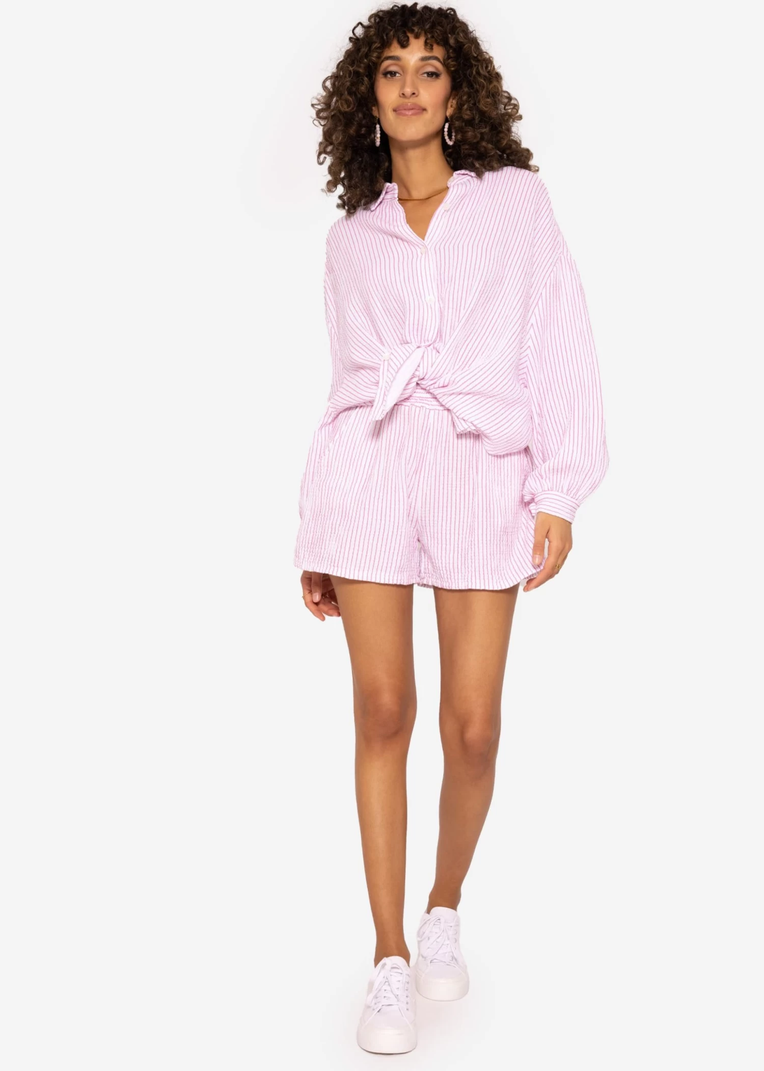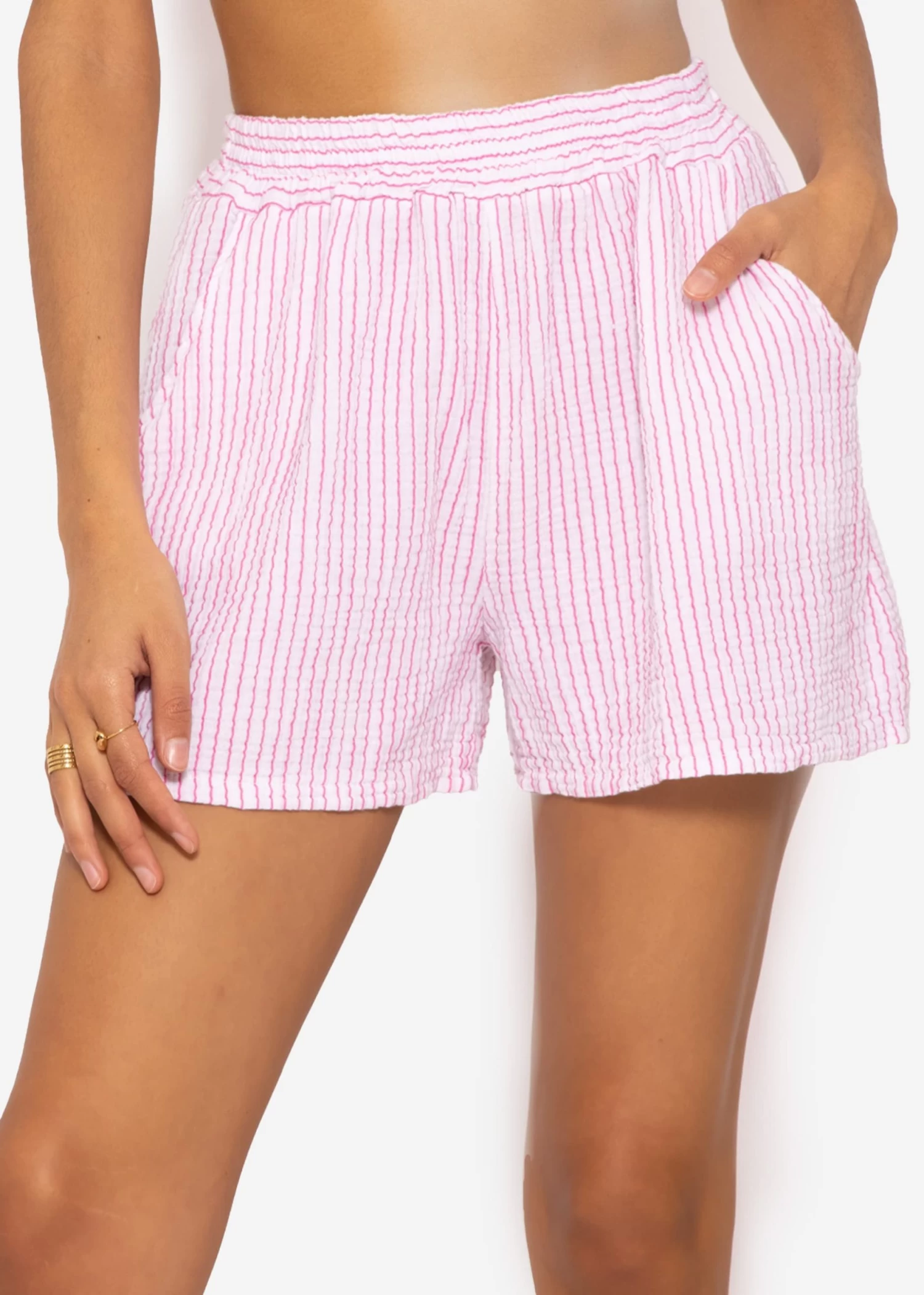 Pink/Weiß gestreifte Freizeit Shorts aus softem Baumwoll-Musselin mit Gummibund. Einschubtaschen geben ihr den coolen Look.