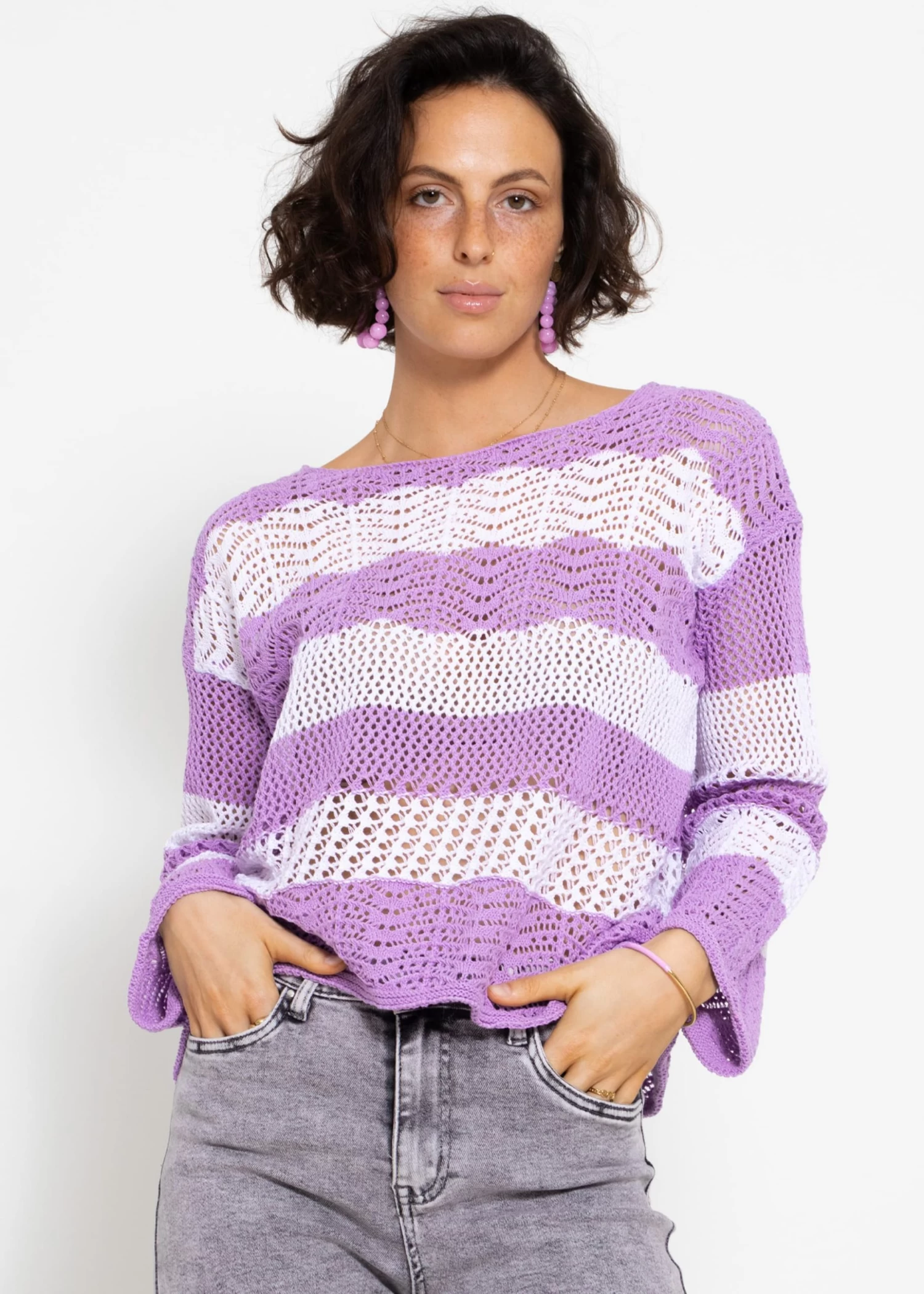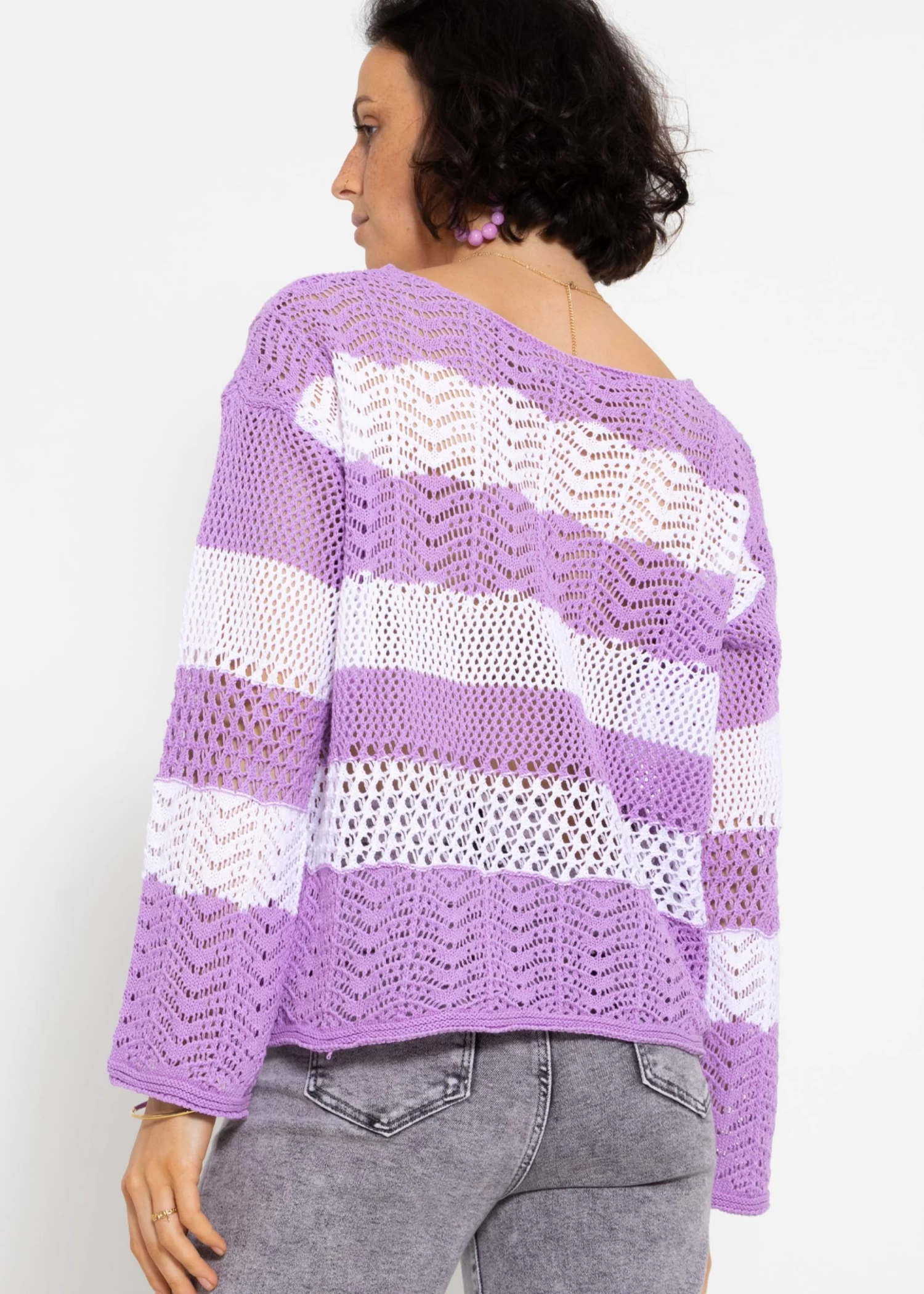 Gestreifter Ajour-Strickpullover in Flieder und Weiß