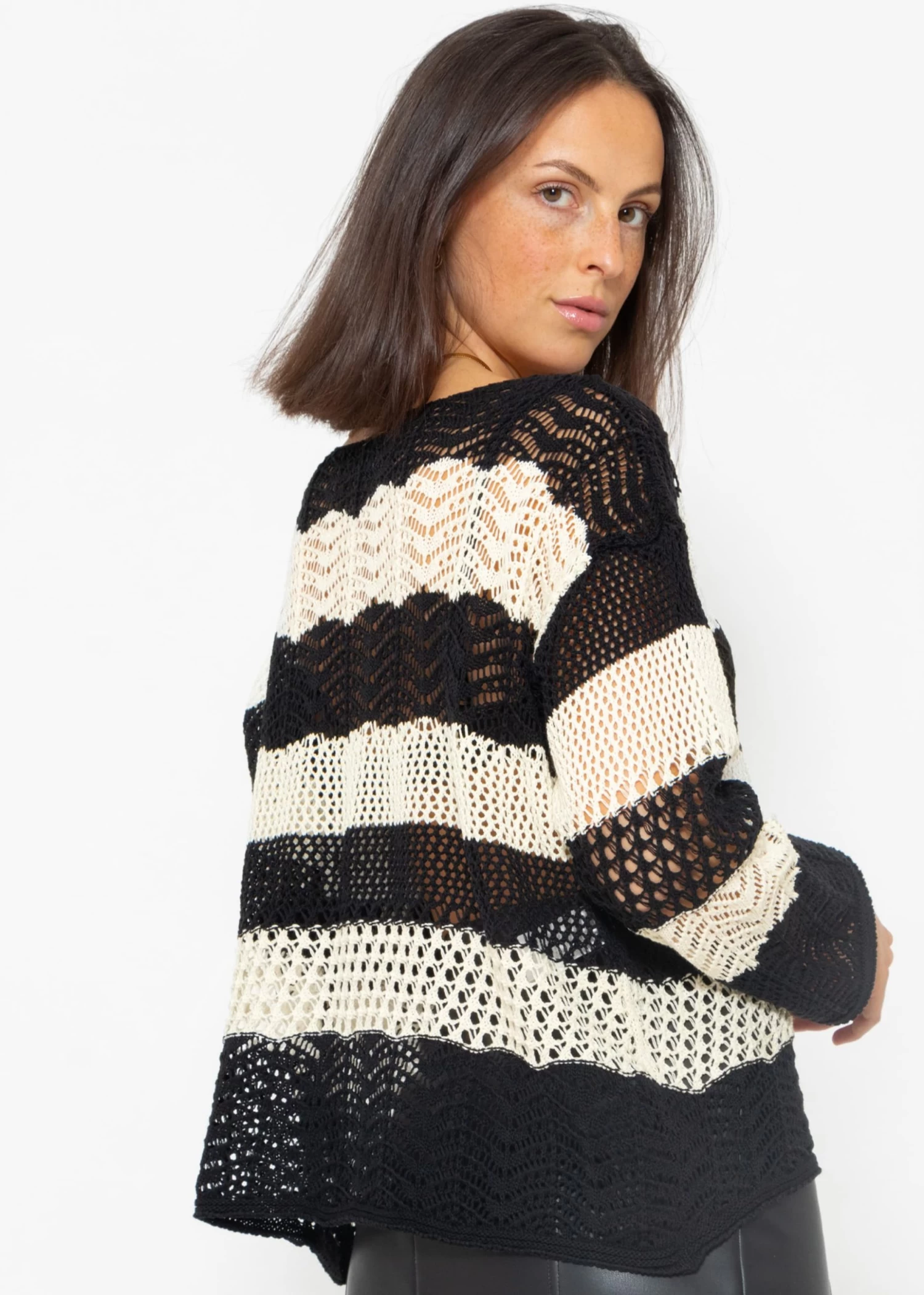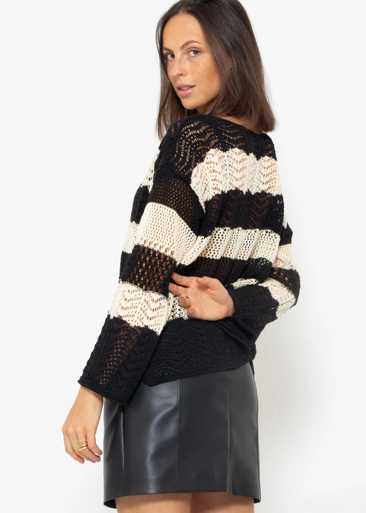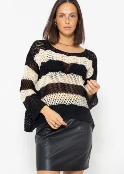 Gestreifter Ajour-Strickpullover in Schwarz Beige