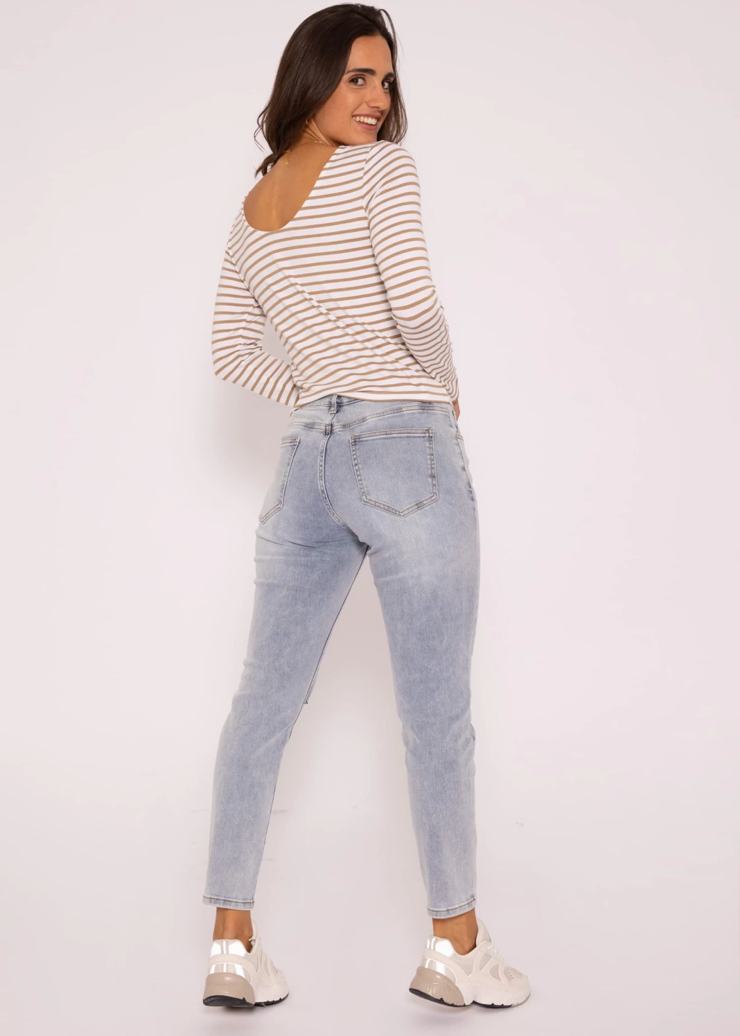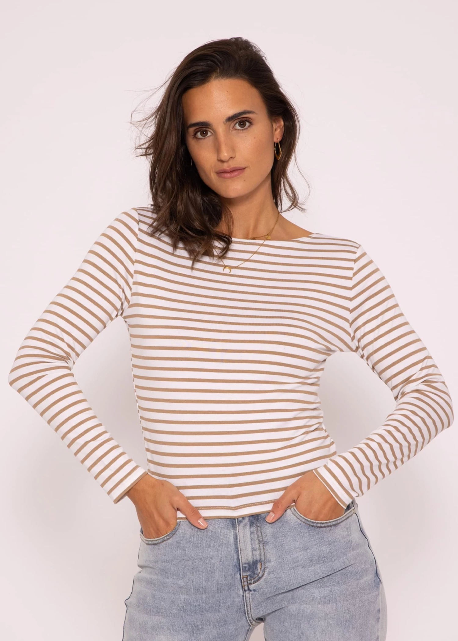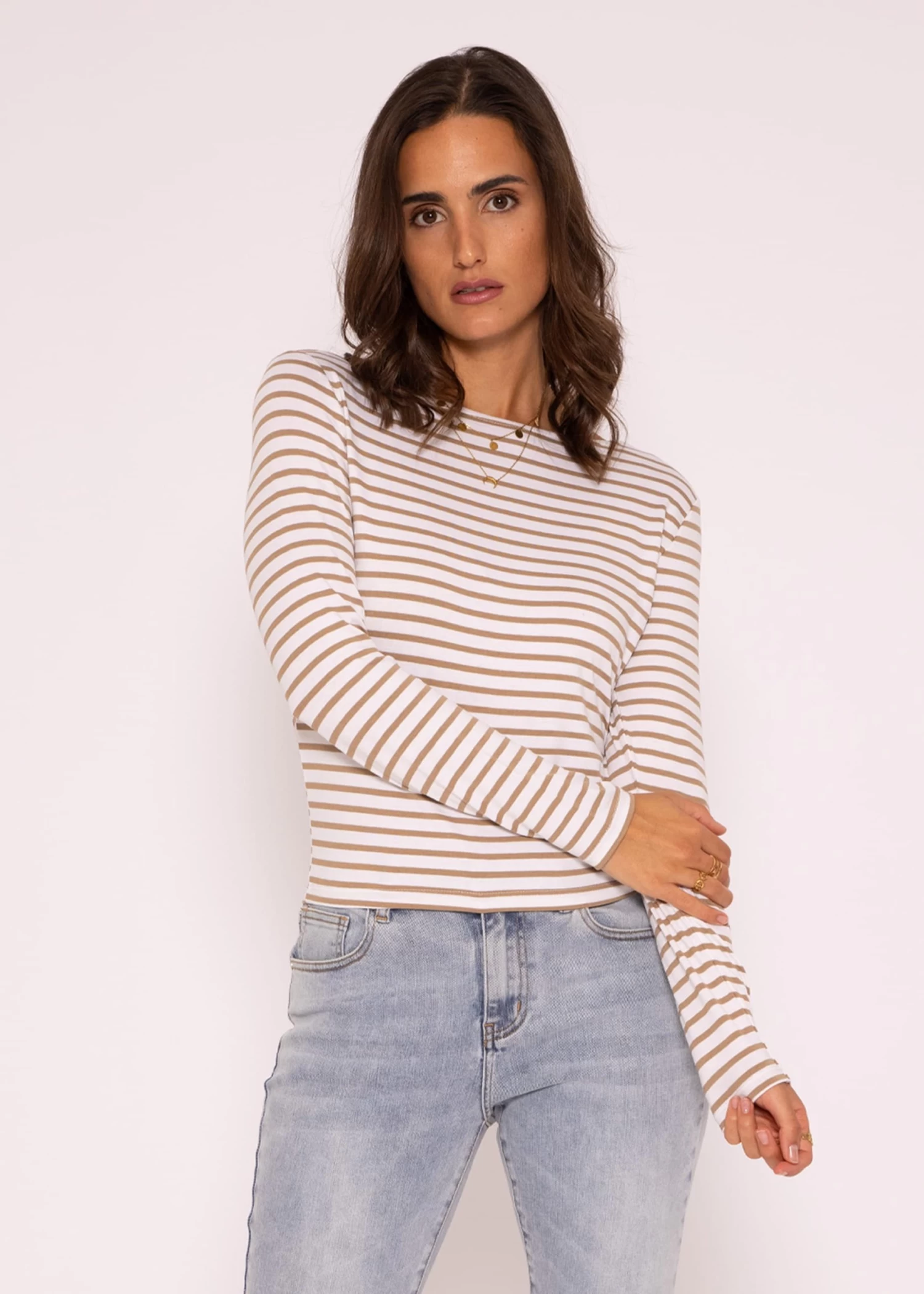 Gestreiftes Langarmshirt mit Rückenausschnitt in beige/weiß