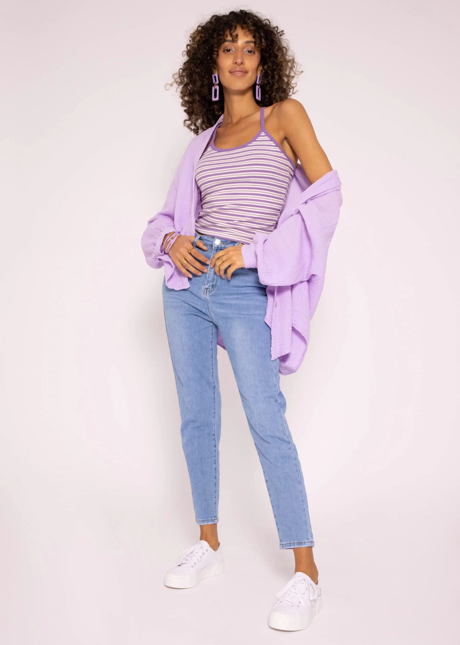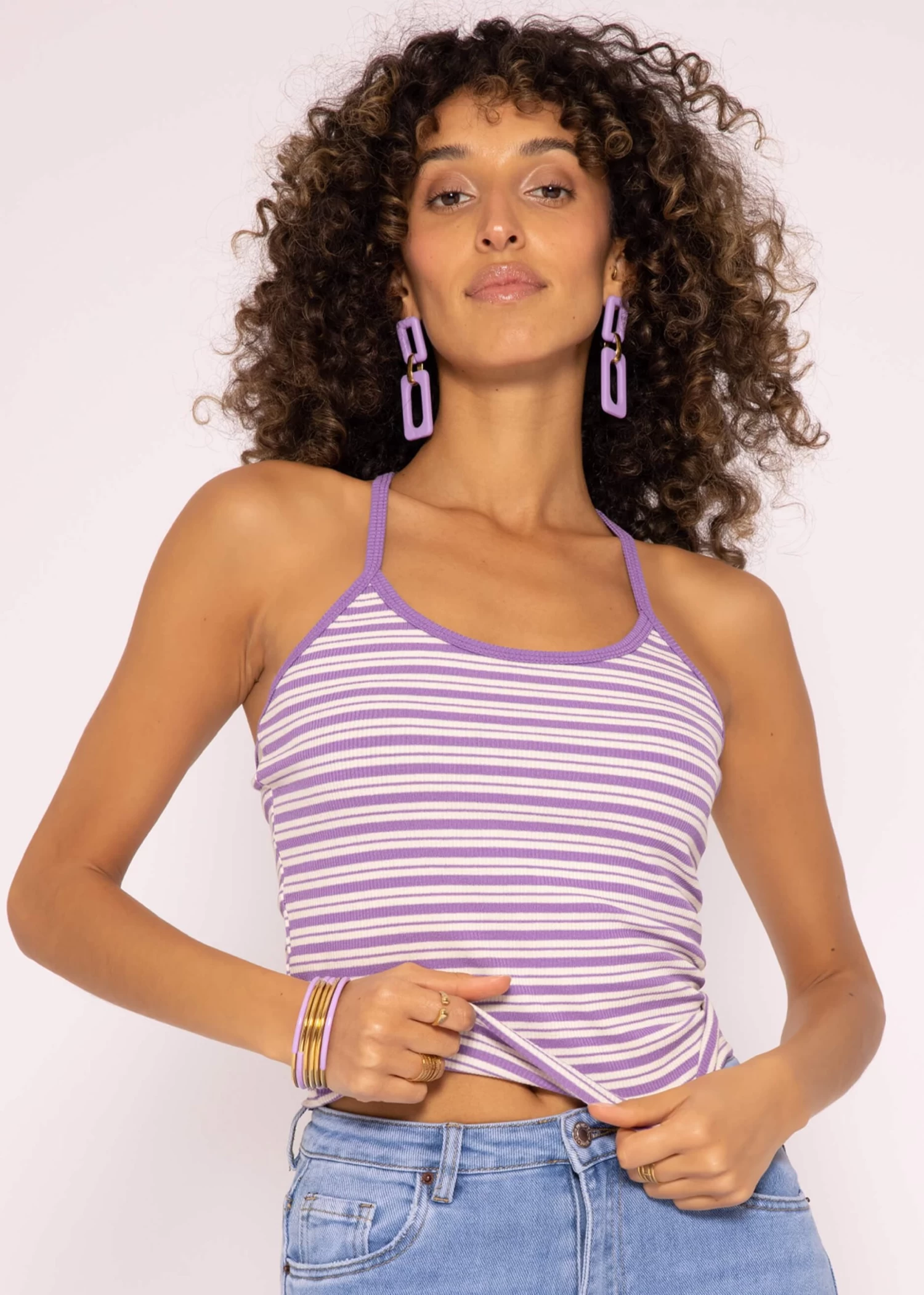 Dieses elastische Top präsentiert sich in einem geraden Schnitt, Rippendesign und mit schmalen Trägern. Das Modell besitzt einen enganliegenden Fit, weiten Rundhalsausschnitt sowie einen angesagten Streifenlook. Für ein Highlight sorgt der modische Rücken, der sich durch seine überkreuzten Träger auszeichnet. Style es mit einer weiten Hose und passenden Accessoires für den perfekten Sommerlook.