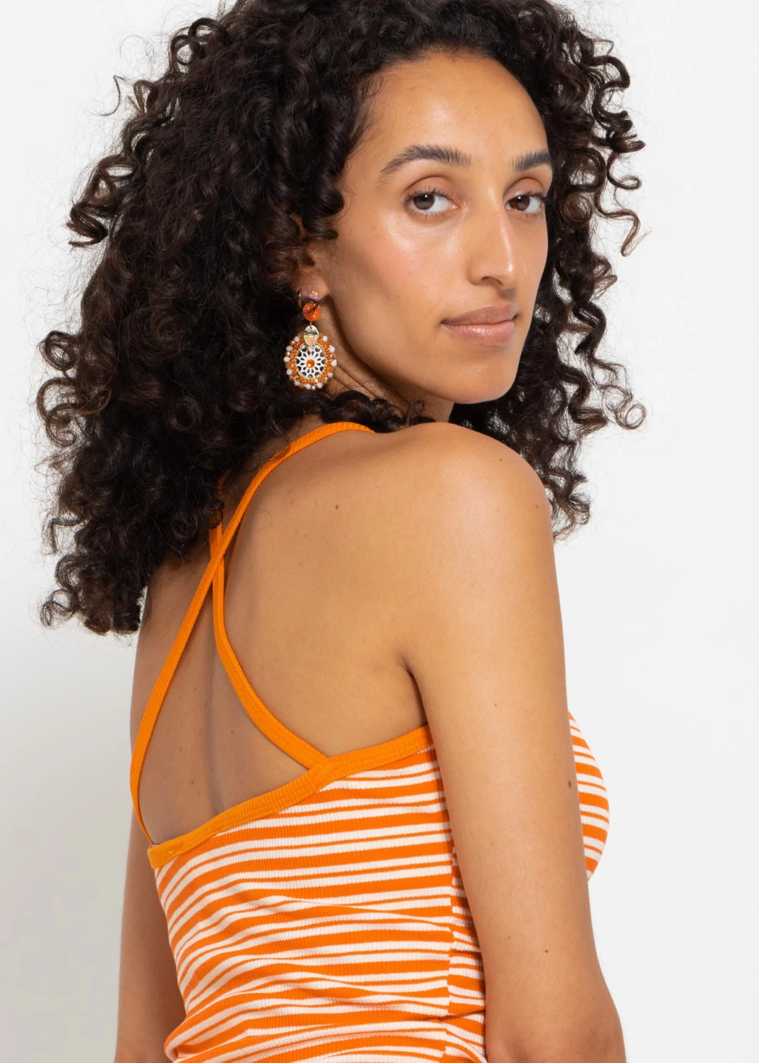 Dieses elastische Top präsentiert sich in einem geraden Schnitt, Rippendesign und mit schmalen Trägern. Das Modell besitzt einen enganliegenden Fit, weiten Rundhalsausschnitt sowie einen angesagten Streifenlook. Für ein Highlight sorgt der modische Rücken, der sich durch seine überkreuzten Träger auszeichnet. Style es mit einer weiten Hose und passenden Accessoires für den perfekten Sommerlook.