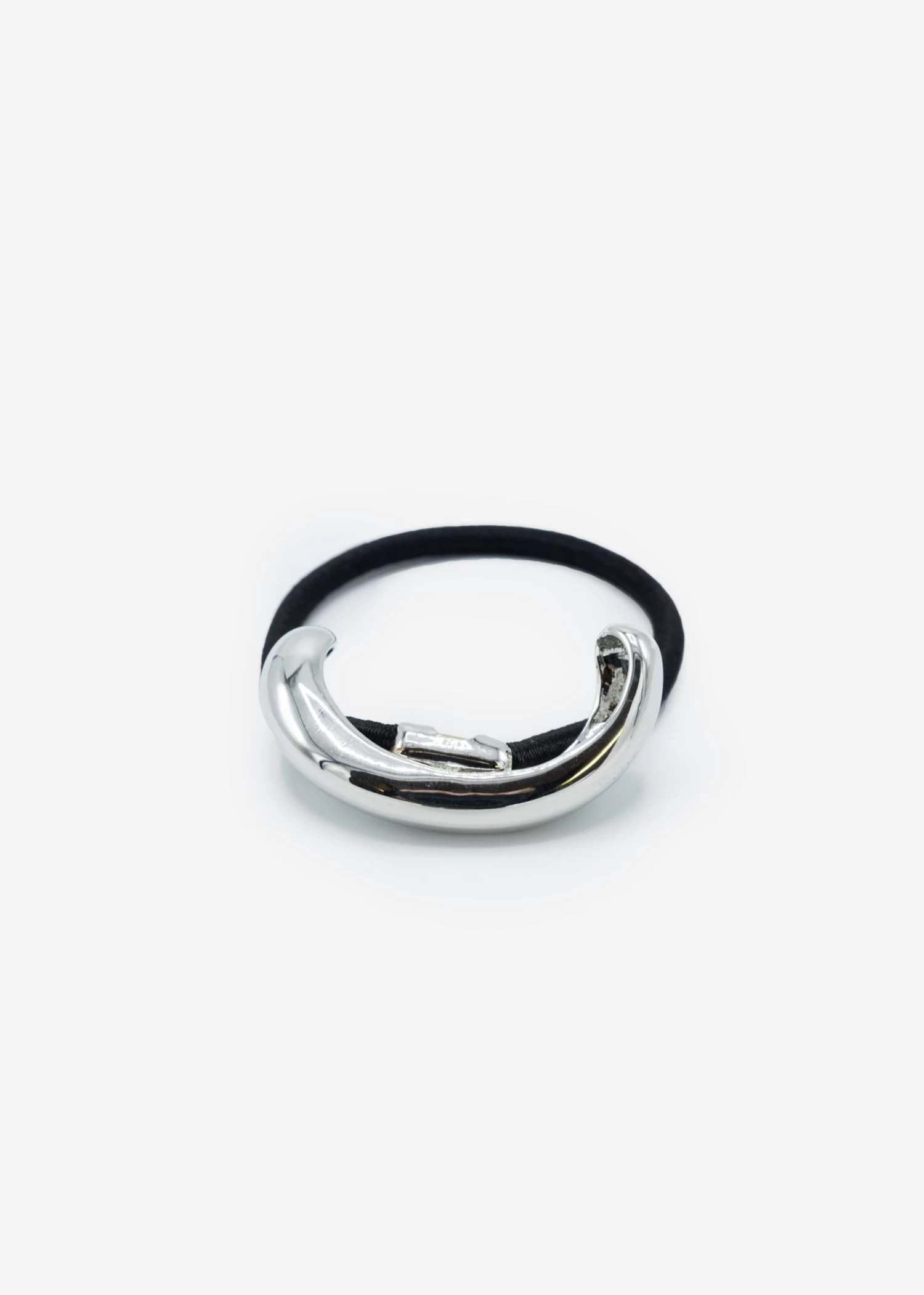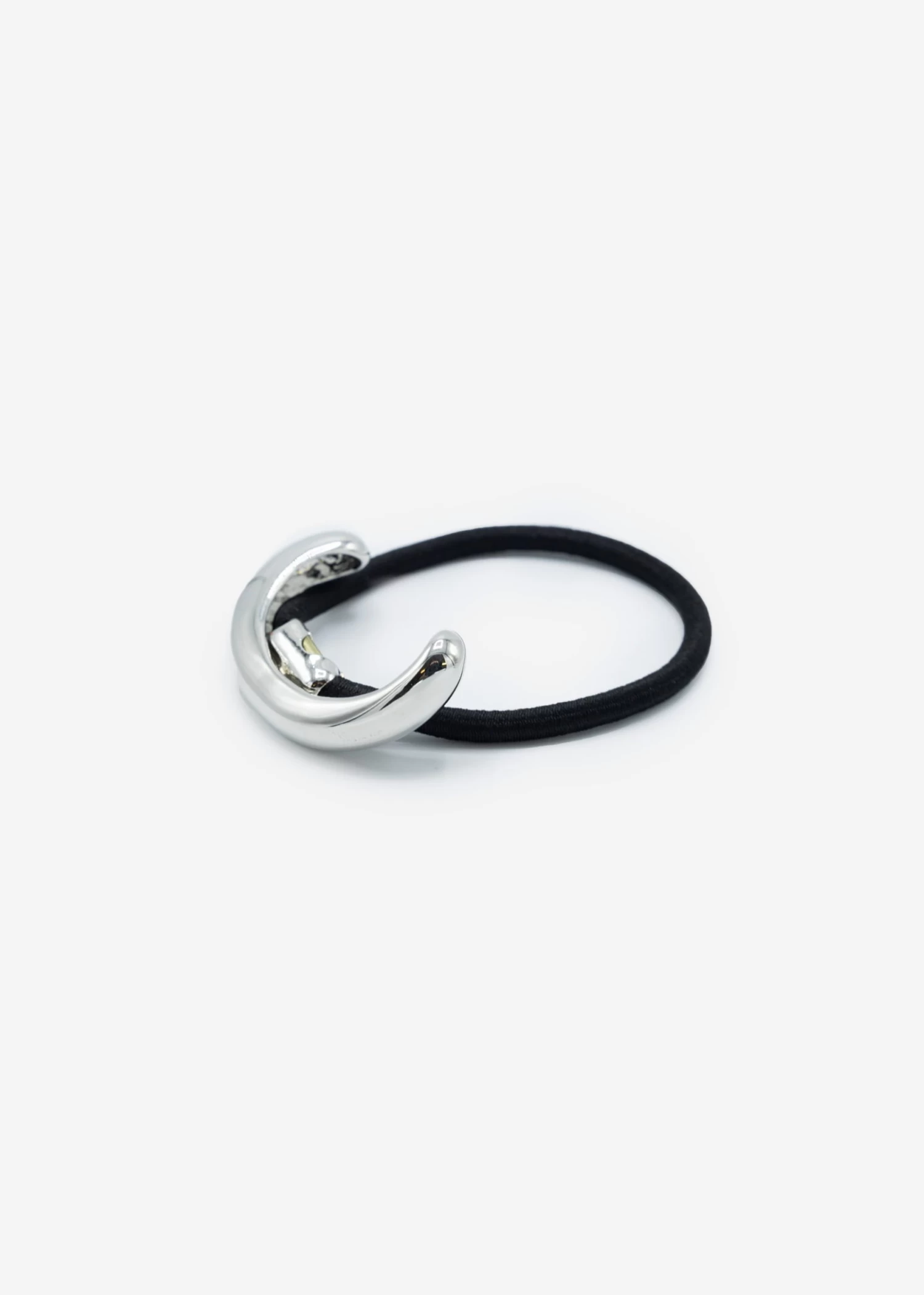 Dieser Haargummi besticht durch seinen silberfarbenen Anhänger in geschwungener Form, der einen modernen Eindruck hinterlässt. Die glänzende Oberfläche fängt das Licht ein und setzt einen schimmernden Akzent in deinem Haar. Mit seinem zeitlosen Design fügt es sich mühelos in deine Frisur ein und rundet dein Outfit mit einem Hauch von Raffinesse ab. Jedes Haargummi wird in einem zufällig ausgewählten, farbigen Täschchen geliefert.