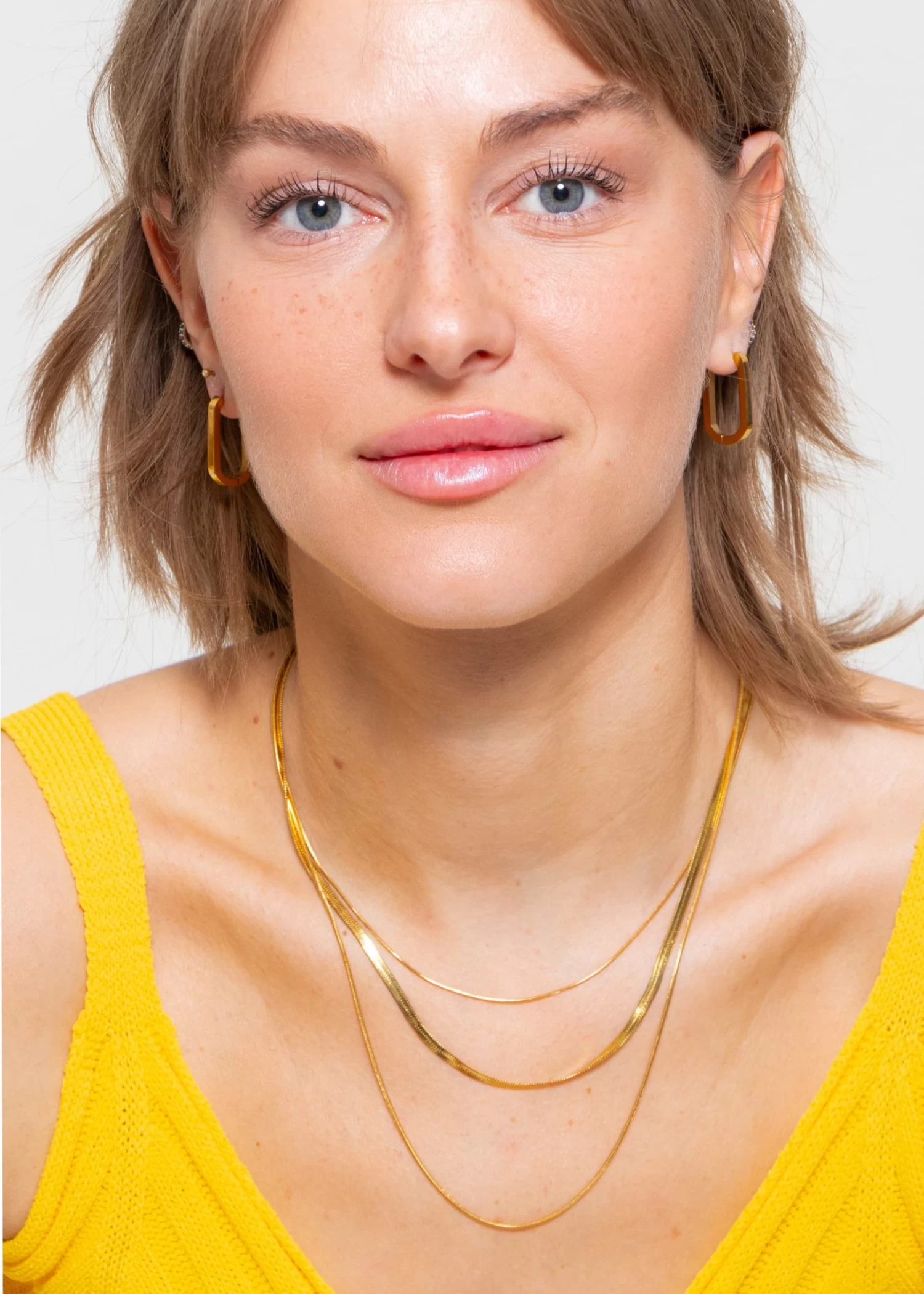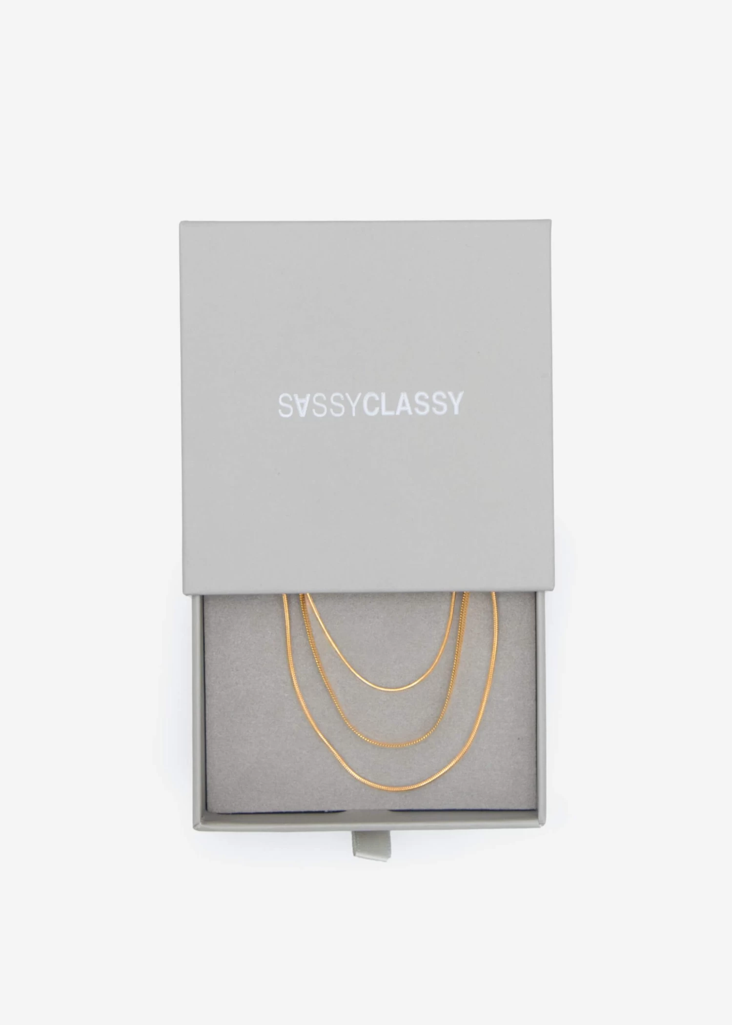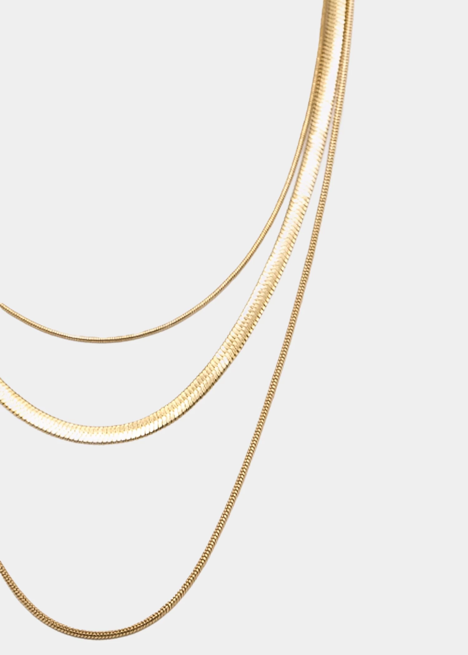 Verleihe deinem Look eine unwiderstehliche Eleganz und modernen Chic mit dieser bezaubernden Layering-Halskette. Das Herzstück der Kette sind die drei Lagen, die sich geschmeidig und harmonisch miteinander verbinden. Die beiden äußeren Ketten sind zart und feingliedrig, während die mittlere Kette etwas breiter und auffälliger ist. Die Kombination schafft ein atemberaubendes Layering-Design, das deine Persönlichkeit unterstreicht. Das Modell ist in strahlendem Gold gehalten, das Licht einfängt und deinen Teint zum Strahlen bringt.