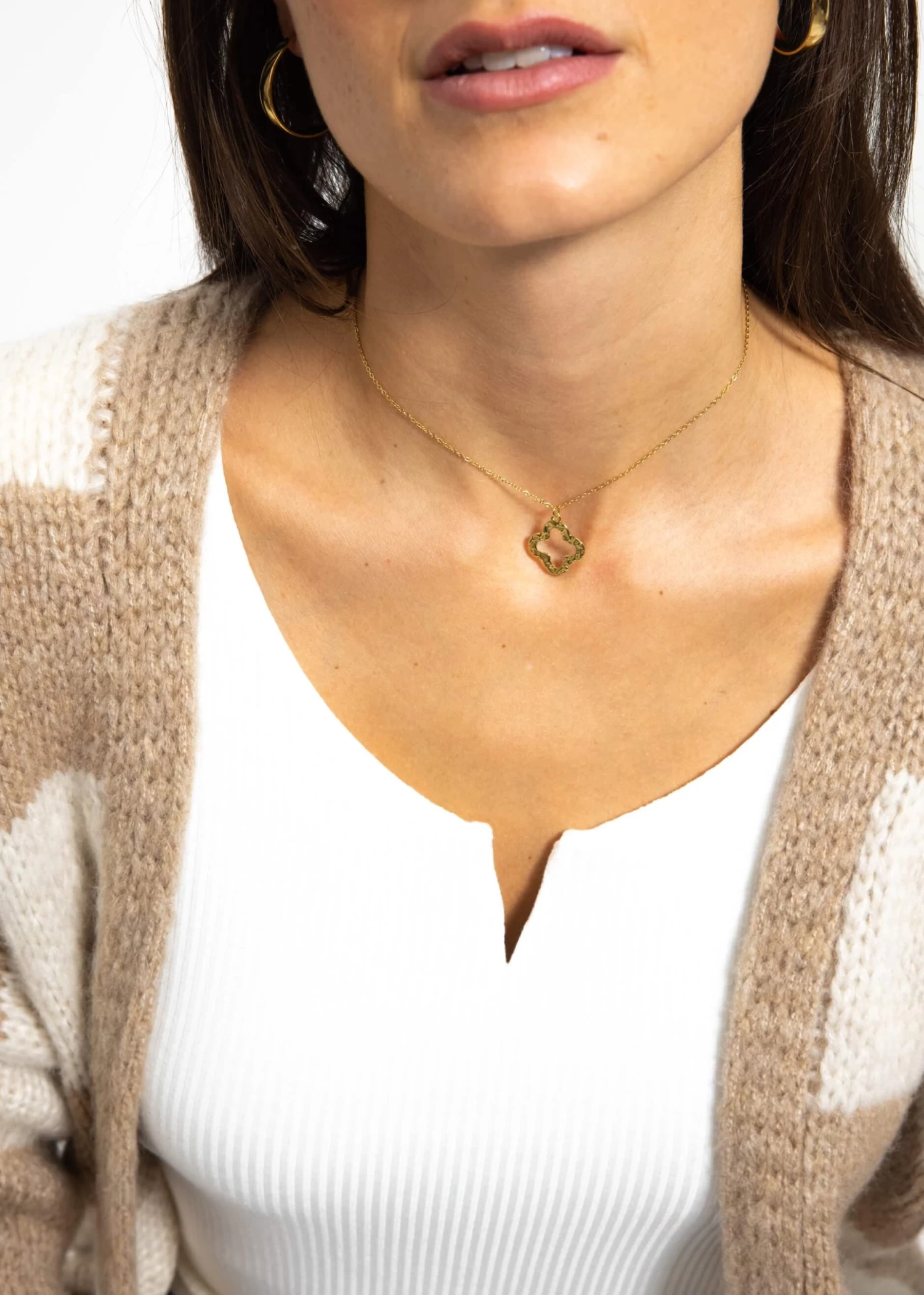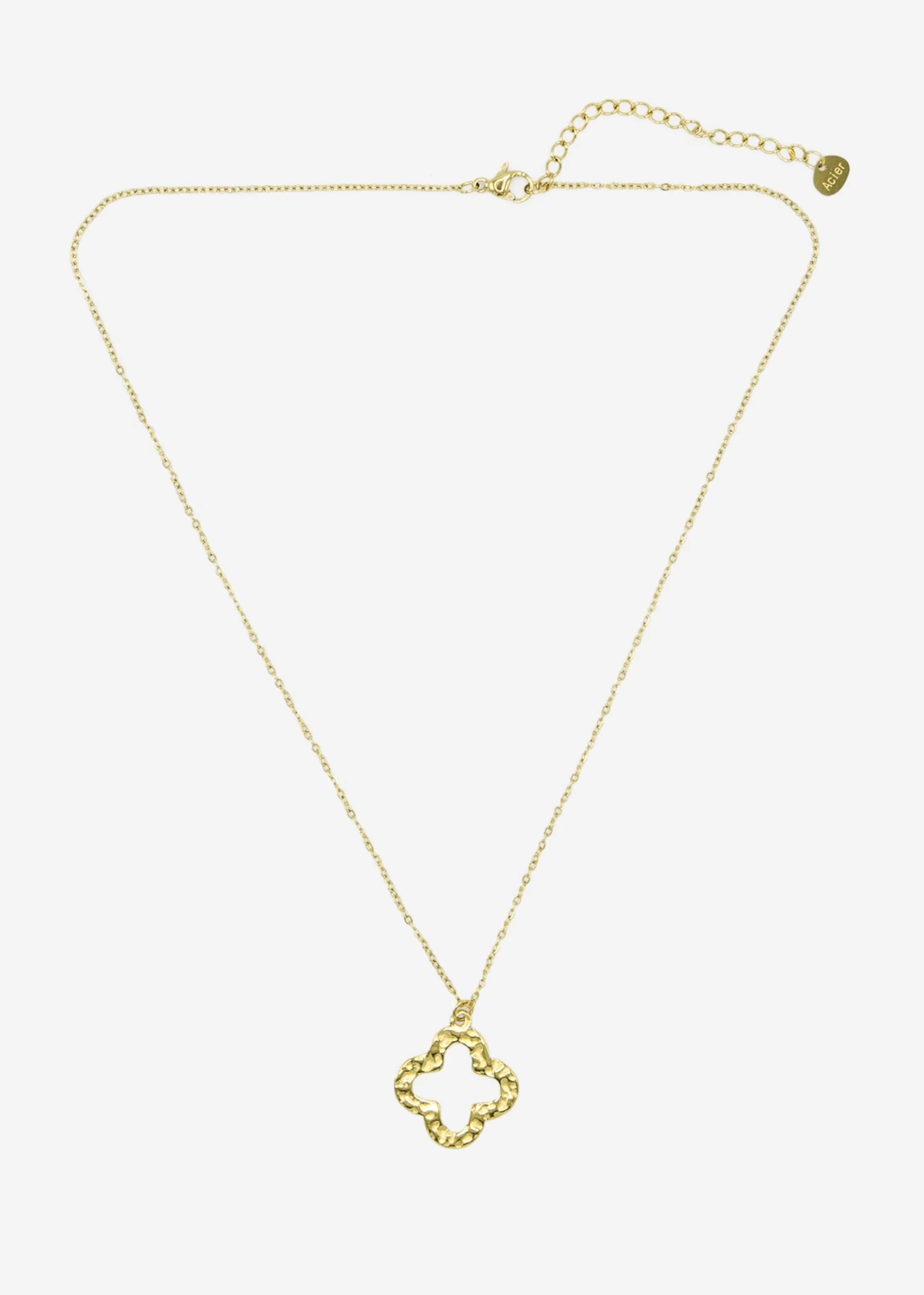 Diese elegante Halskette vereint ein zartes Design mit zeitloser Schönheit und wird zu einem subtilen Ausdruck von Stil und Raffinesse. Das goldfarbene Modell präsentiert einen filigranen Kleeblatt-Anhänger mit strukturierter Oberfläche, der eine verspielte und dennoch elegante Note verleiht. Die feine Halskette ist vielseitig tragbar und eignet sich sowohl für den Alltag als auch für besondere Anlässe. Das zarte Design ermöglicht es dir, die Kette wunderbar mit anderen Schmuckstücken zu kombinieren, um deinen persönlichen Stil zu unterstreichen.
