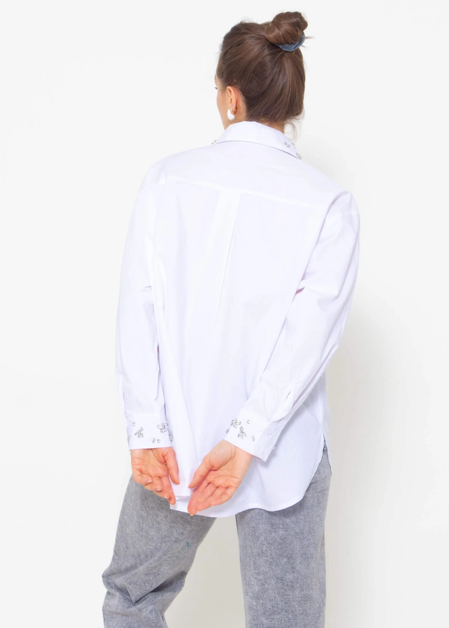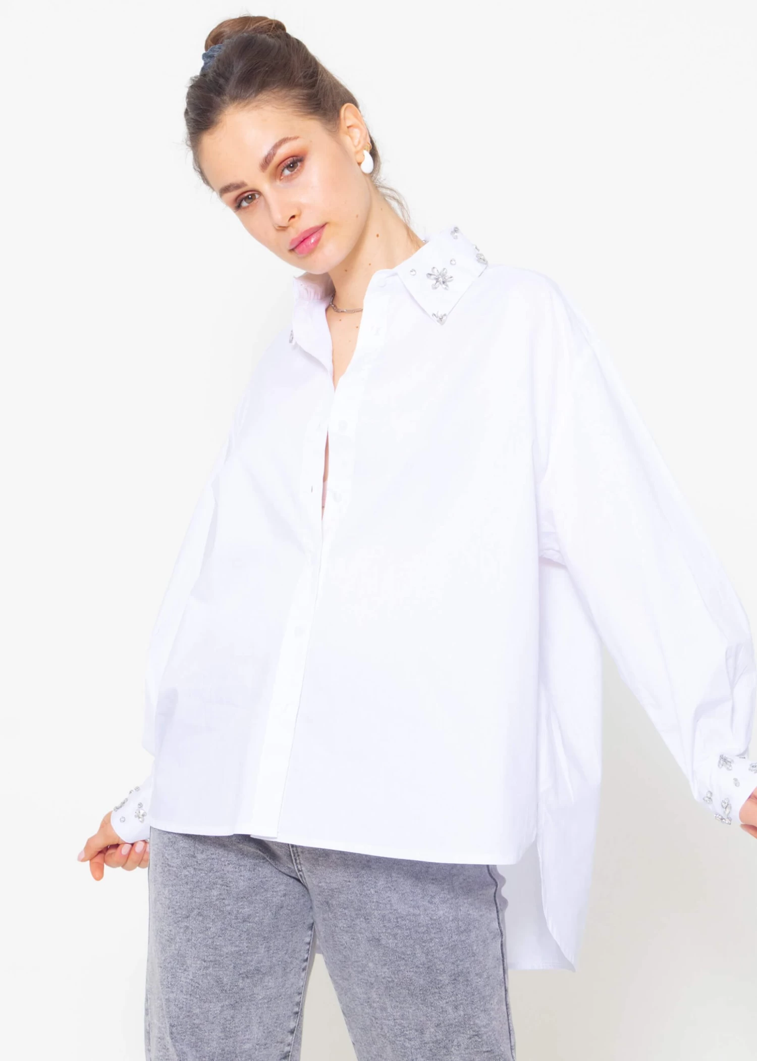 Diese exquisite Baumwollbluse verbindet klassische Eleganz mit spielerischen Details. Das Modell besitzt einen traditionellen Kragen sowie Manschetten an den langen Ärmeln, die durch sorgfältig platzierte Schmuckverzierungen in Form von Blumen und Einzelsteinchen aufgewertet werden. Dieses Designelement verleiht der Bluse ein funkelndes Highlight. Gefertigt aus hochwertiger Baumwolle, garantiert sie ein angenehmes und weiches Tragegefühl und verspricht Atmungsaktivität. Die Bluse besitzt eine lockere Passform, eine verlängerte Rückenpartie sowie eine durchgehende Knopfleiste. Dieses Kleidungsstück ist ein Ausdruck von femininer Raffinesse und kann mit einer schicken Hose für einen professionellen Look oder mit einer Jeans oder einem Rock für einen legeren, doch verfeinerten Freizeitstil kombiniert werden.