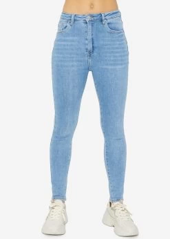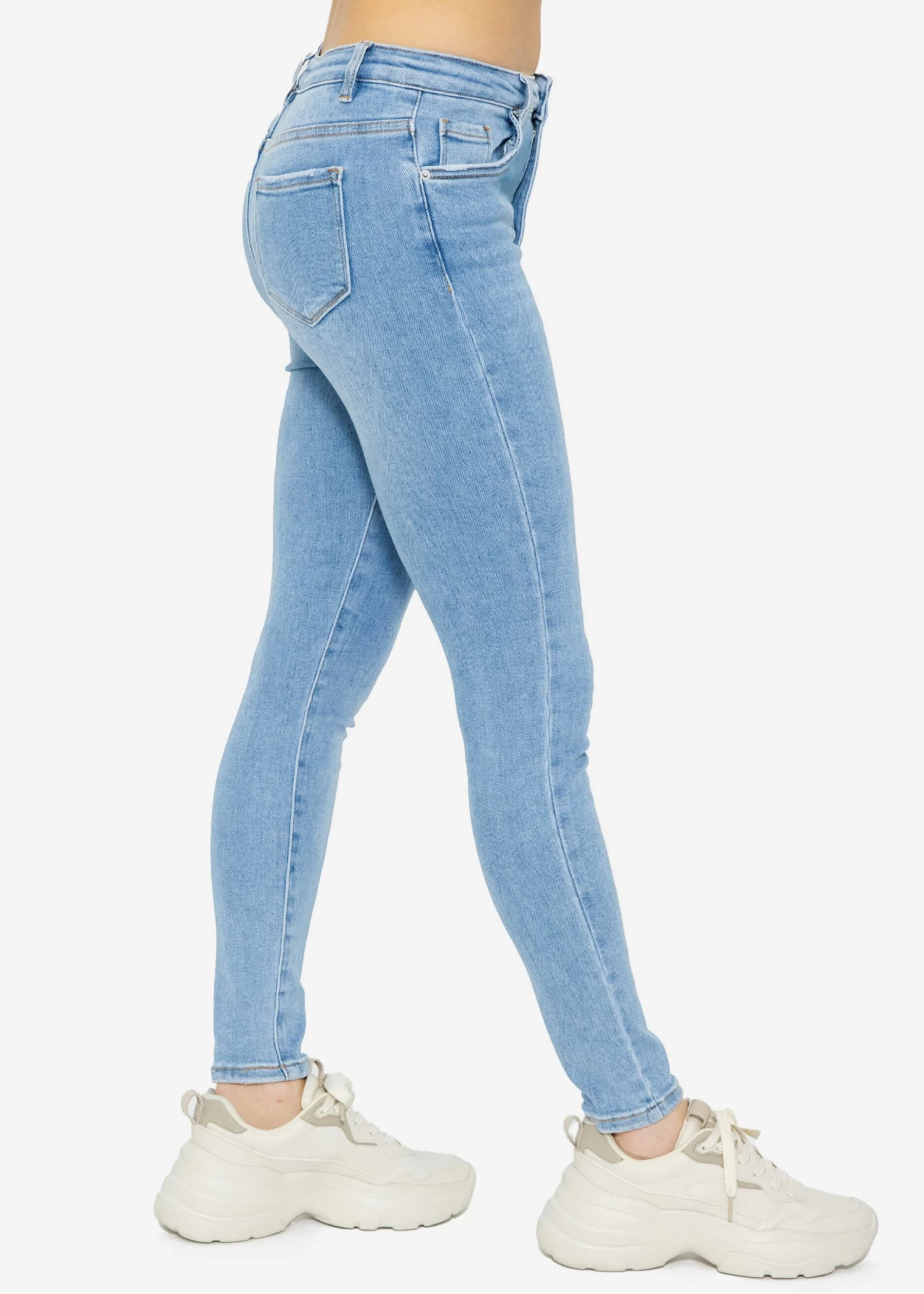 Enganliegende highwaist Jeans aus Denim mit Stretch. Sie ist im 5-pockets Style sowie in heller Waschung gehalten. Vorne besitzt sie sowohl einen Reißverschluss als auch einen Knopf.