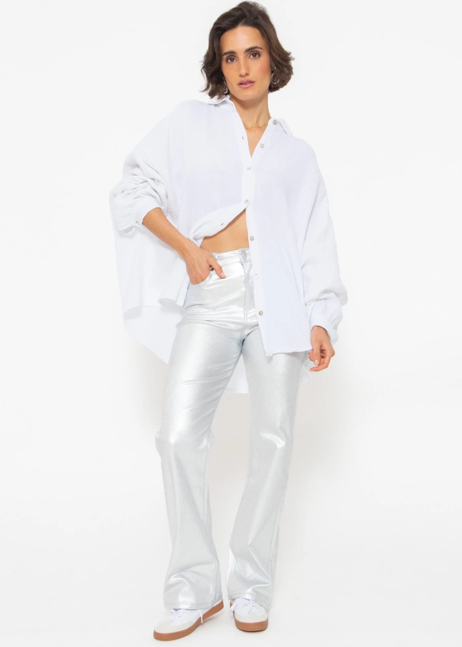 Diese schimmernde Jeans ist ein echter Hingucker, die Eleganz und Komfort in einem Straight-Leg-Design vereint. Ausgestattet mit einem praktischen Knopf- und Reißverschluss, sowie Gürtelschlaufen, präsentiert sie sich im klassischen 5-Pocket-Stil. Gefertigt aus einem hochwertigen, elastischen Baumwollgemisch, bietet diese Jeans ein weiches Tragegefühl und eine optimale Passform, die sich den ganzen Tag über angenehm anfühlt. Ob für den Tag oder den Abend, kombiniert mit schlichten Oberteilen oder im kompletten Glamour-Look – diese Hose verspricht vielseitige Einsatzmöglichkeiten.