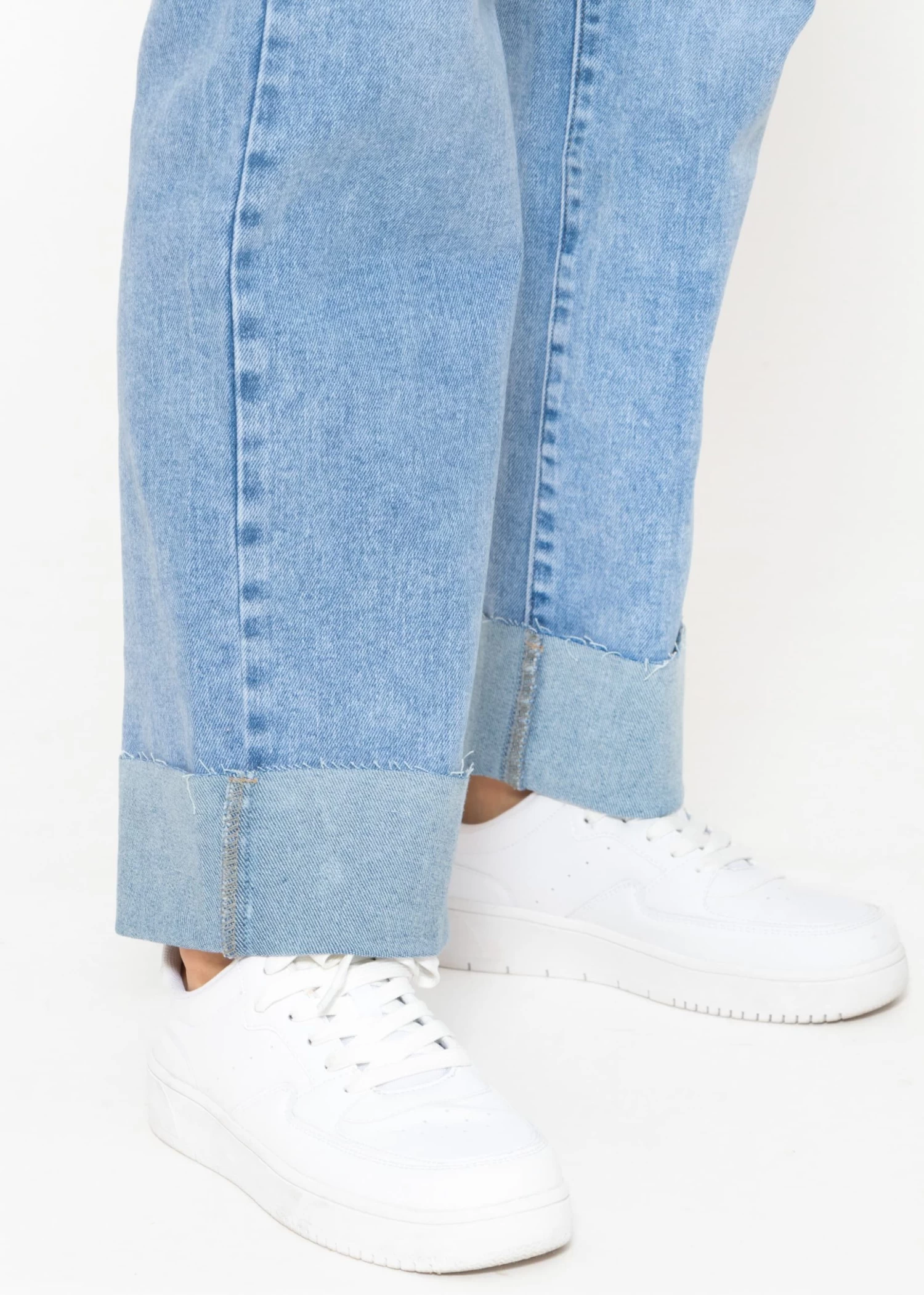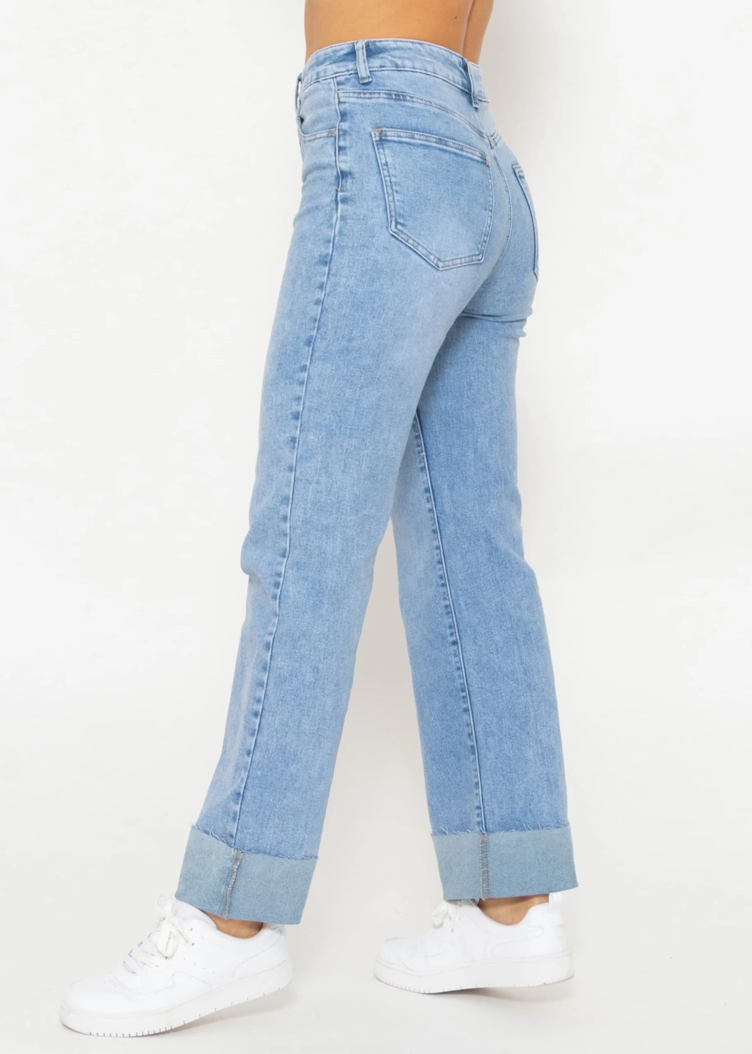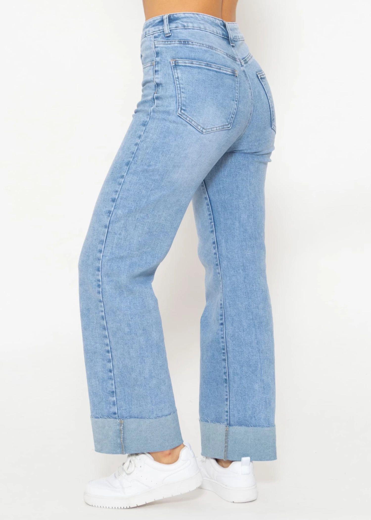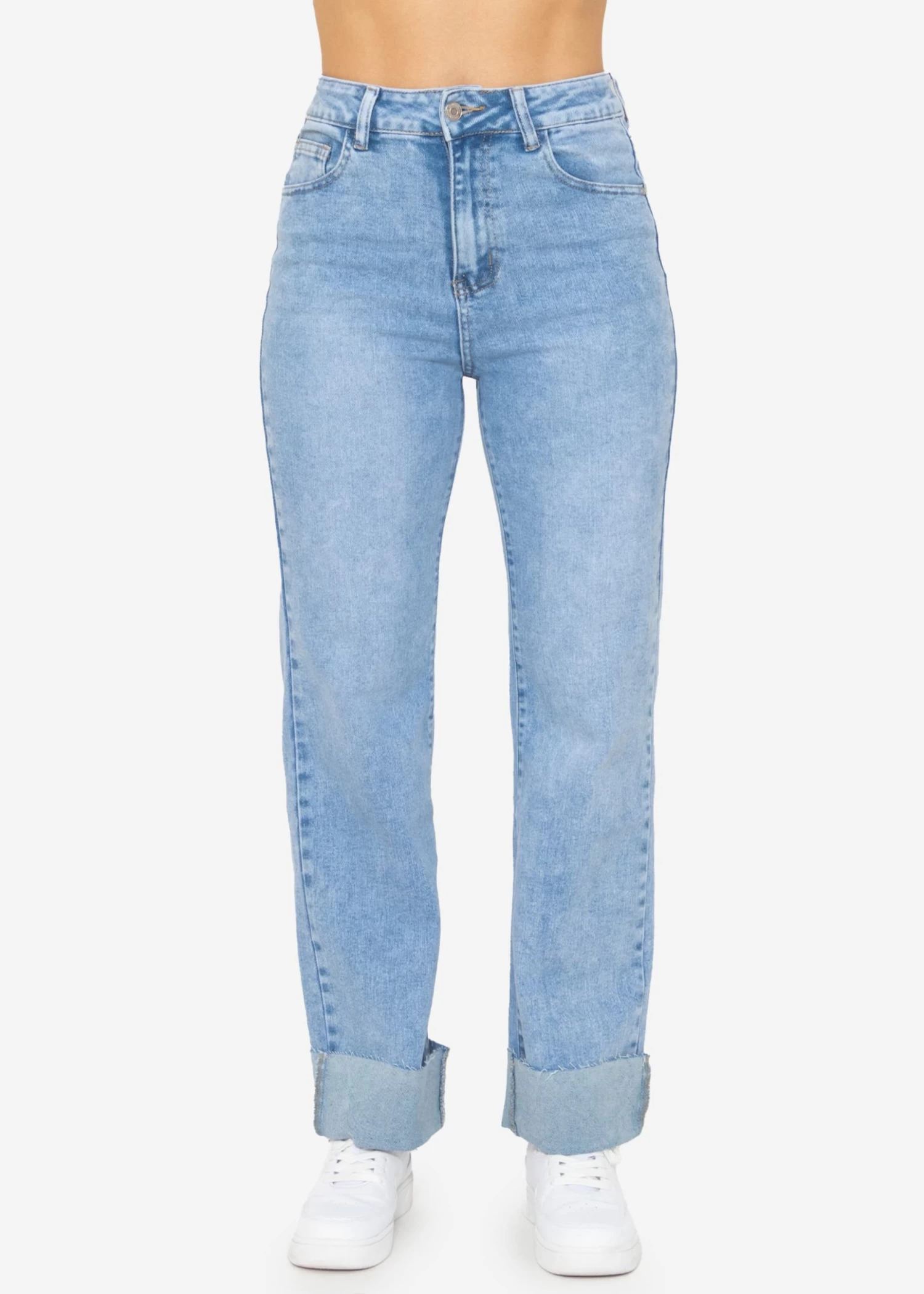 Diese Jeans ist ein Must-Have für jede modebewusste Frau und bekommt durch ihren auffälligen Saumumschlag eine modische Note. Ausgestattet mit einem praktischen Knopf- und Reißverschluss, sowie Gürtelschlaufen, präsentiert sie sich im klassischen 5-Pocket-Stil. Der High-Waist Schnitt sorgt für eine schmeichelhafte Taille, während das gerade Bein und die lockere Passform Bewegungsfreiheit garantieren. Gefertigt aus einem hochwertigen, elastischen Baumwollgemisch, bietet diese Jeans ein weiches Tragegefühl und eine optimale Passform, die sich den ganzen Tag über angenehm anfühlt.