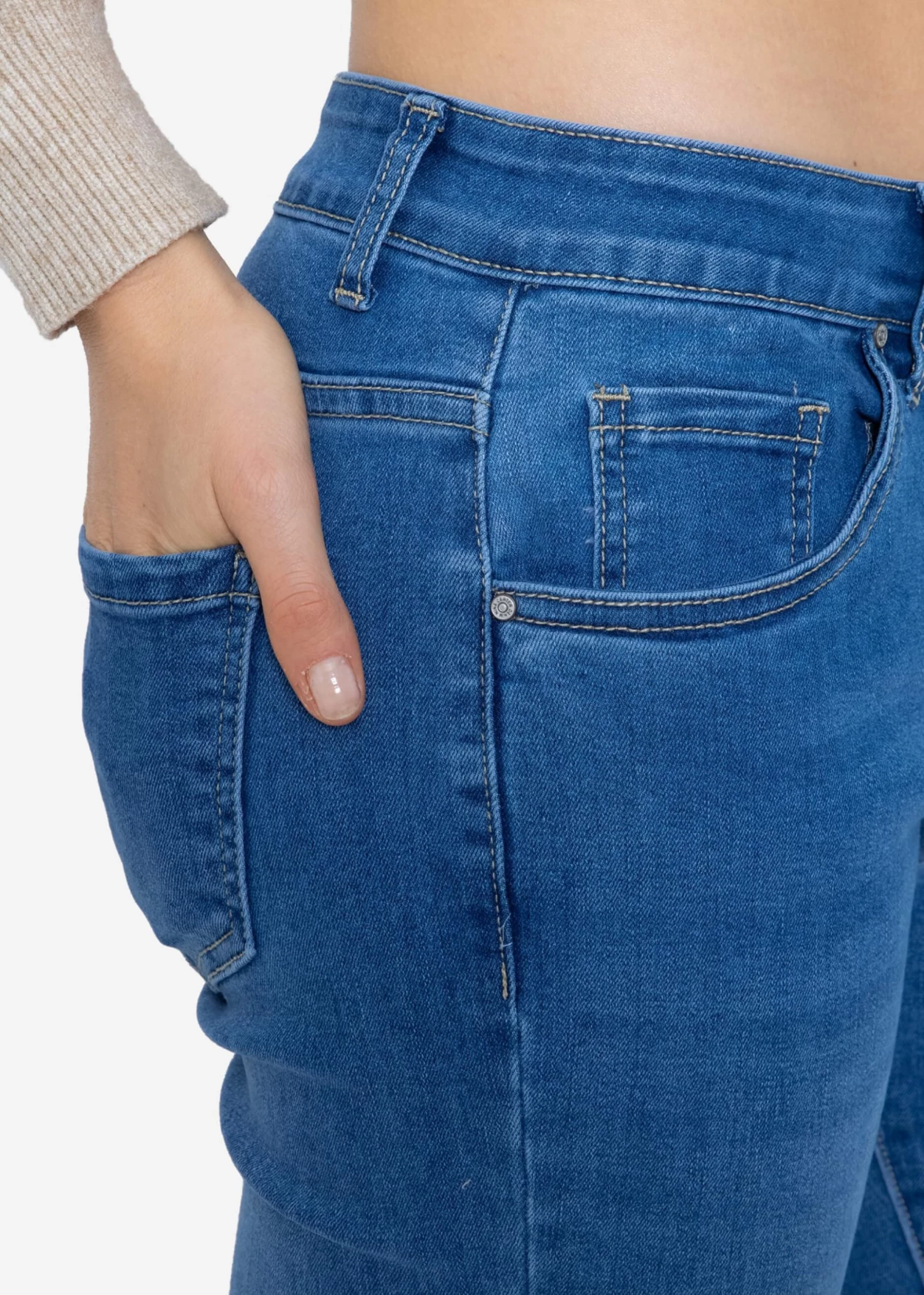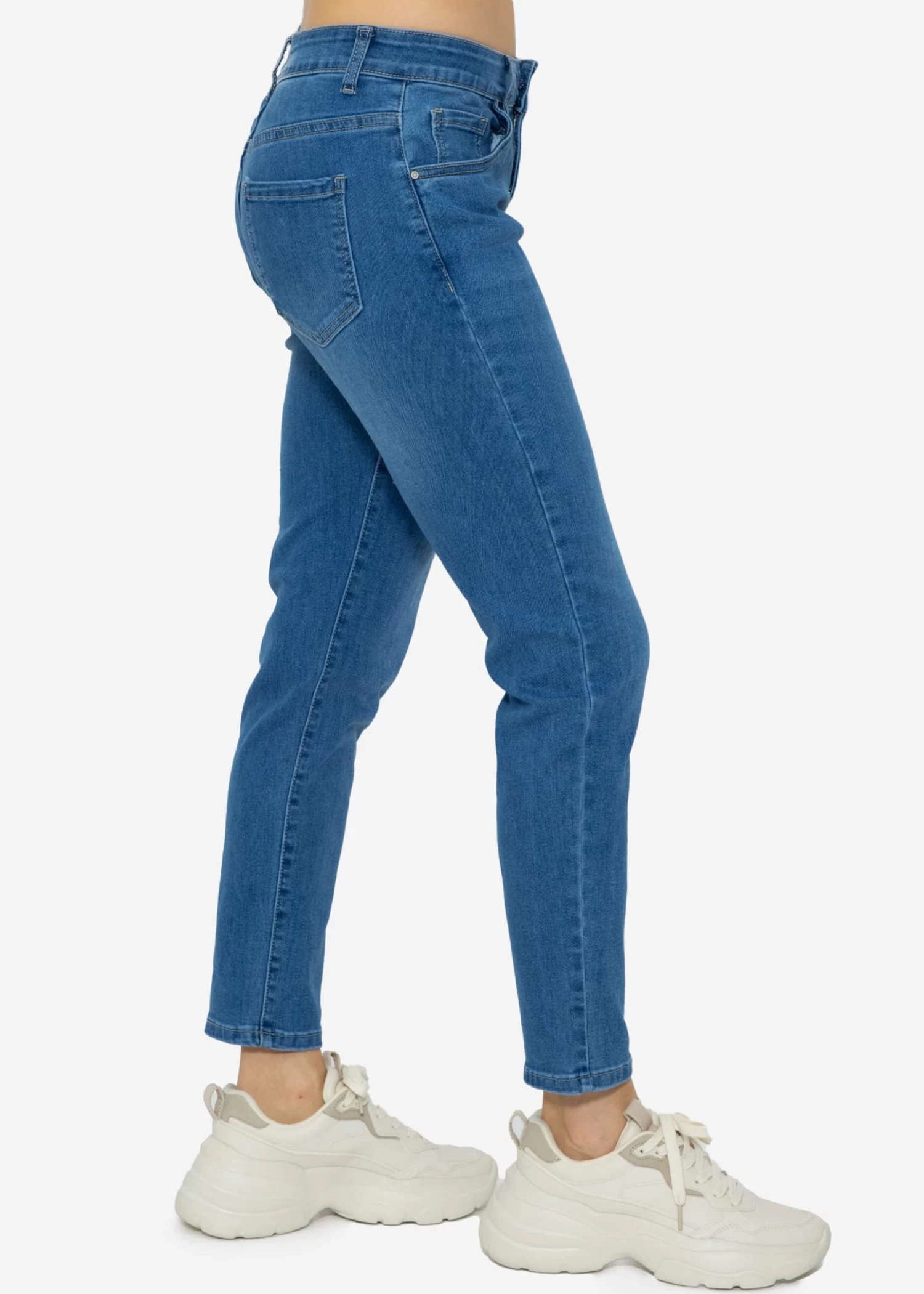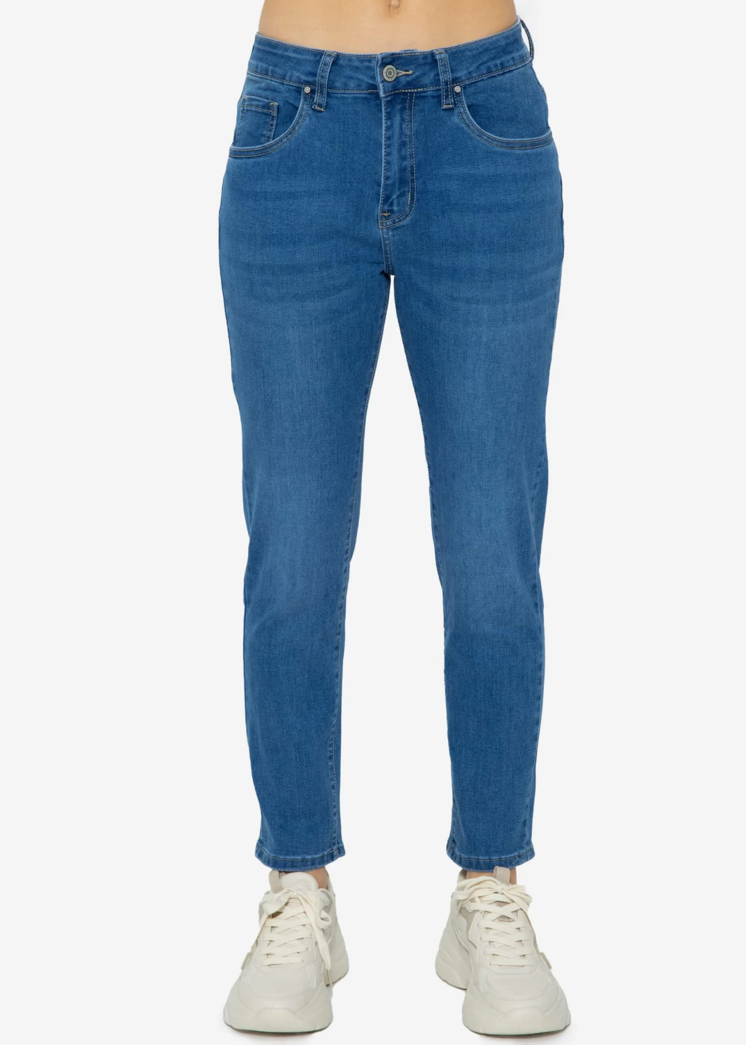Highwaist Relax Fit Jeans aus Denim in 5-pockets Design. Der etwas lockerere Sitz macht sie zu einem idealen Basic-Piece. Die Hose wird mit Knopf und Reißverschluss geschlossen.