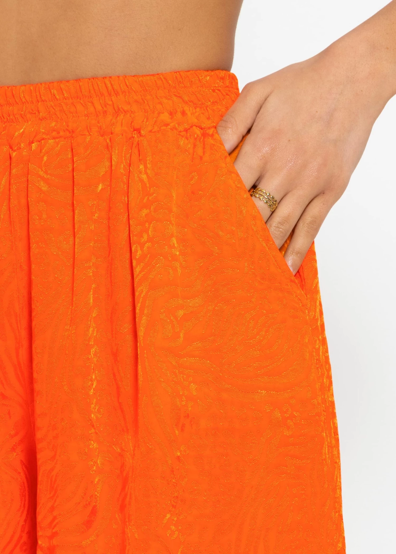 Diese leuchtende Jacquard-Shorts ist ein sommerlicher Hingucker, der Komfort und Stil auf lebendige Weise vereint. Hergestellt aus weicher Viskose, die für ihre fließende Qualität und Atmungsaktivität bekannt ist, ist sie die ideale Wahl für warme Tage. Das charakteristische Jacquard-Gewebe verleiht den Shorts eine strukturierte Oberfläche mit einem subtilen Webmuster, das für Tiefe und Eleganz sorgt. Das Modell verfügt über praktische Seitentaschen, die nicht nur funktionell sind, sondern dem legeren Schnitt auch eine lässige Note hinzufügen. Der geraffte Gummibund sorgt für eine flexible Passform, die sich bequem an die Silhouette anpasst und den ganzen Tag bequem zu tragen ist. Für einen einheitlichen Look ist eine passende Bluse im gleichen Jacquard-Design erhältlich.
