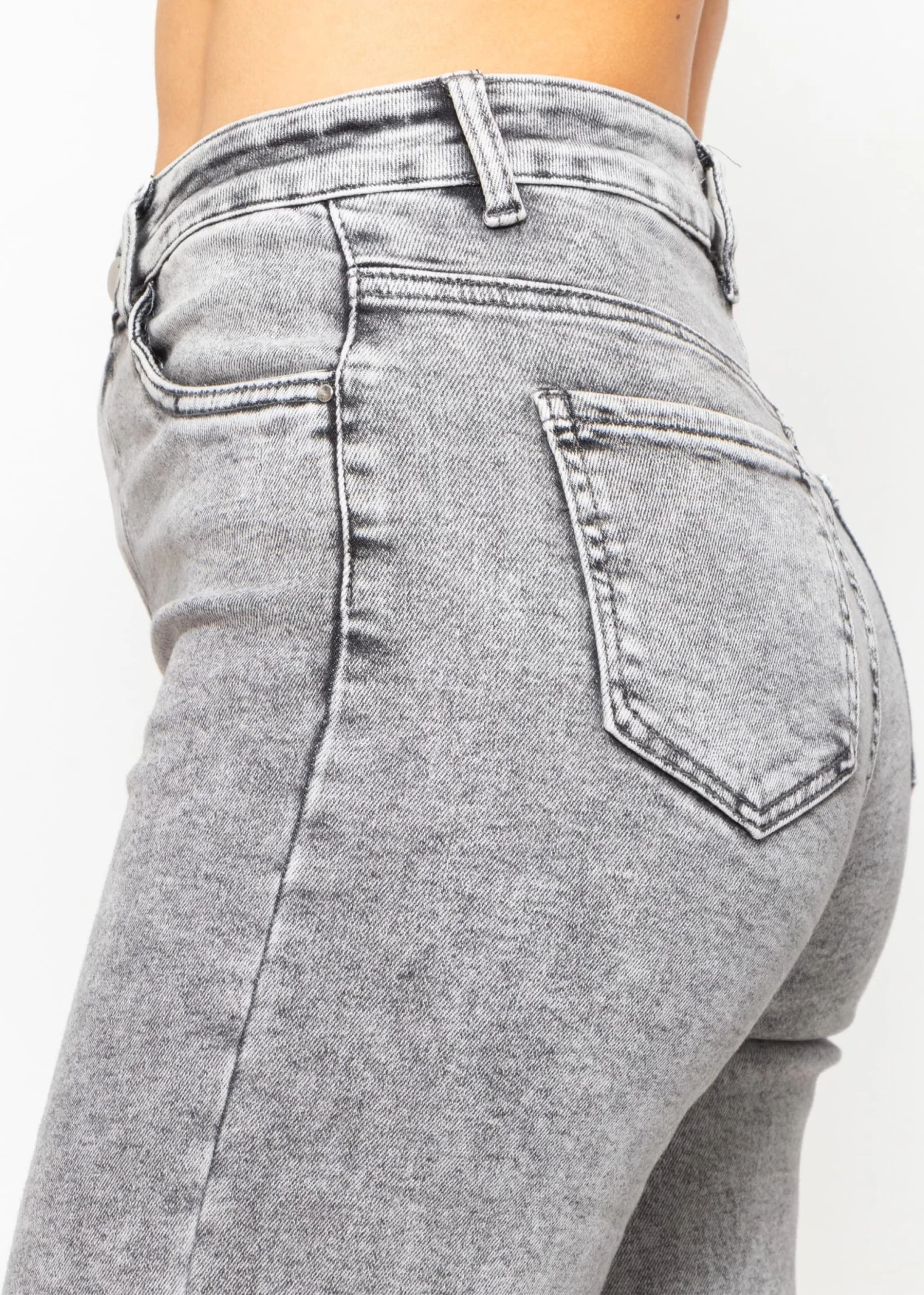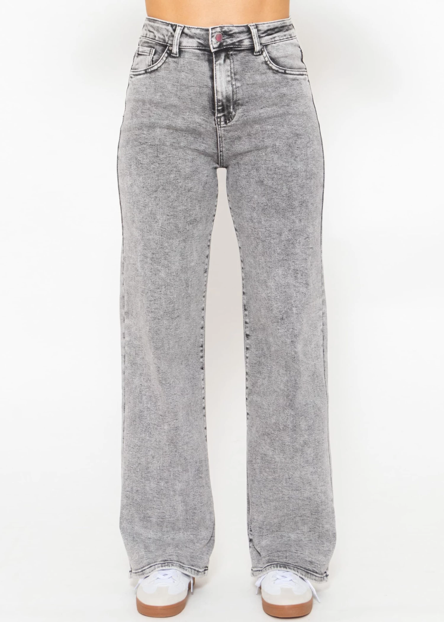 Diese stilvolle Jeans vereint Komfort mit modernem Design. Ausgestattet mit einem praktischen Knopf- und Reißverschluss, sowie Gürtelschlaufen, präsentiert sie sich im klassischen 5-Pocket-Stil. Der High-Waist Schnitt sorgt für eine schmeichelhafte Taille, während das weite Bein und die lockere Passform Bewegungsfreiheit garantieren. Gefertigt aus einem hochwertigen, elastischen Baumwollgemisch, bietet diese Jeans ein weiches Tragegefühl und eine optimale Passform, die sich den ganzen Tag über angenehm anfühlt. Ihre lässige Eleganz macht sie zum idealen Begleiter für schöne Oversize Pullover oder Tops, wodurch vielseitige Looks für jede Gelegenheit kreiert werden können.