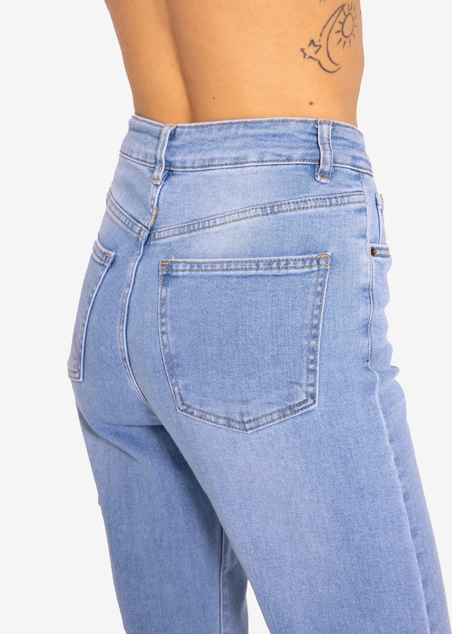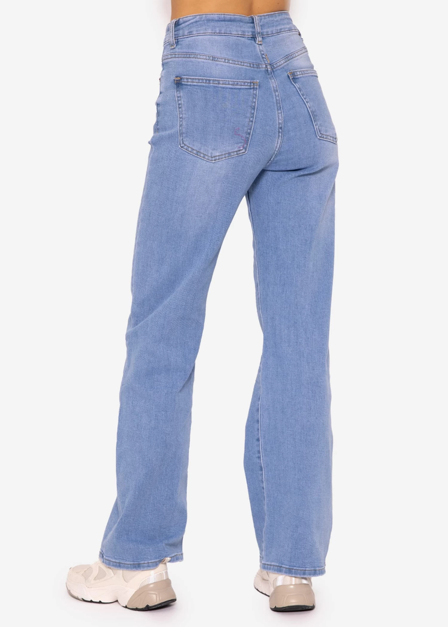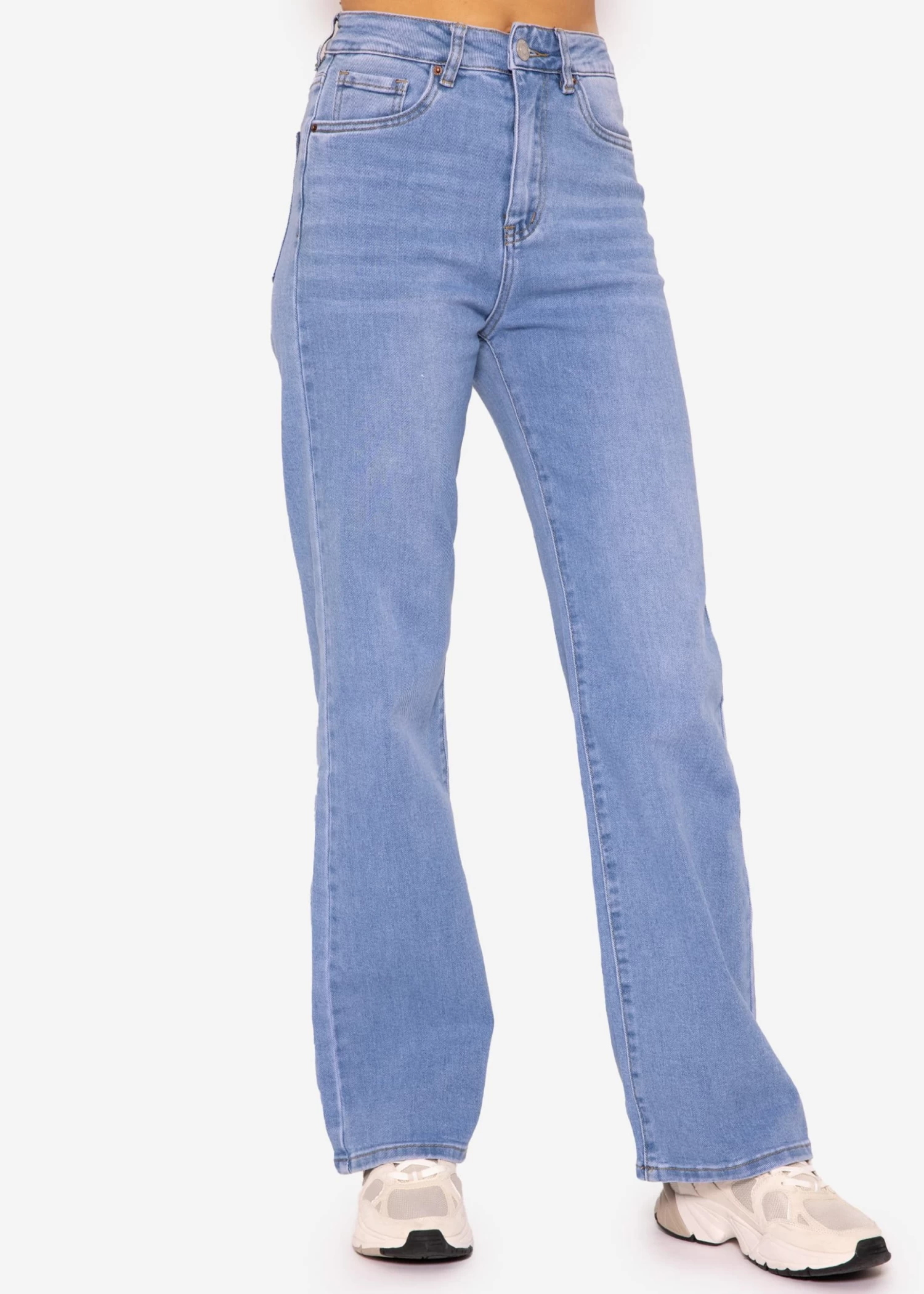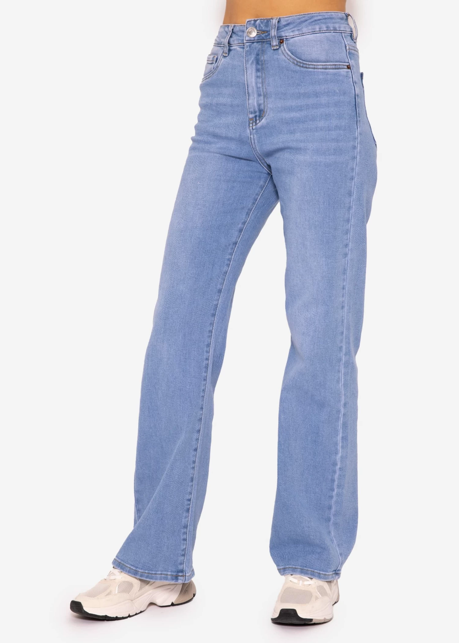 Jeans mit weitem Bein aus Denim in Hellblau. Das Modell besitzt einen Knopf- und Reißverschluss, Gürtelschlaufen und ist im 5-pockets Design gehalten. Die Jeans verfügt über einen femininen hohen Bund, ein weites Bein und eine normale Beinlänge. Sie ist eine Alltagsjeans, die aus einem robusten Baumwollgemisch gefertigt ist. Die lässige Silhouette lässt sich optimal mit anliegenden Pullovern oder Tops kombinieren.