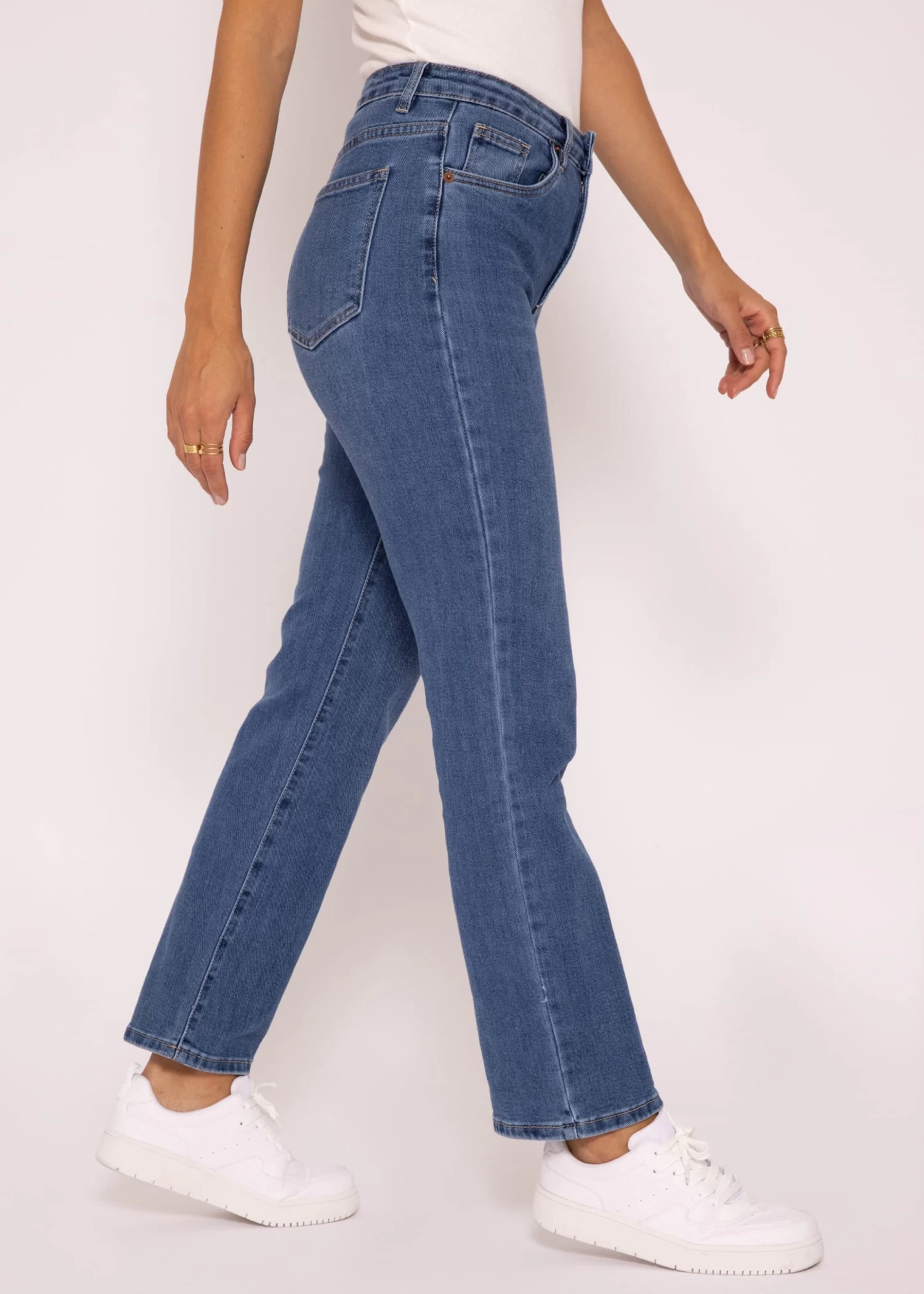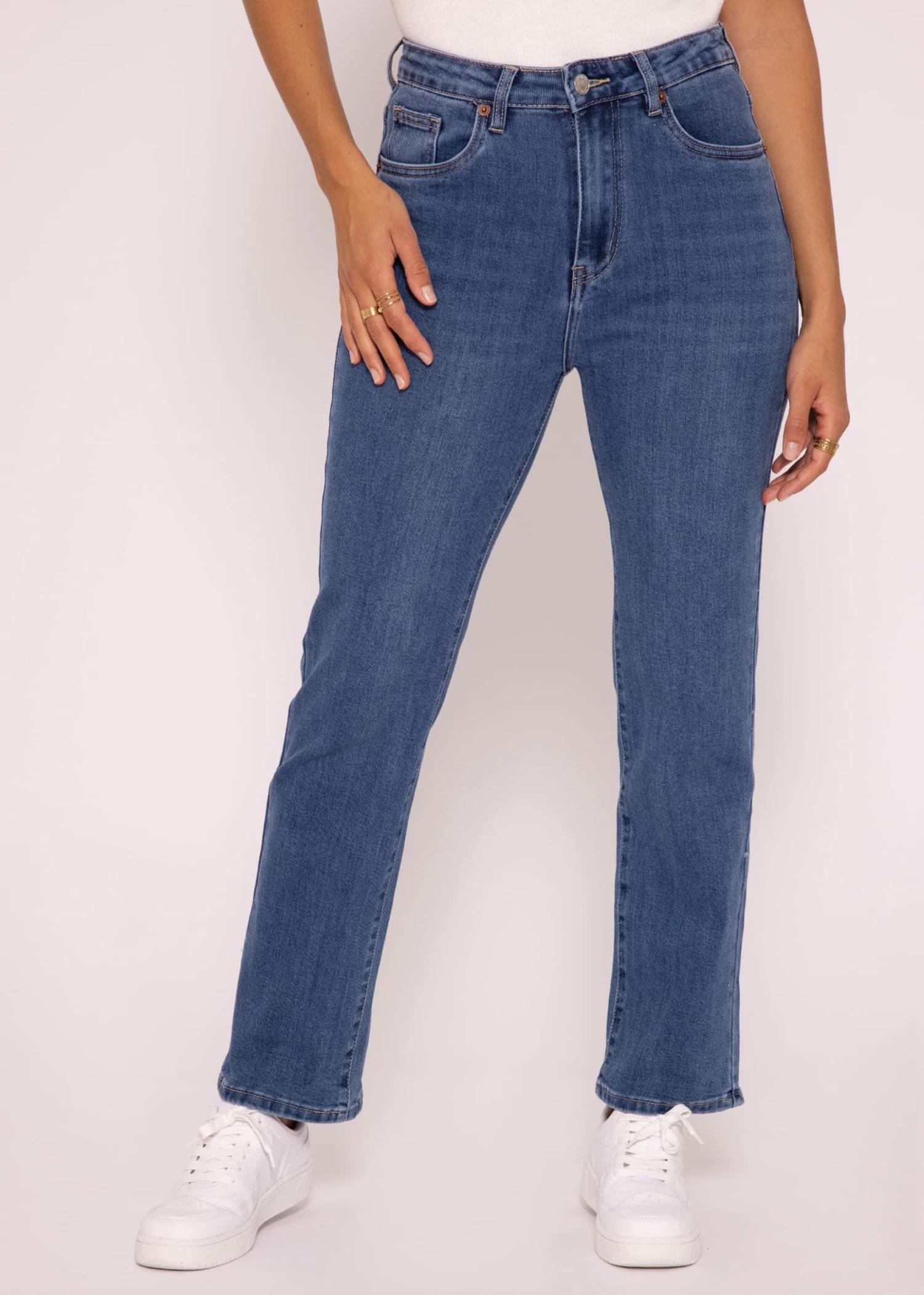 Jeans mit weitem Bein aus Denim in einem mittleren Blau. Das Modell besitzt einen Knopf- und Reißverschluss, Gürtelschlaufen und ist im 5-pockets Design gehalten. Die Jeans verfügt über einen femininen hohen Bund, ein weites Bein und eine normale Beinlänge. Sie ist eine Alltagsjeans, die aus einem robusten Baumwollgemisch gefertigt ist. Die lässige Silhouette lässt sich optimal mit anliegenden Pullovern oder Tops kombinieren.