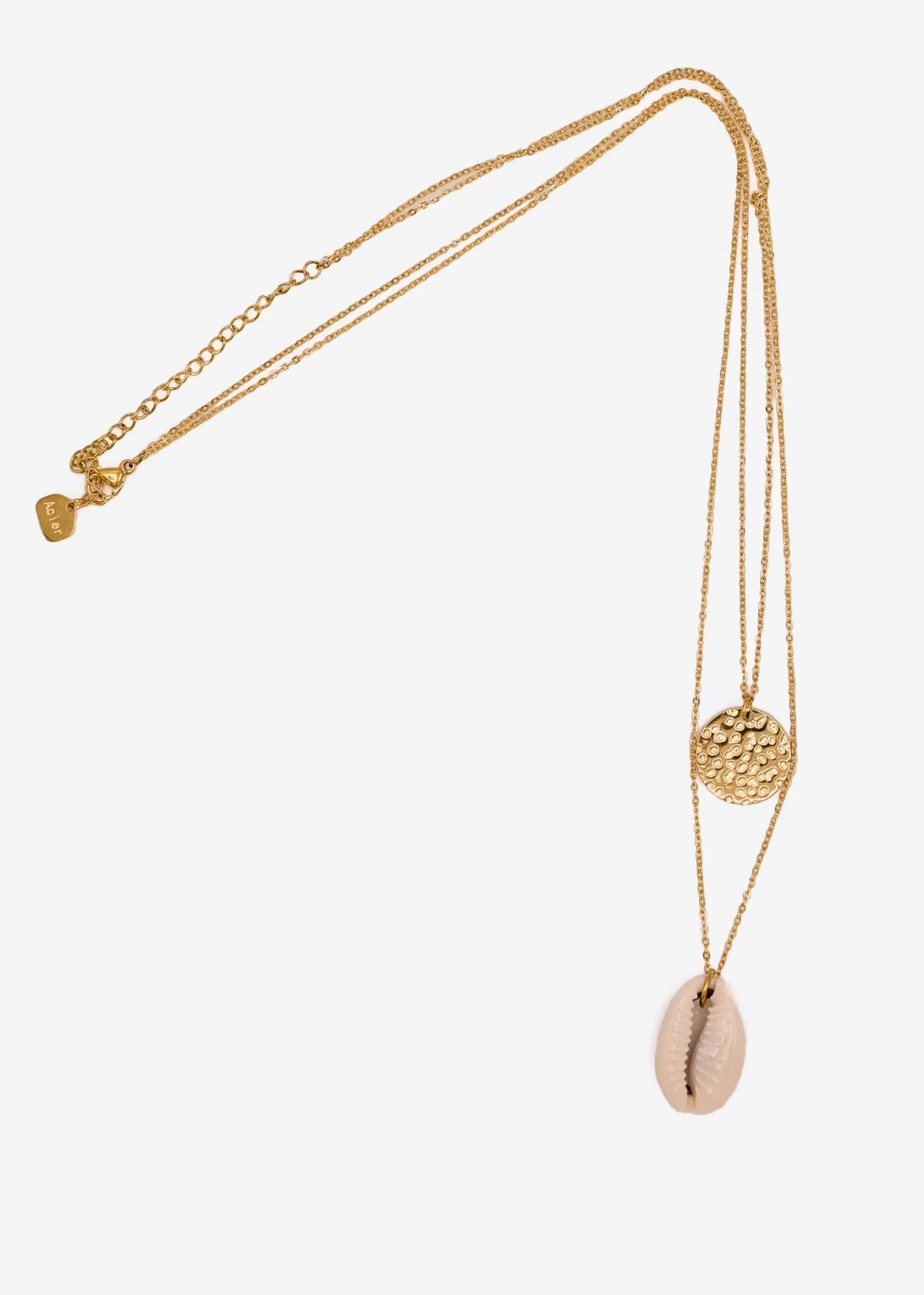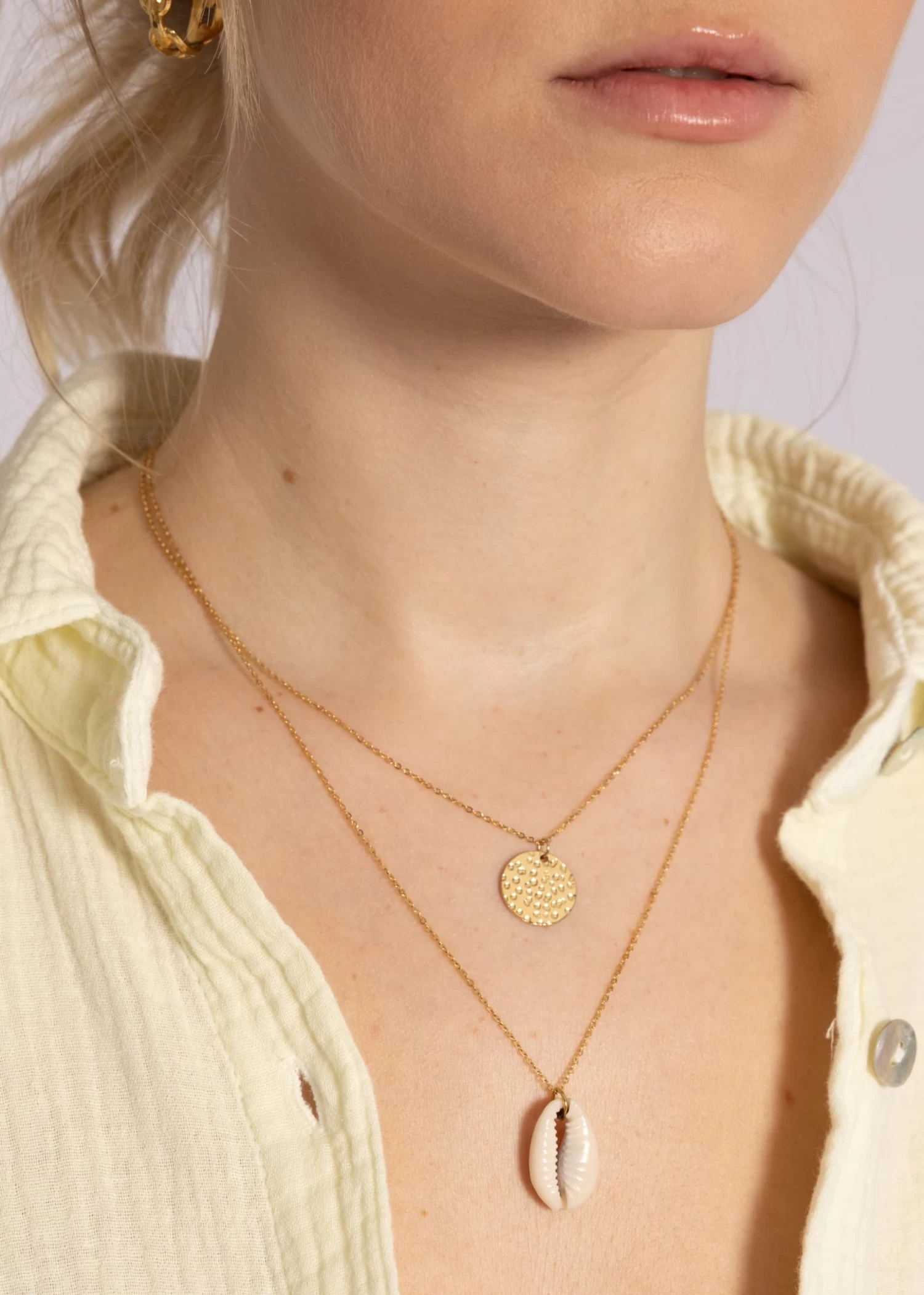 Kombinierte Halskette bestehend aus 2 zarten Gliederketten in verschiedenen Längen. Ein runder gehämmerter Anhänger und eine Muschel als Eyecatcher runden das Design der Kette ab. Die Kette ist längenverstellbar.