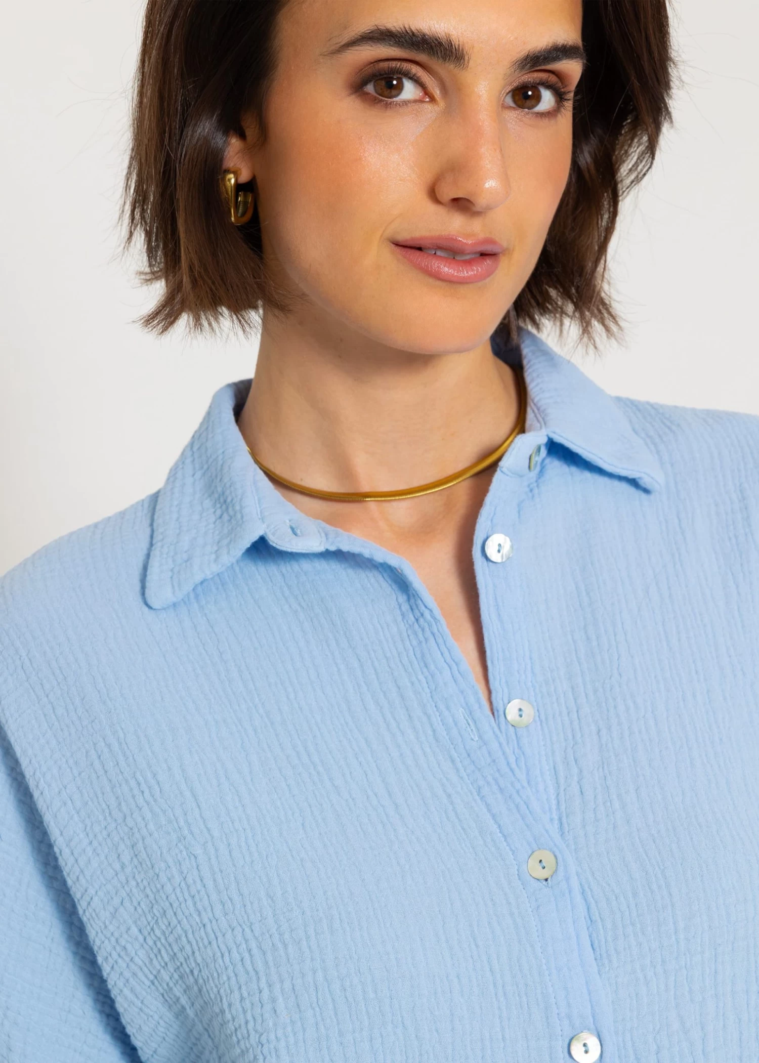 Diese Bluse in einem verkürzten Schnitt präsentiert sich in einem angesagten Musselin-Gewebe, das durch seine strukturierte Oberfläche und luftige Beschaffenheit besticht und somit eine perfekte Symbiose aus modischem Anspruch und sommerlichem Tragekomfort schafft. Das Modell besitzt klassische Details, wie einen Kragen und eine durchgehende Knopfleiste. Kurze Ärmel und der Oversize Schnitt geben der Bluse sportliche Details. In schlichtem Design gehalten, lässt sie sich mühelos in jede bestehende Garderobe integrieren.