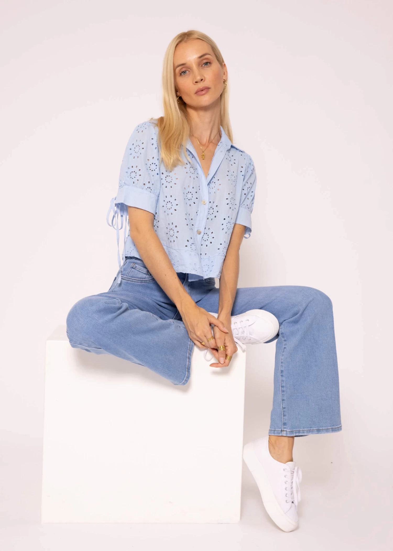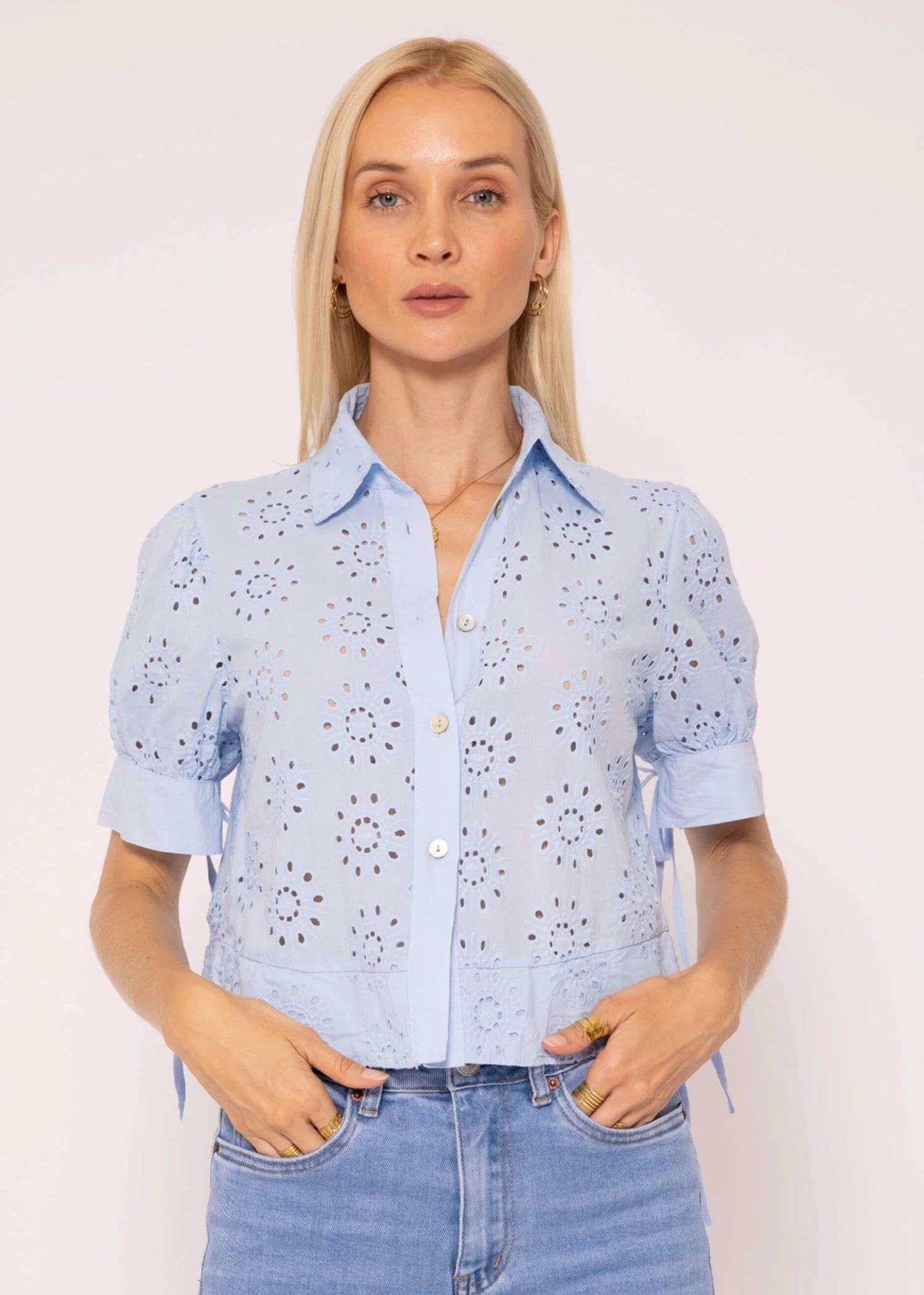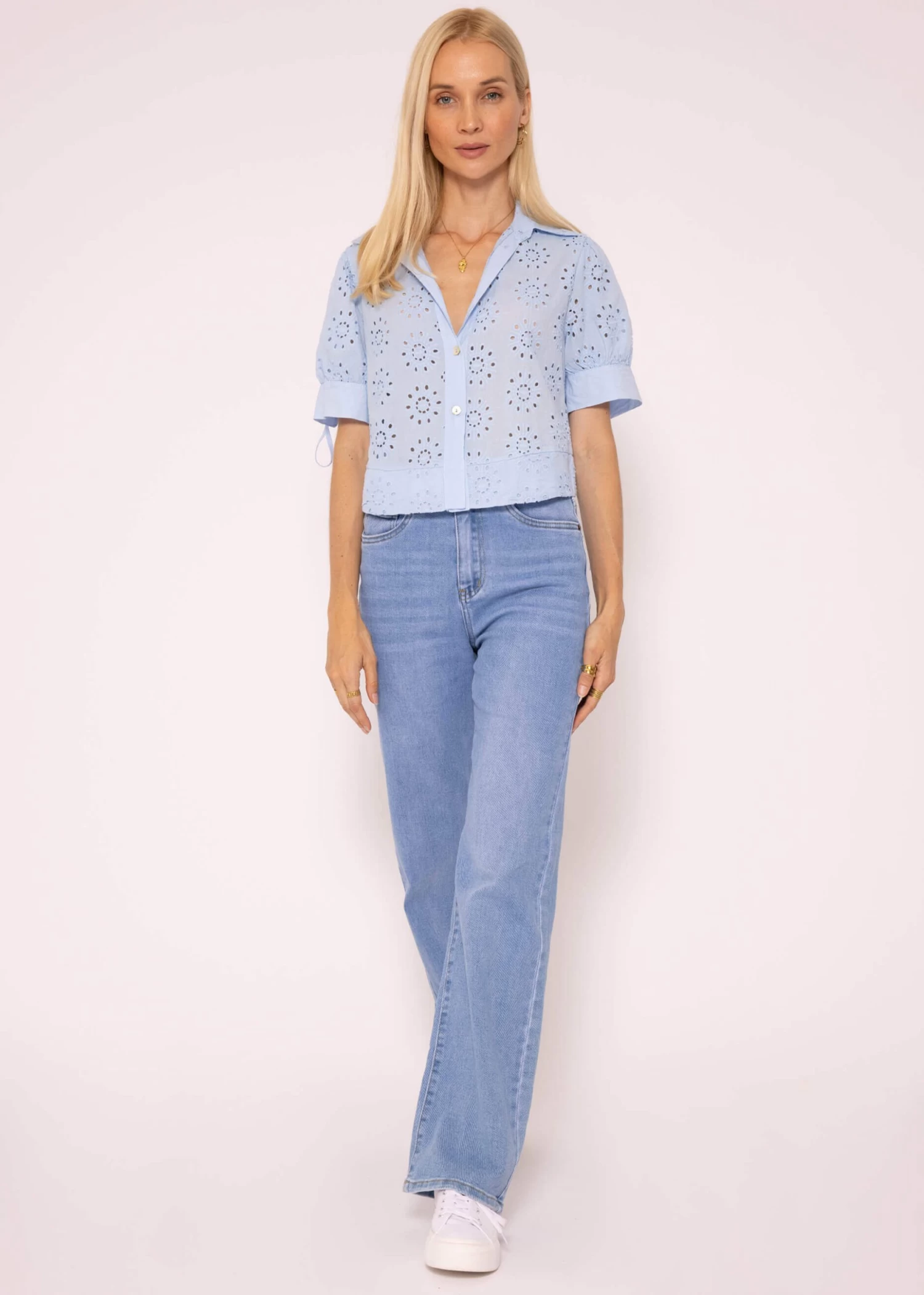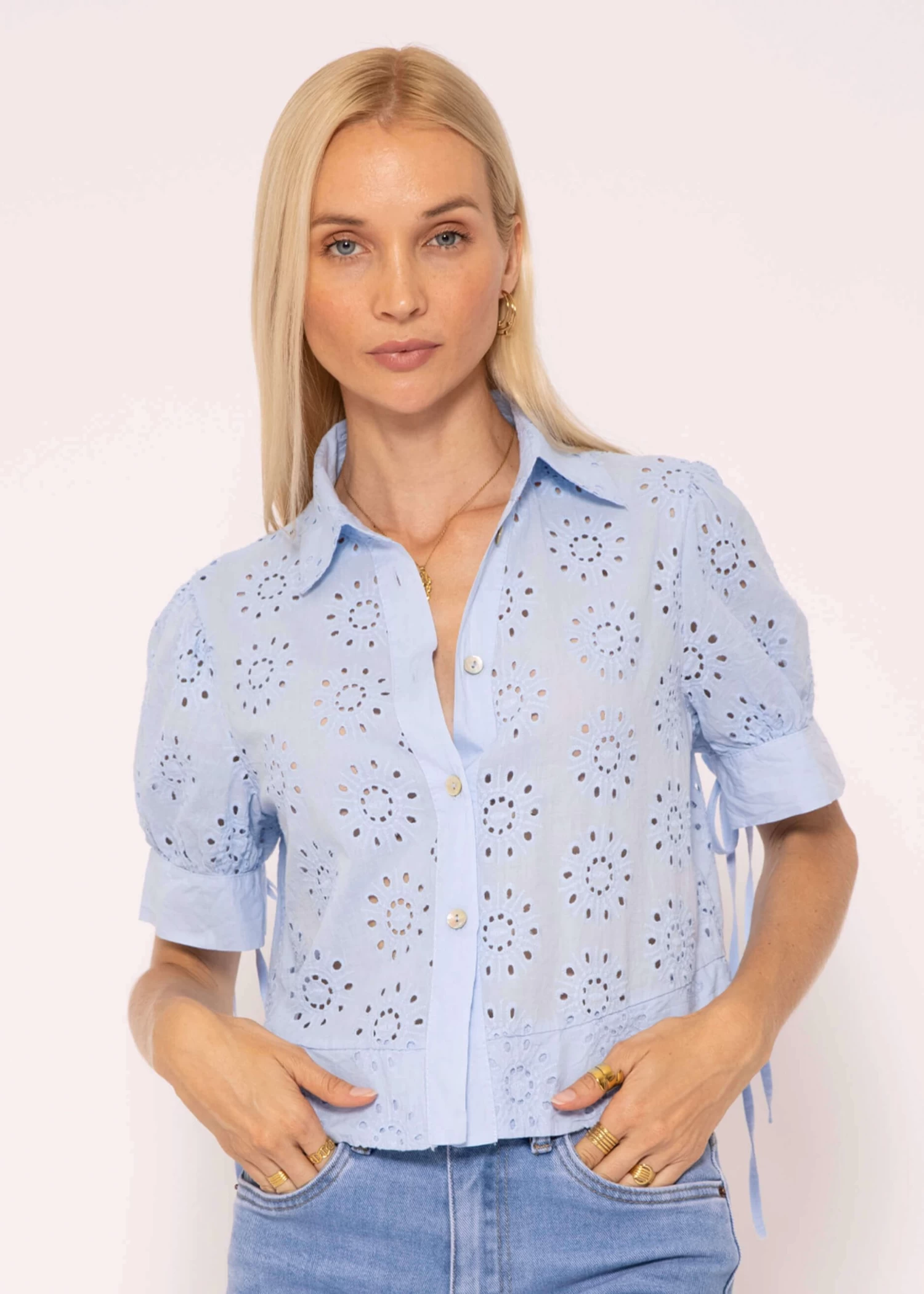 Diese Kurzarm Spitzenbluse kommt in einer lockeren, luftigen Passform und verströmt eine charmante Ausstrahlung. Die verkürzte Länge sorgt für einen modernen Touch, während der kastige Schnitt eine bequeme und lässige Passform sicherstellt. Das Modell besitzt klassische Details wie Kragen, V-Ausschnitt und Knopfleiste, die der Bluse zeitlose Eleganz verleihen. Bindebänder an den Ärmelblenden, die zu Schleifen gebunden werden können, setzen einen niedlichen Akzent und das feine Lochmuster trägt zu einer edlen, raffinierten Note bei. Kombiniere es ganz einfach zu deiner Lieblingshose.