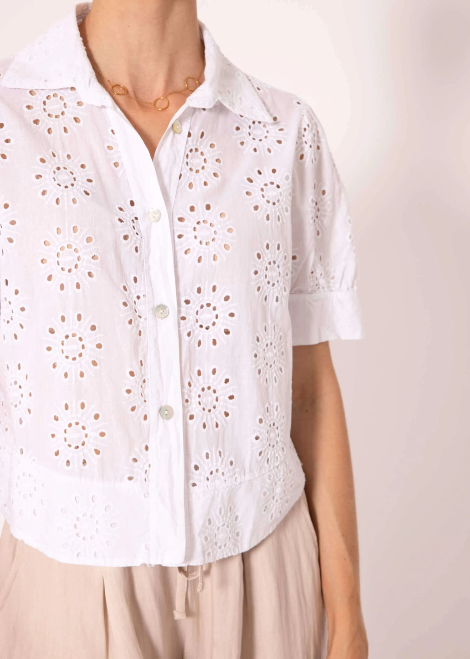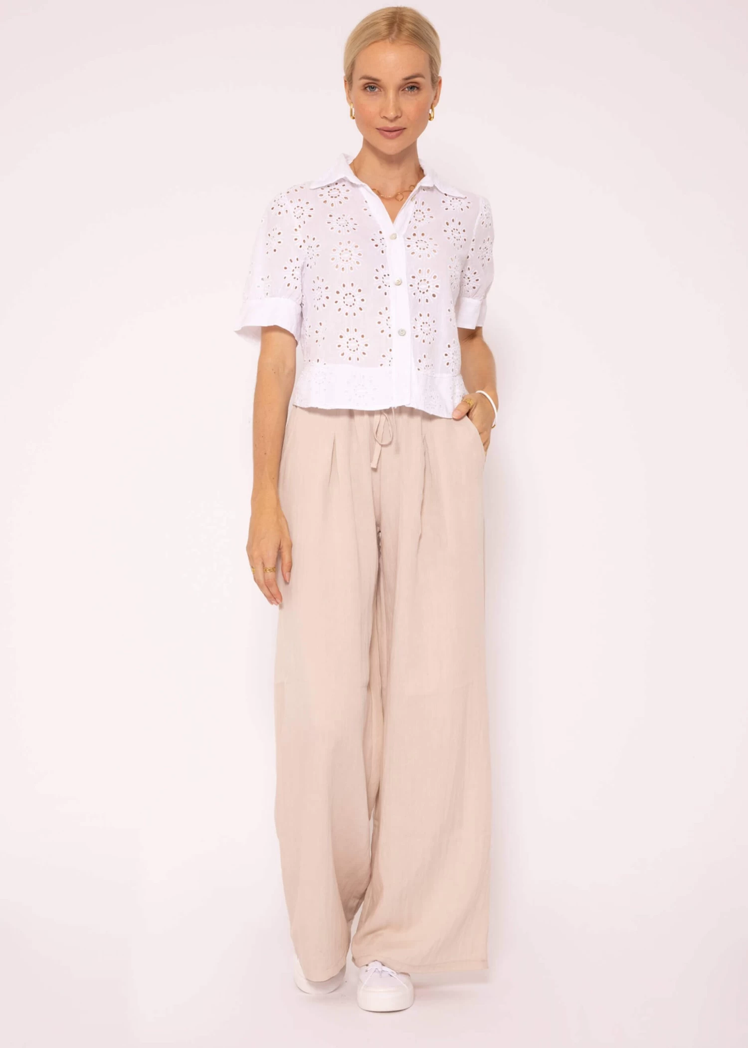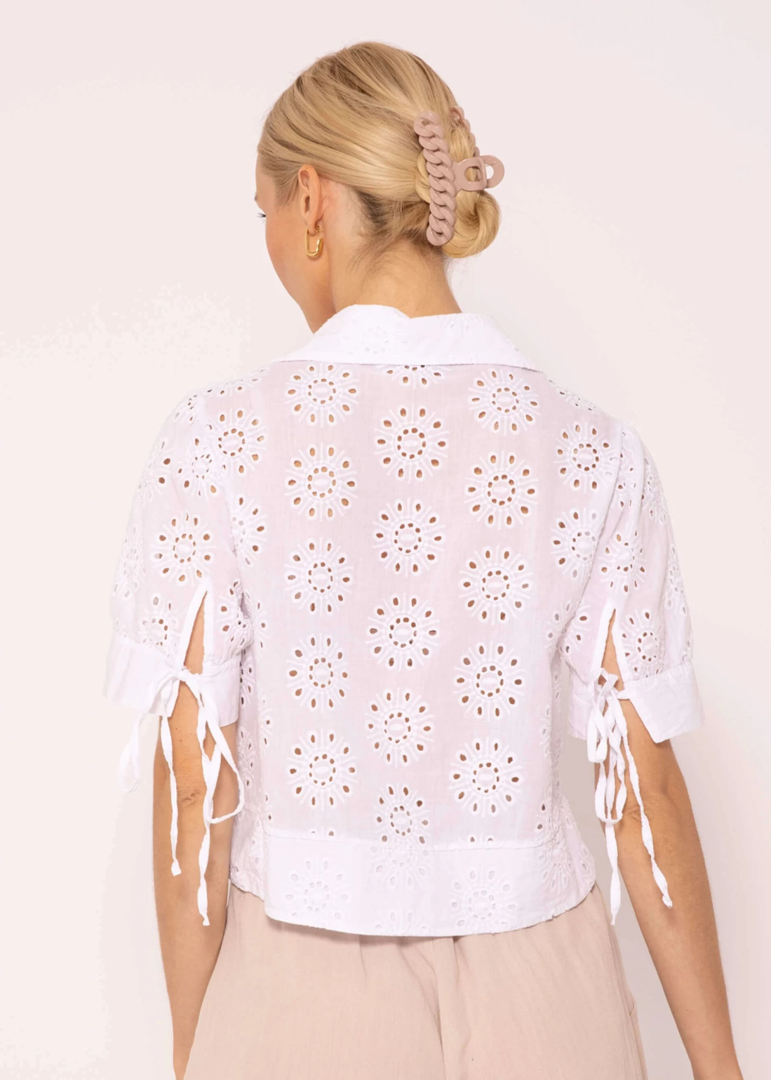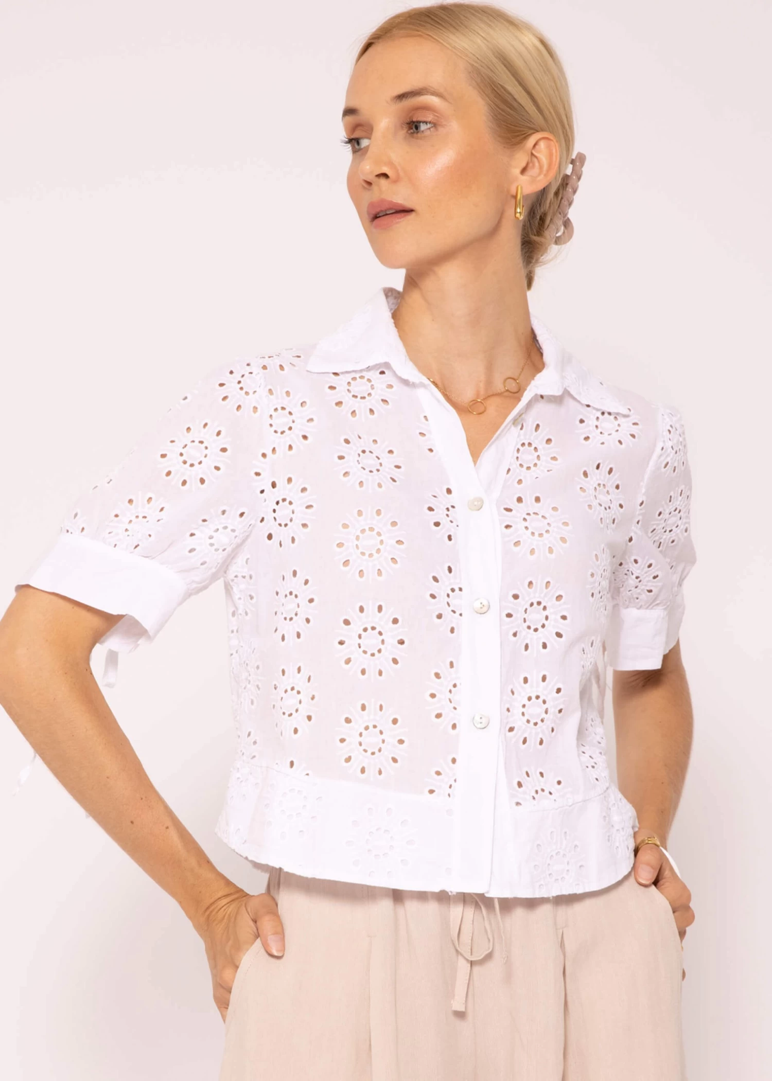 Diese Kurzarm Spitzenbluse kommt in einer lockeren, luftigen Passform und verströmt eine charmante Ausstrahlung. Die verkürzte Länge sorgt für einen modernen Touch, während der kastige Schnitt eine bequeme und lässige Passform sicherstellt. Das Modell besitzt klassische Details wie Kragen, V-Ausschnitt und Knopfleiste, die der Bluse zeitlose Eleganz verleihen. Bindebänder an den Ärmelblenden, die zu Schleifen gebunden werden können, setzen einen niedlichen Akzent und das feine Lochmuster trägt zu einer edlen, raffinierten Note bei. Kombiniere es ganz einfach zu deiner Lieblingshose.