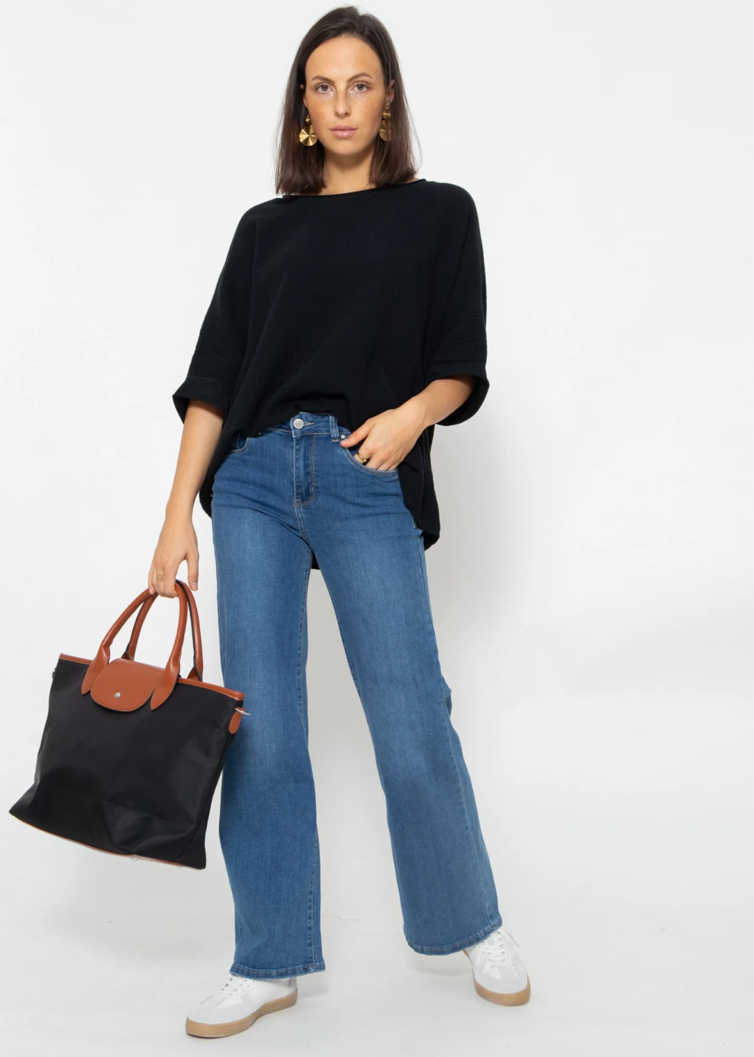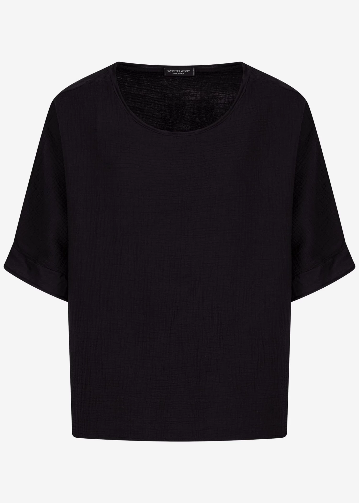 Das super coole Musselinshirt ist am Ausschnitt und an den Ärmeln mit farblich abgestimmten Jersey Blenden versehen und besitzt eine bequeme Oversize-Passform. Empfohlen bis Größe 44