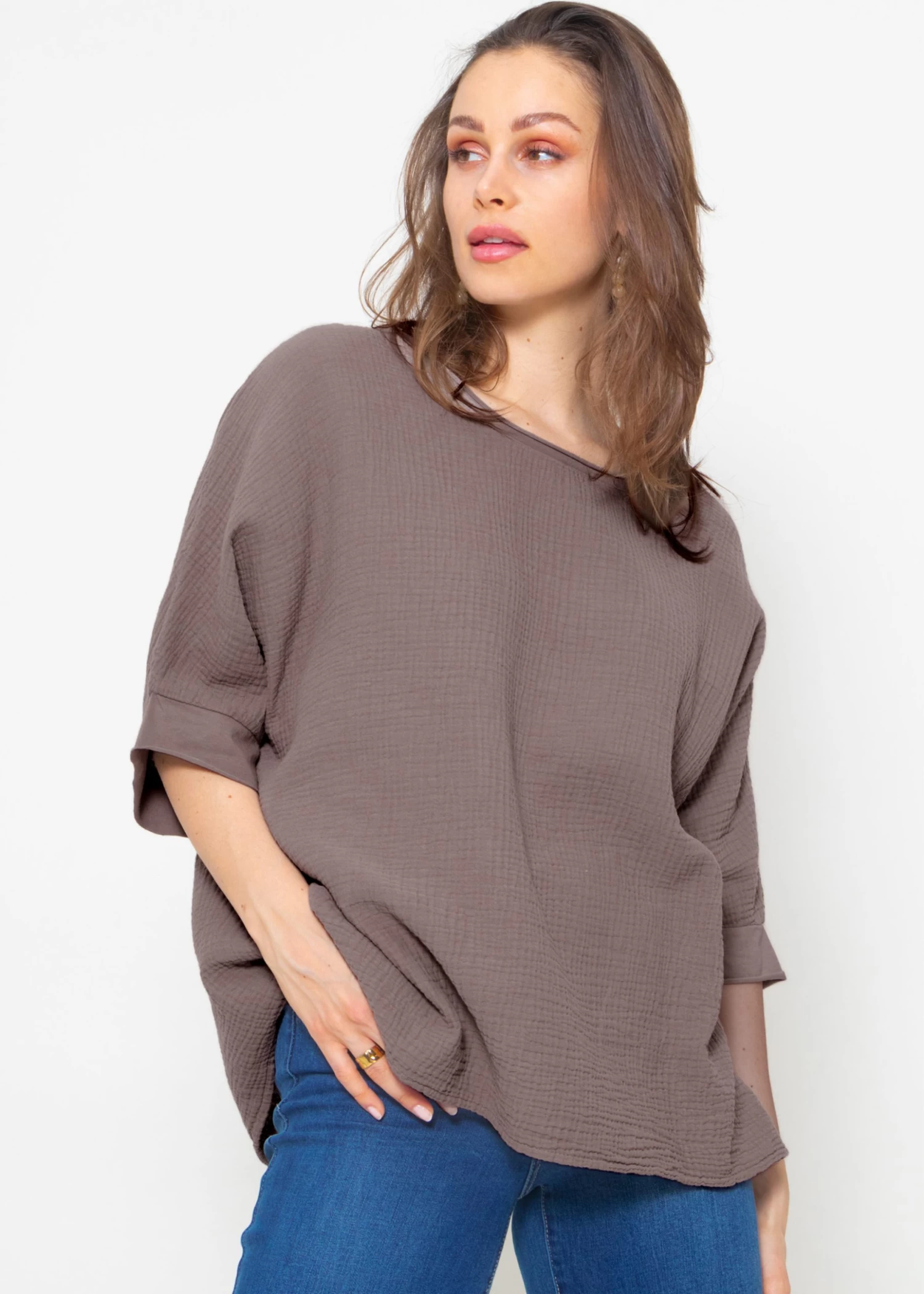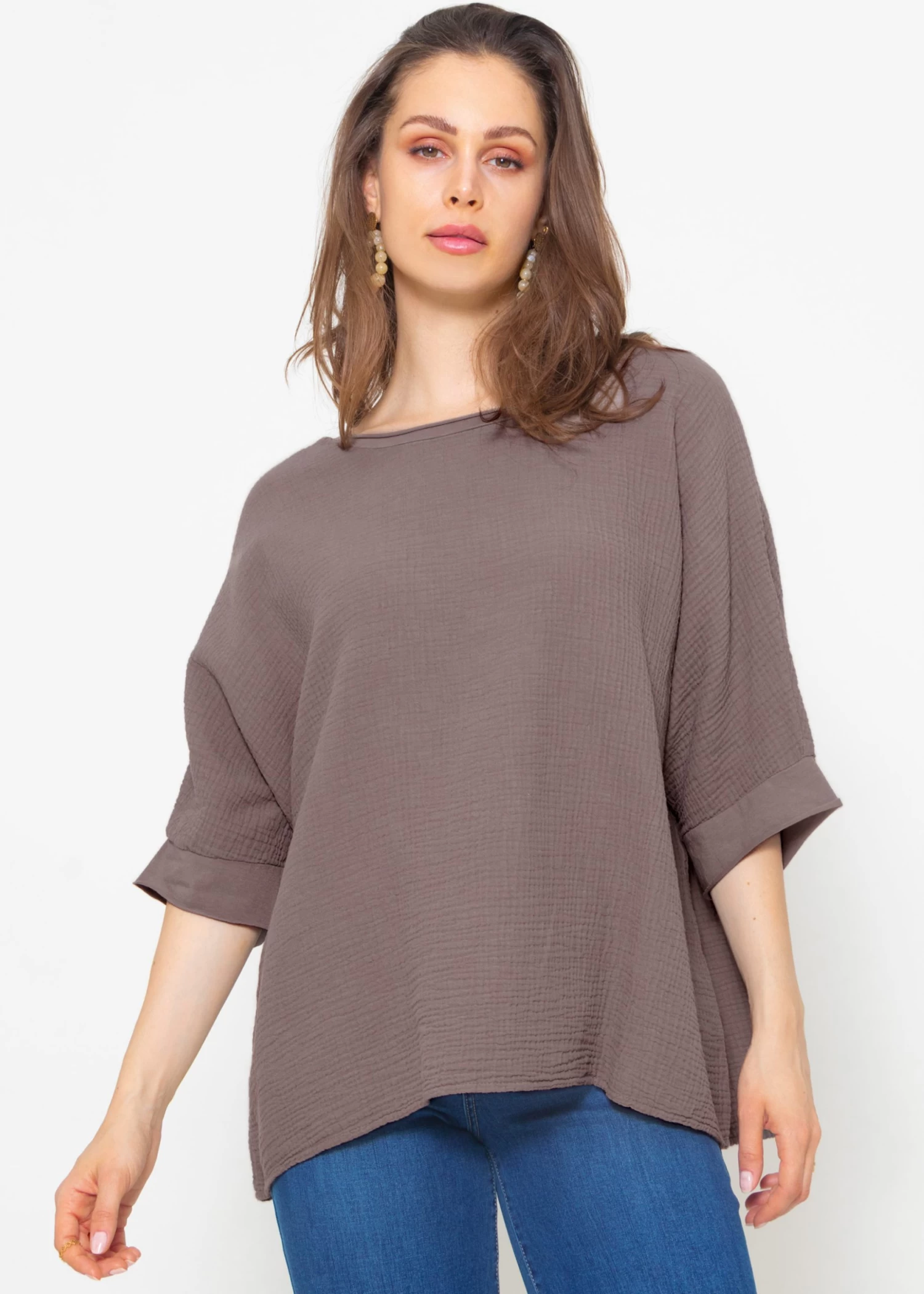 Das super coole Musselinshirt ist am Ausschnitt und an den Ärmeln mit farblich abgestimmten Jersey Blenden versehen und besitzt eine bequeme Oversize-Passform. Empfohlen bis Größe 44