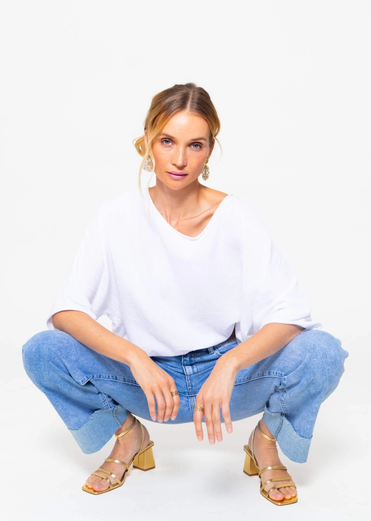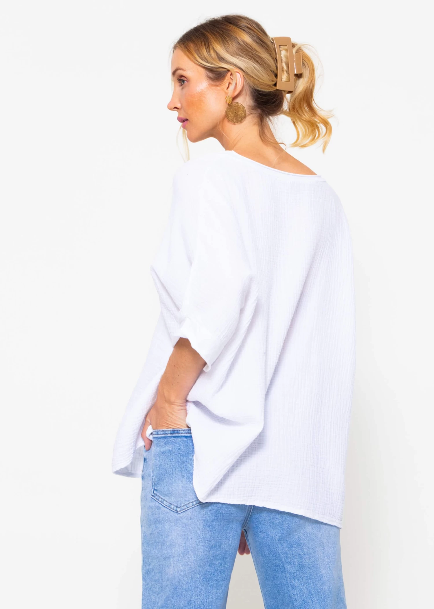 Das super coole Musselinshirt ist am Ausschnitt und an den Ärmeln mit farblich abgestimmten Jersey Blenden versehen und besitzt eine bequeme Oversize-Passform. Empfohlen bis Größe 44