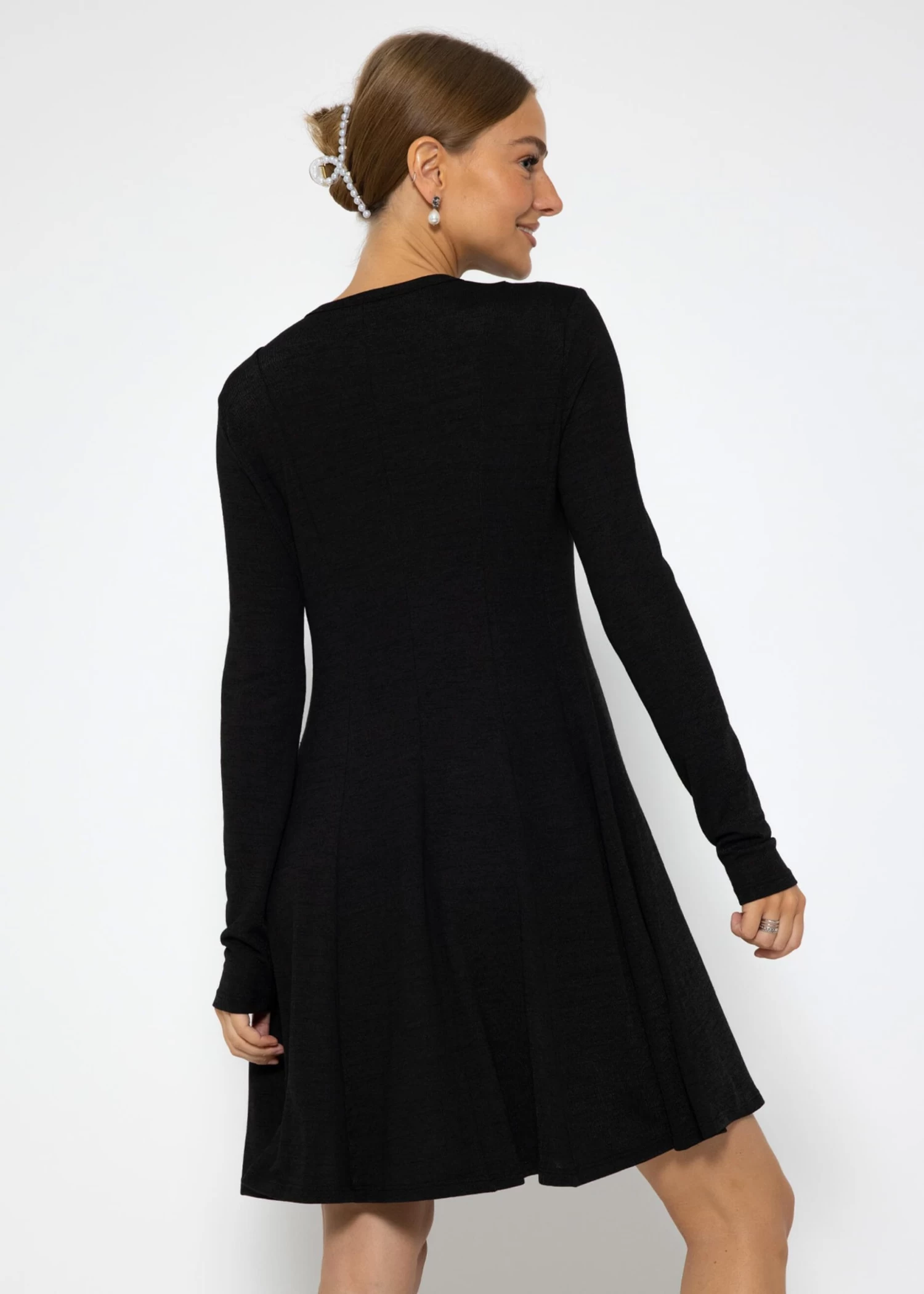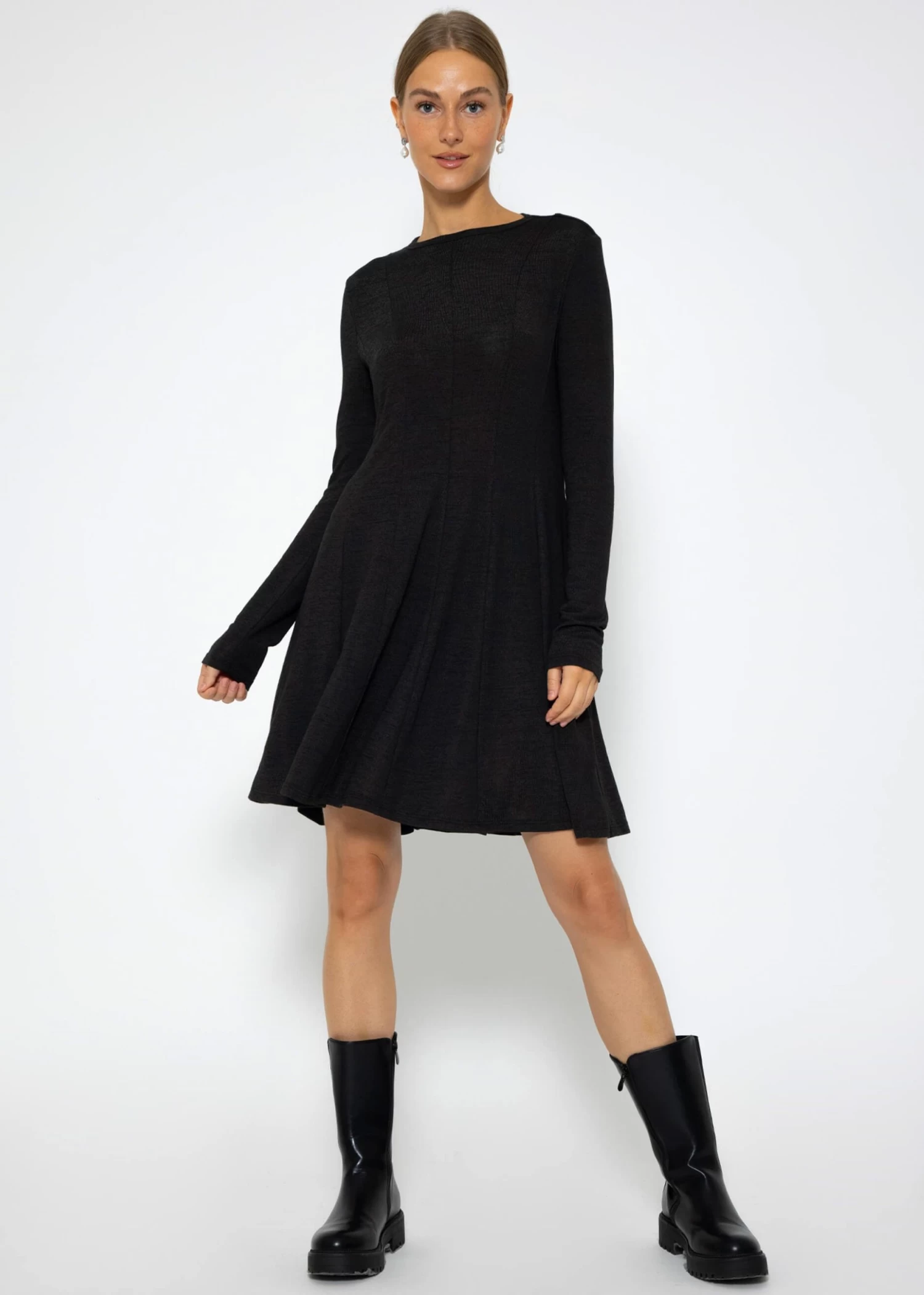 Entdecke den perfekten Kompromiss zwischen Komfort und Stil. Dieses weiche Jerseykleid besitzt eine kurze Länge, einen Rundhalsausschnitt sowie lange Ärmel. Das Modell verfügt über schmeichelhafte Teilungsnähte, die deine Silhouette vorteilhaft betonen und zusätzlich eine modische Note sowie Struktur verleihen. Das Kleid zeichnet sich durch seine oben anliegende und nach unten hin ausgestellte Passform aus, die Bewegungsfreiheit und Bequemlichkeit garantiert, ohne dabei auf Eleganz zu verzichten. Trage das Kleid Solo oder mit einem schicken Cardigan oder einer coolen Jacke.