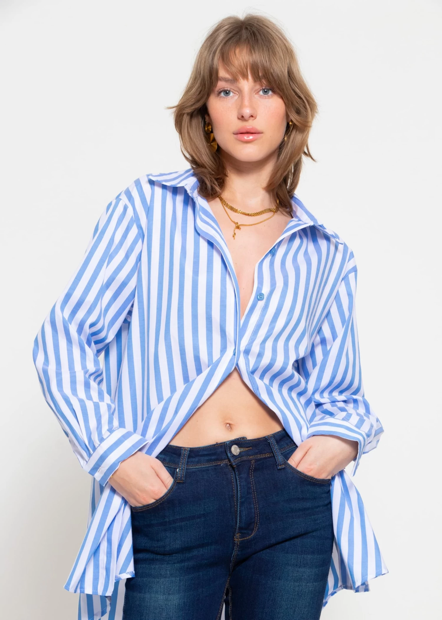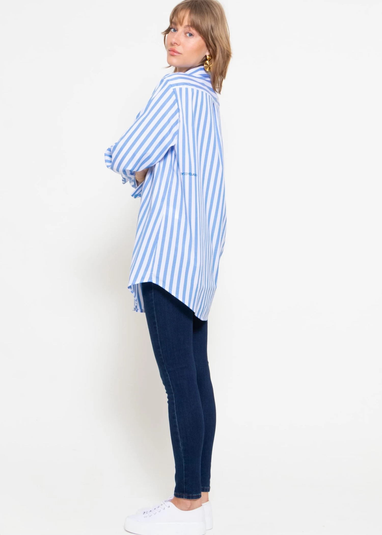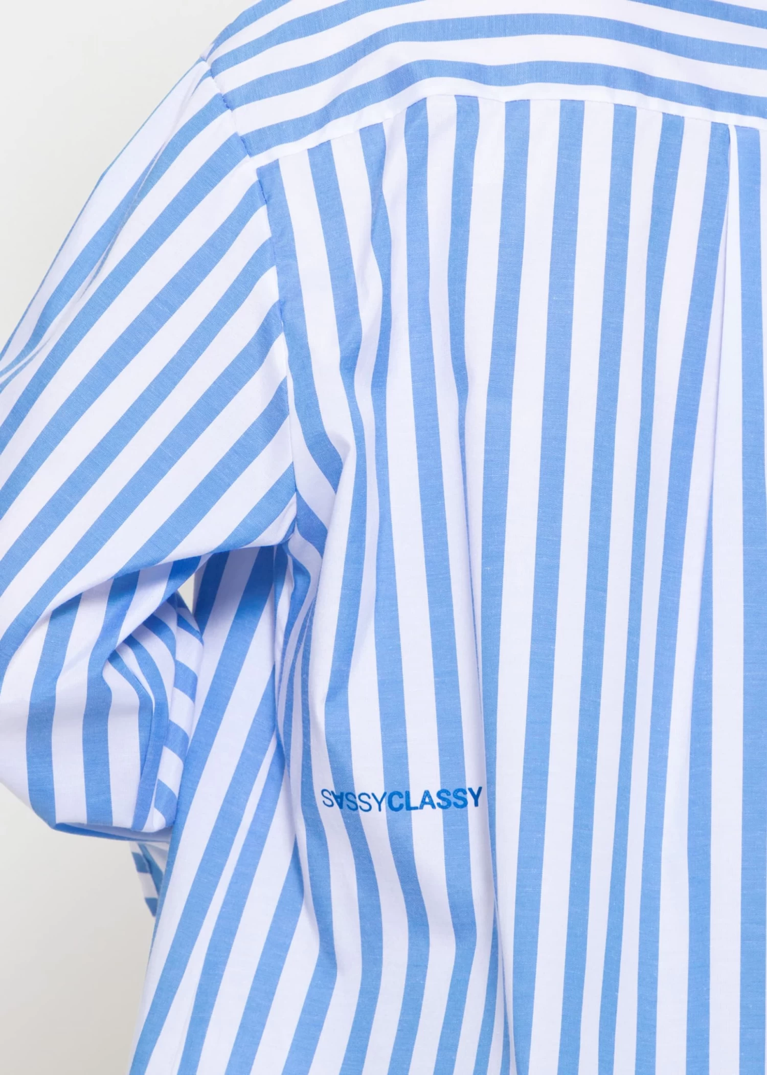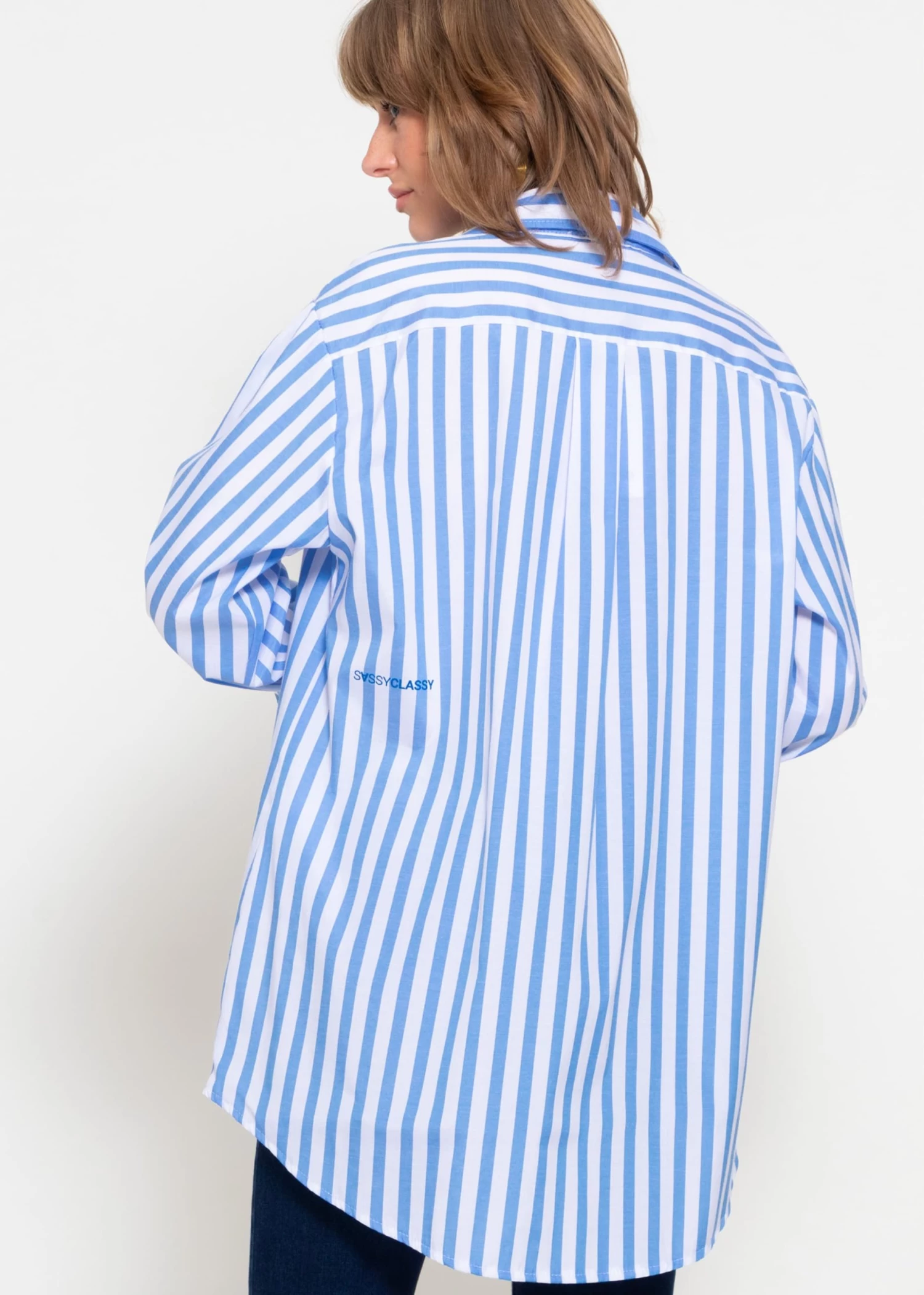 Diese Bluse ist aus einem hochwertigen Baumwollgemisch gefertigt und bietet einen angenehmen Tragekomfort, ideal für den Alltag oder das Büro. Das auffällige Streifendesign in Blau und Weiß verleiht dem Kleidungsstück einen zeitlosen Look, der nie aus der Mode kommt. Kragen und Manschetten sind sorgfältig verarbeitet und sorgen für einen gepflegten Look. Ein besonderes Detail ist der dezente Logo-Print „SASSYCLASSY“ am Rücken, der die Bluse unverwechselbar macht. Die Knopfleiste ist mit gebrandeten, blauen Knöpfen versehen, die sich harmonisch in das Gesamtbild einfügen. Diese Bluse ist eine ausgezeichnete Wahl für alle, die Wert auf Qualität und Stil legen.