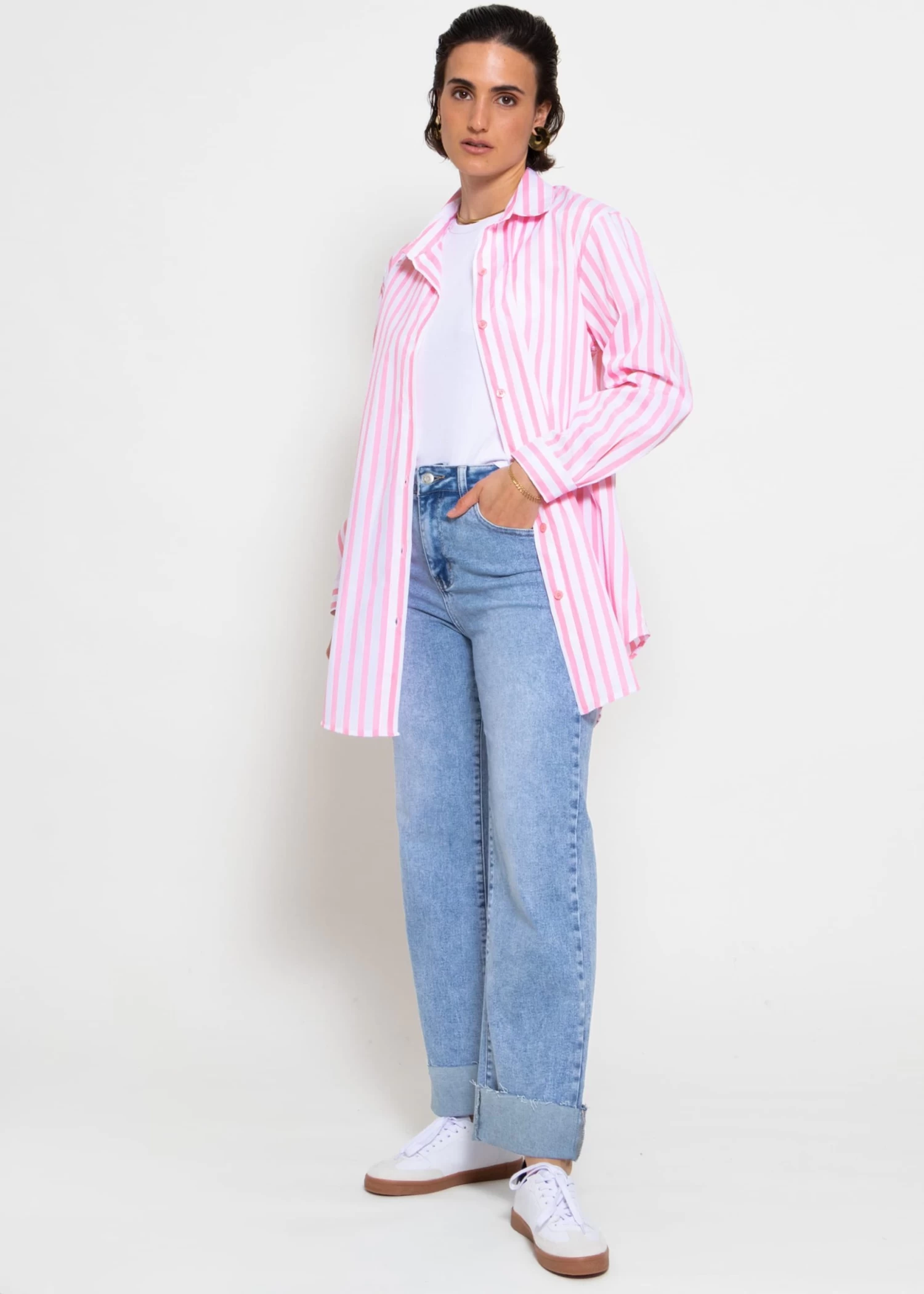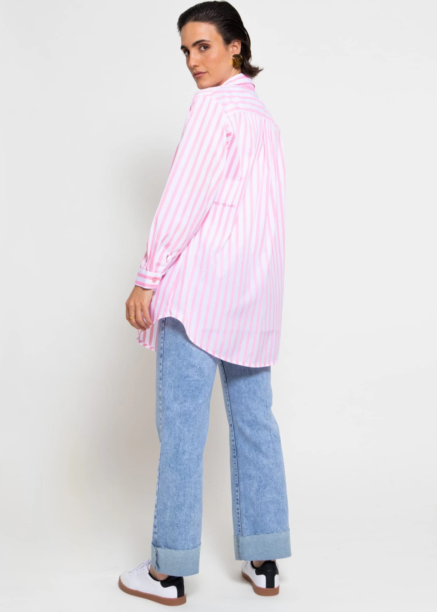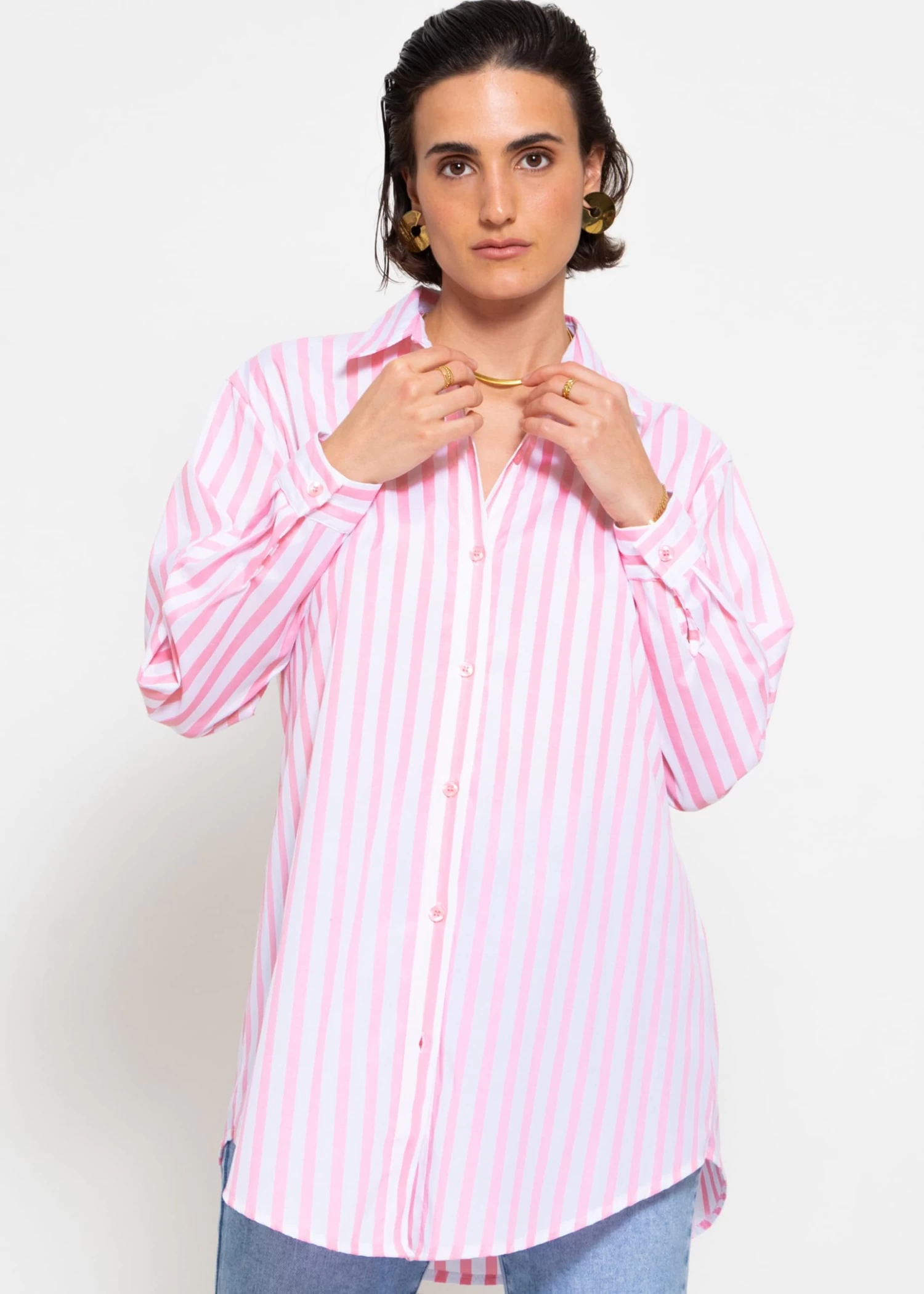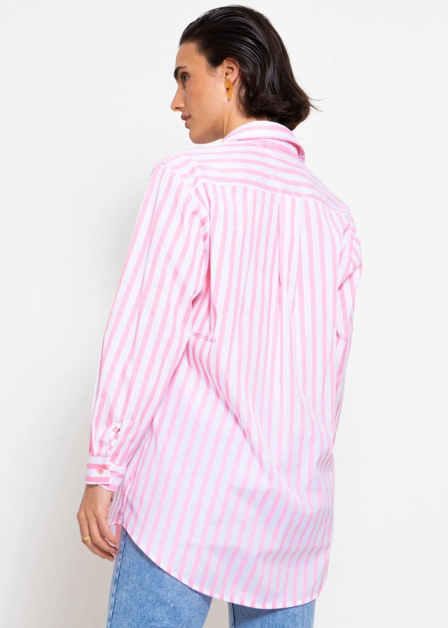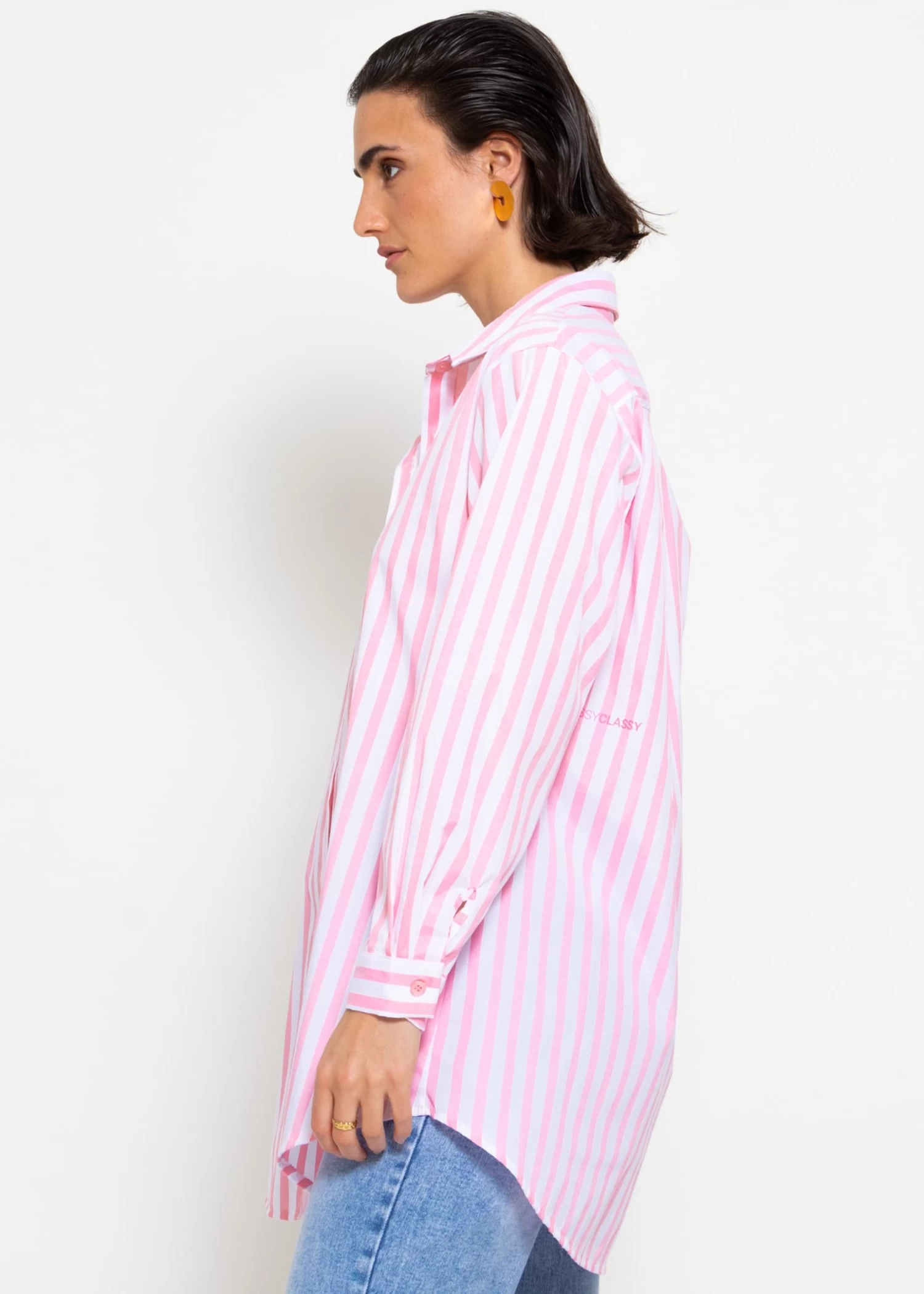 Langes, gestreiftes Blusenhemd mit Logo-Print in Rosa