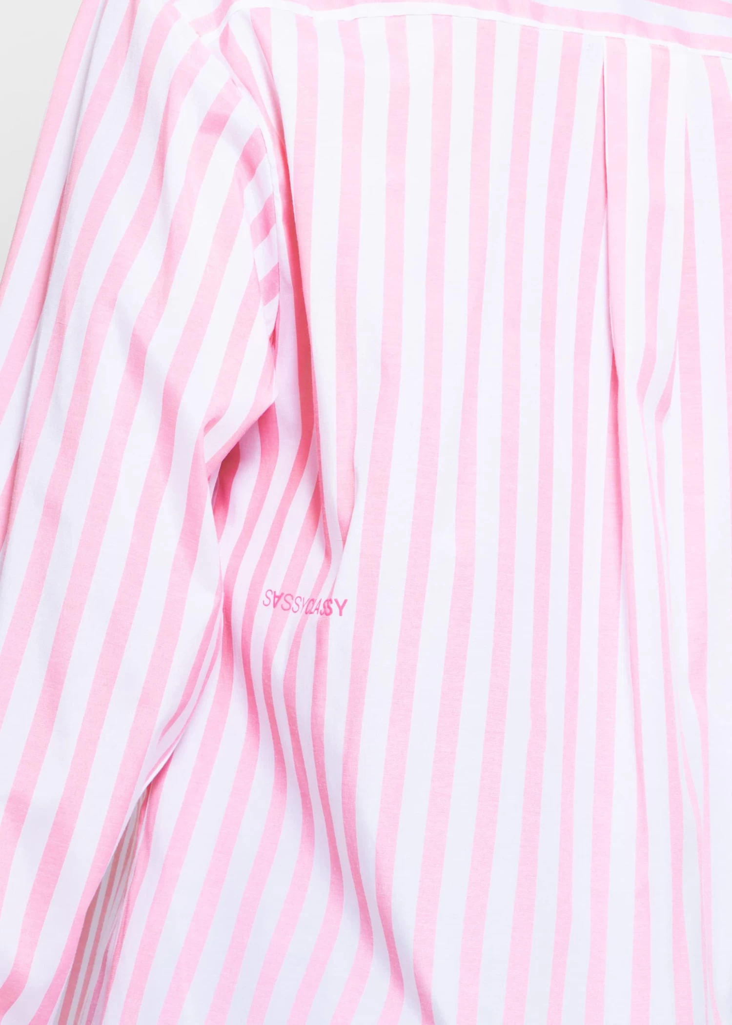 Diese Bluse ist aus einem hochwertigen Baumwollgemisch gefertigt und bietet einen angenehmen Tragekomfort, ideal für den Alltag oder das Büro. Das auffällige Streifendesign in Rosa und Weiß verleiht dem Kleidungsstück einen zeitlosen Look, der nie aus der Mode kommt. Kragen und Manschetten sind sorgfältig verarbeitet und sorgen für einen gepflegten Look. Ein besonderes Detail ist der dezente Logo-Print „SASSYCLASSY“ am Rücken, der die Bluse unverwechselbar macht. Die Knopfleiste ist mit gebrandeten, rosa Knöpfen versehen, die sich harmonisch in das Gesamtbild einfügen. Diese Bluse ist eine ausgezeichnete Wahl für alle, die Wert auf Qualität und Stil legen.