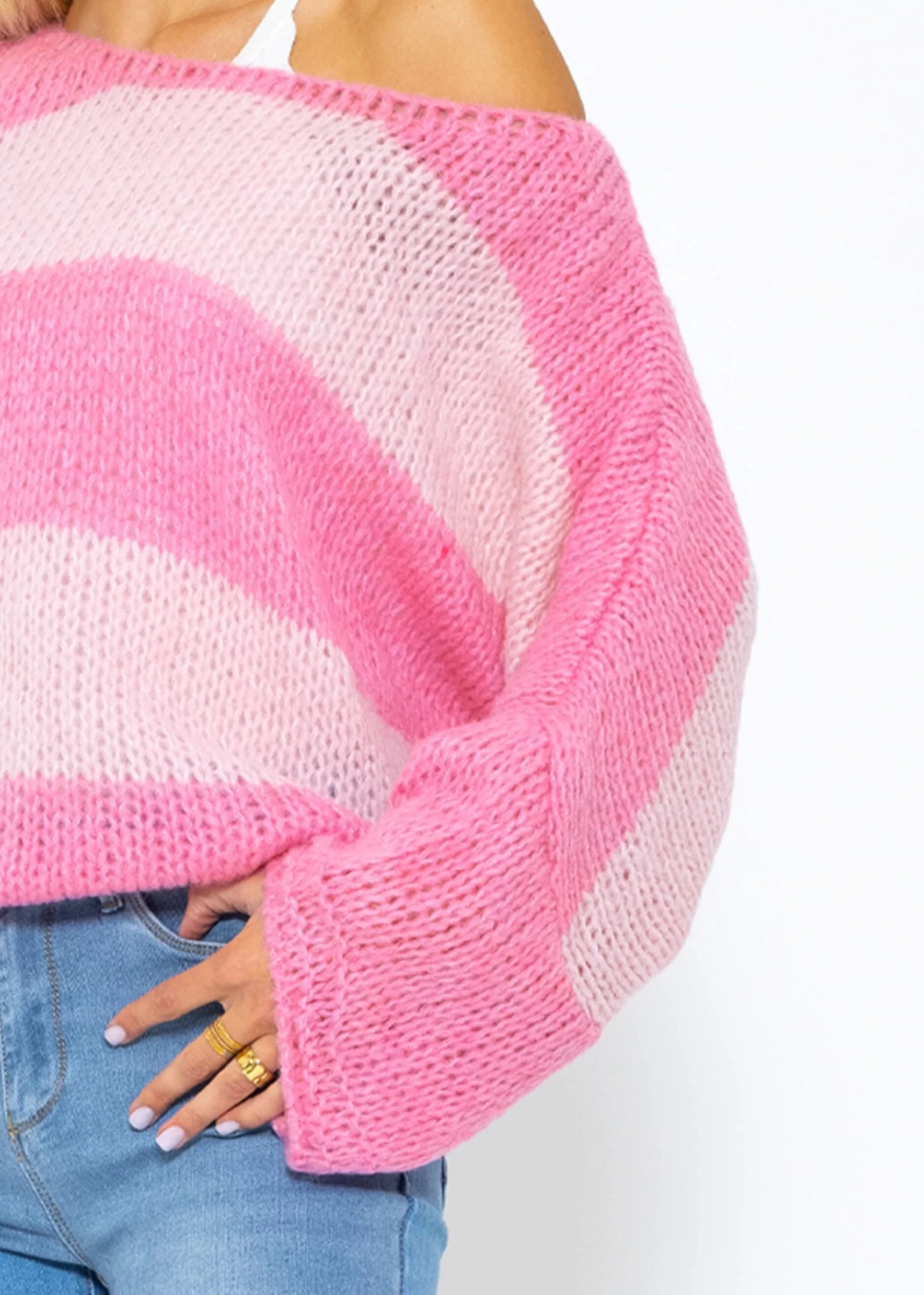 Oversize Pullover in Streifendesign aus weichem Strick. Der Pullover hat einen weiten Rundhals und angestrickte 3/4 lange Ärmel. Der Ärmelabschluss ist mit einer quergestrickten Blende betont. Der Pullover ist in mehreren Farbkombinationen erhältlich.