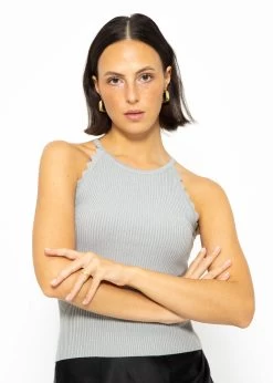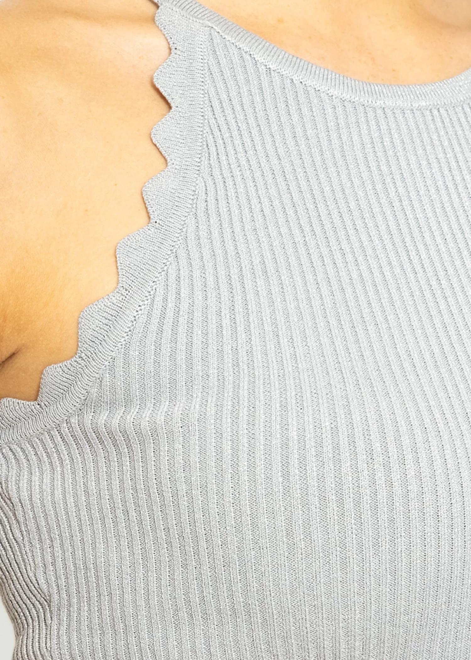 Dieses Stricktop ist eine funkelnde Ergänzung für deine Garderobe. Das Modell besitzt einen Rundhalsausschnitt, ein ärmelloses Design sowie schmale Träger. Highlight dieses Tops ist der glitzernde Lurex-Effekt, der dezent schimmert und das Licht einfängt, um dir bei jedem Anlass einen Hauch von Glamour zu verleihen. Die Bogenkante am Armausschnitt fügt einen femininen Touch hinzu und sorgt für eine verspielte Note.