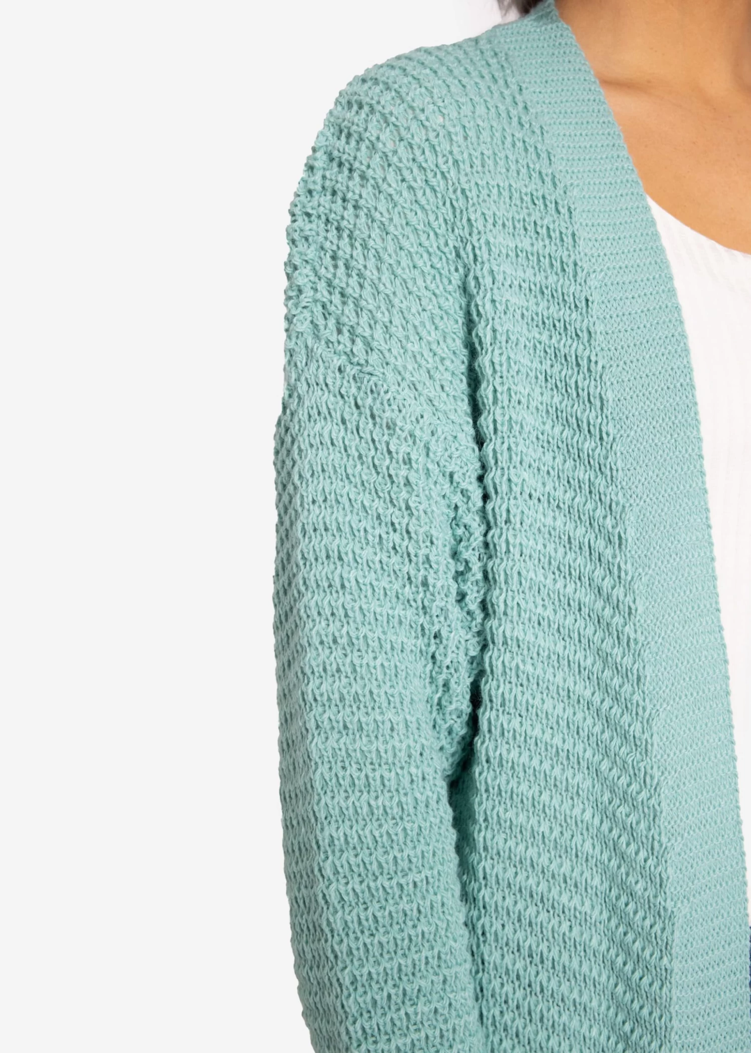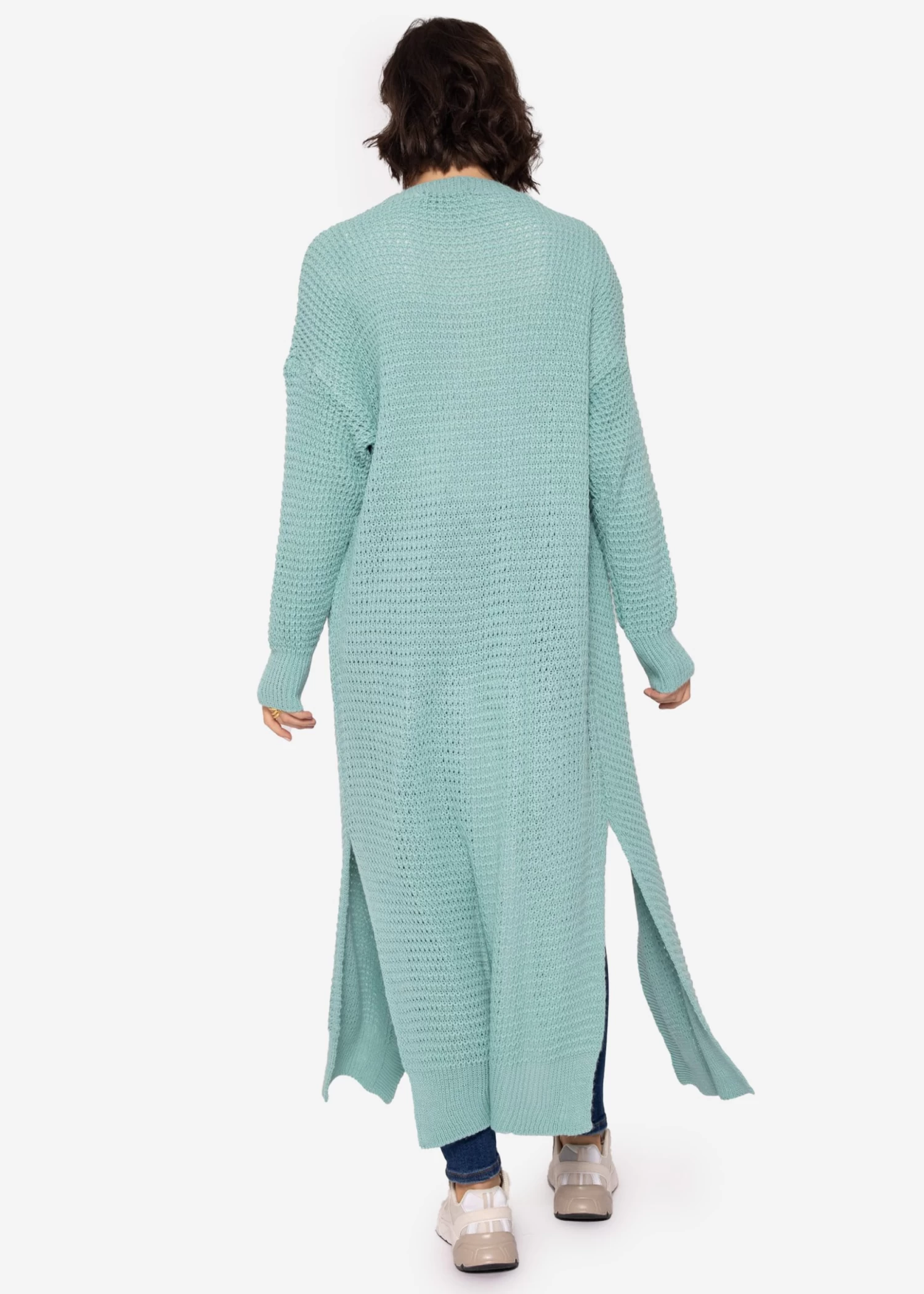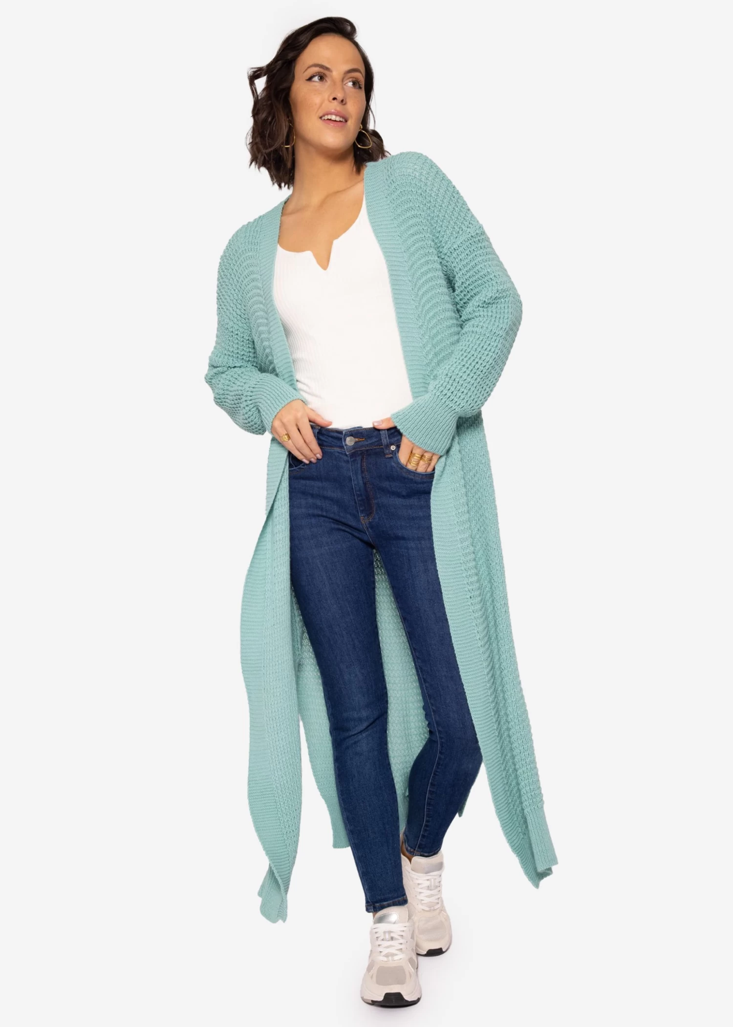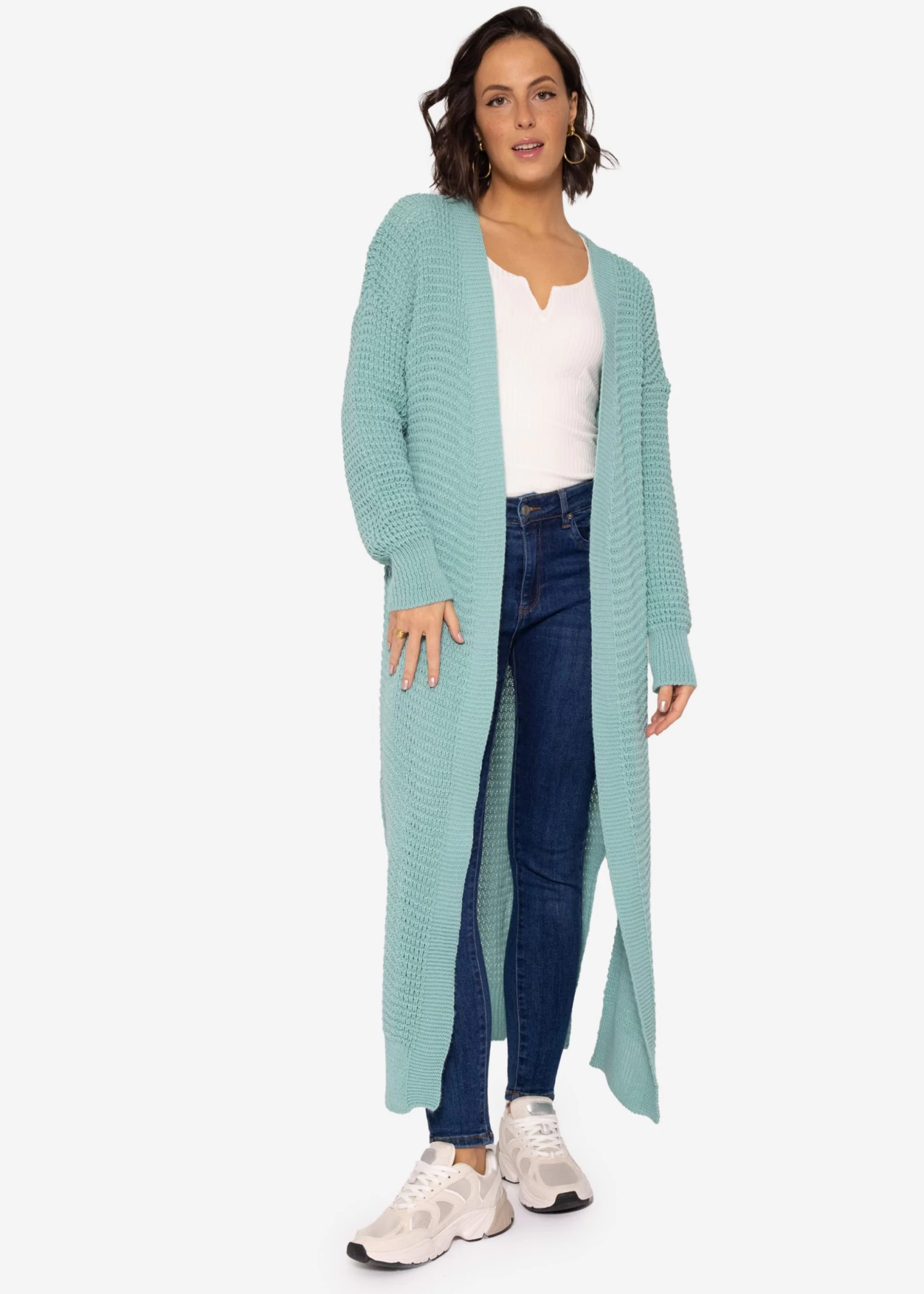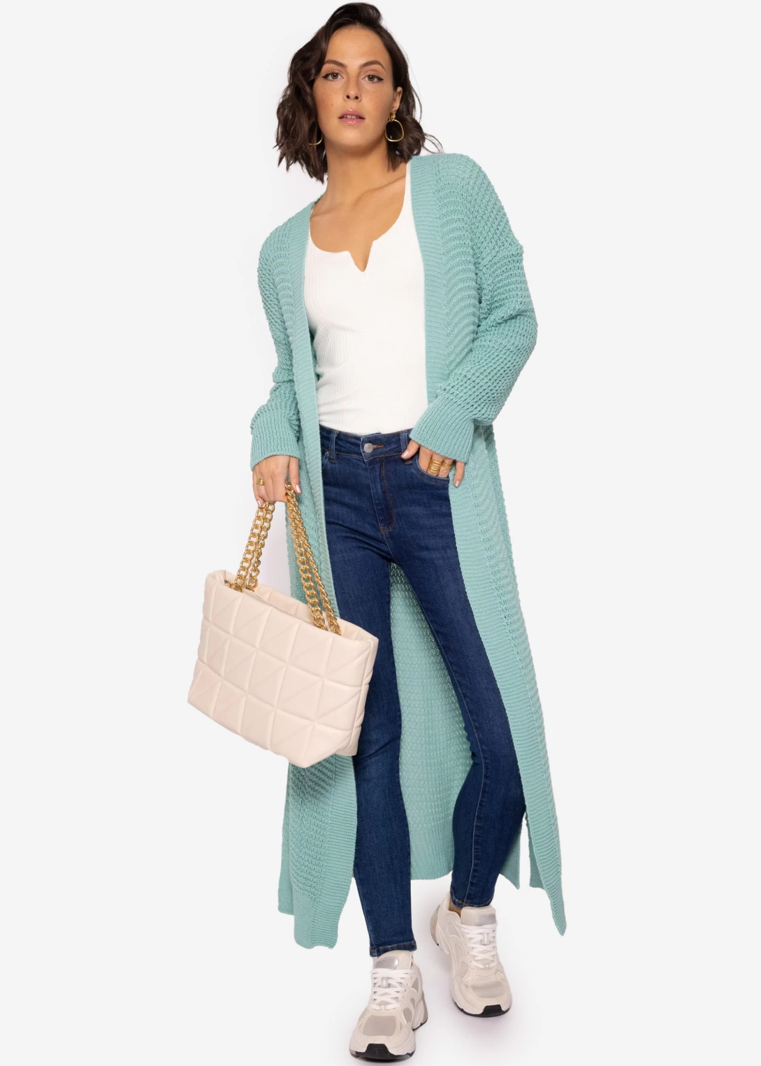 Offen fallender, langer Cardigan in Türkis, der dir ein perfekter Alltags-Begleiter für lässige Looks werden wird. Hohe Seitenschlitze geben dem Maxi Cardigan die individuelle Note.