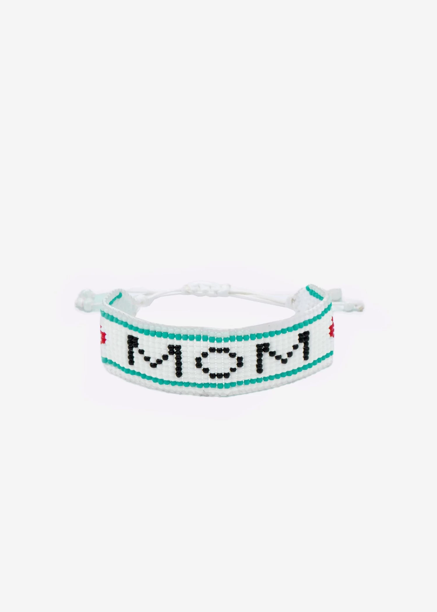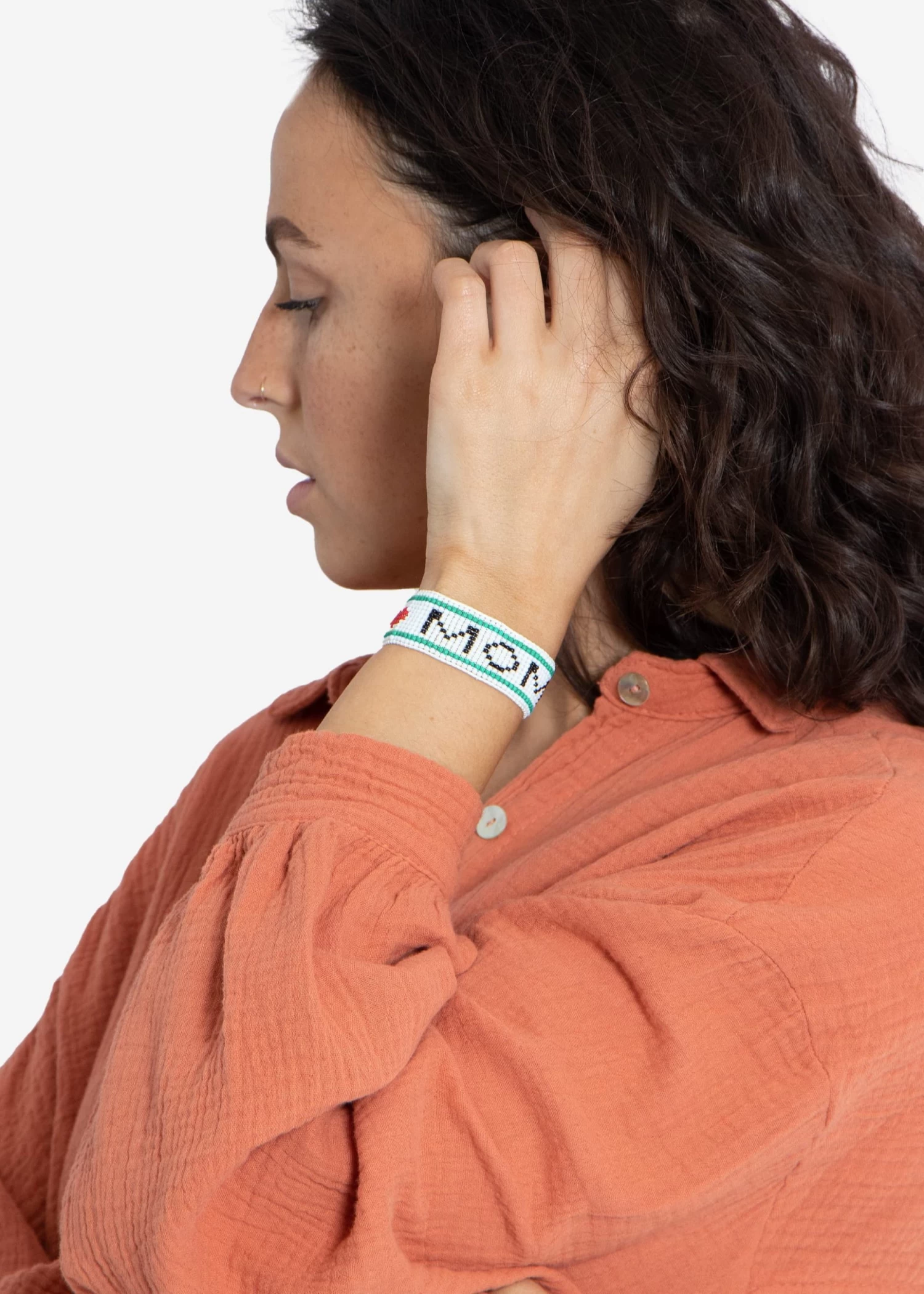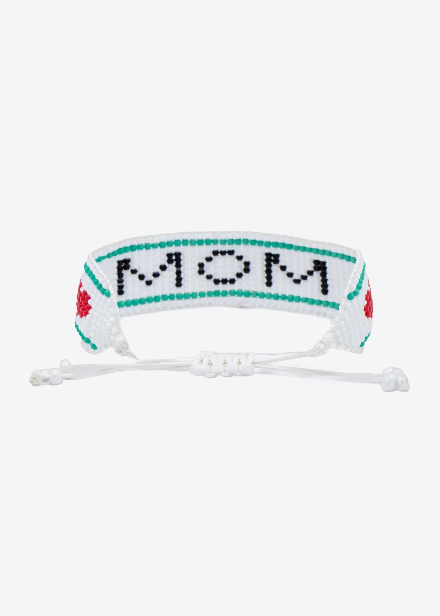 Armband aus Perlchen. In der Mitte sind das Wort „MOM“ und zwei Herzen eingearbeitet. Es ist mit einem chinesischen Knotenabschluss zu schließen und ist individuell verstellbar.